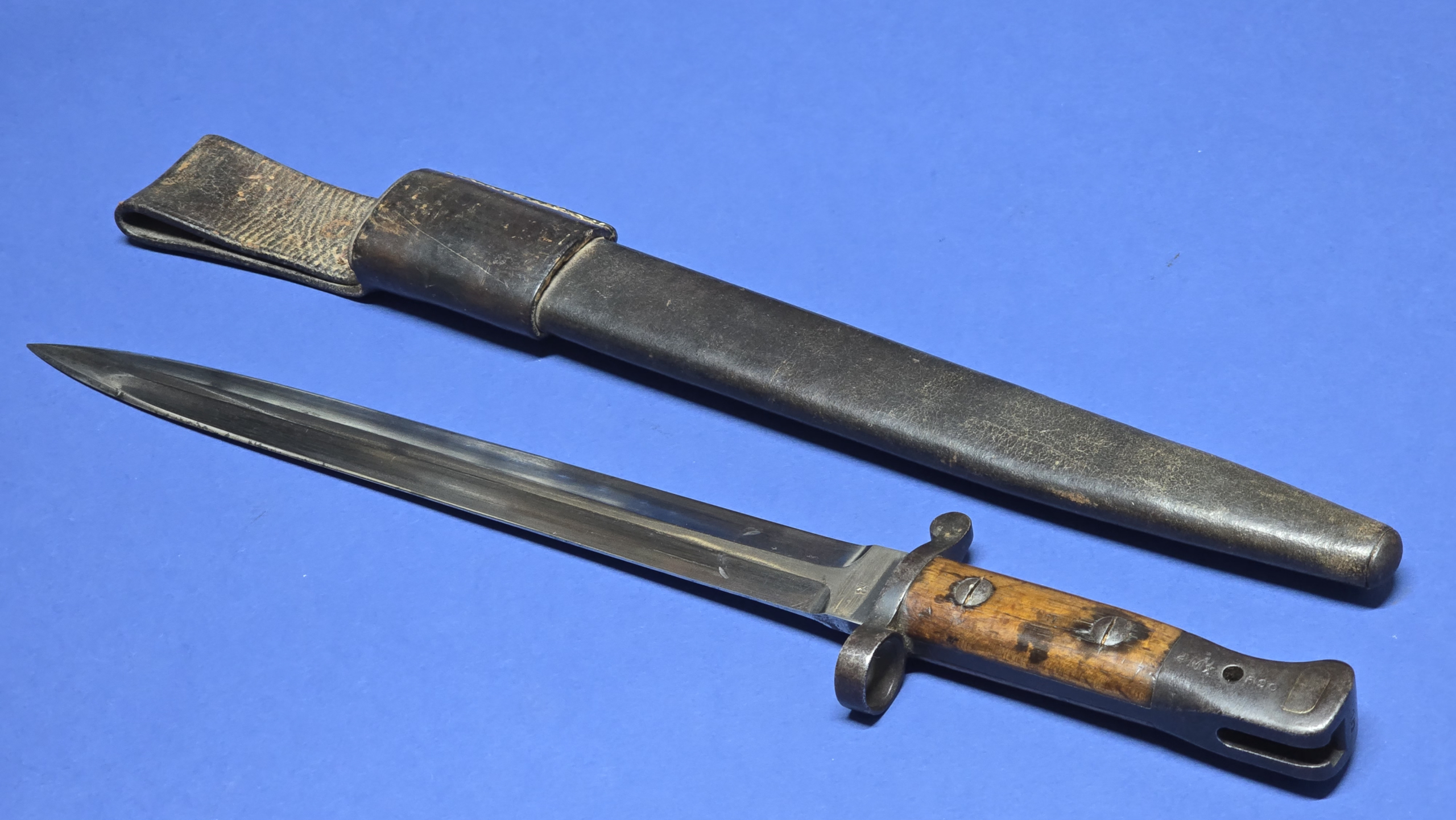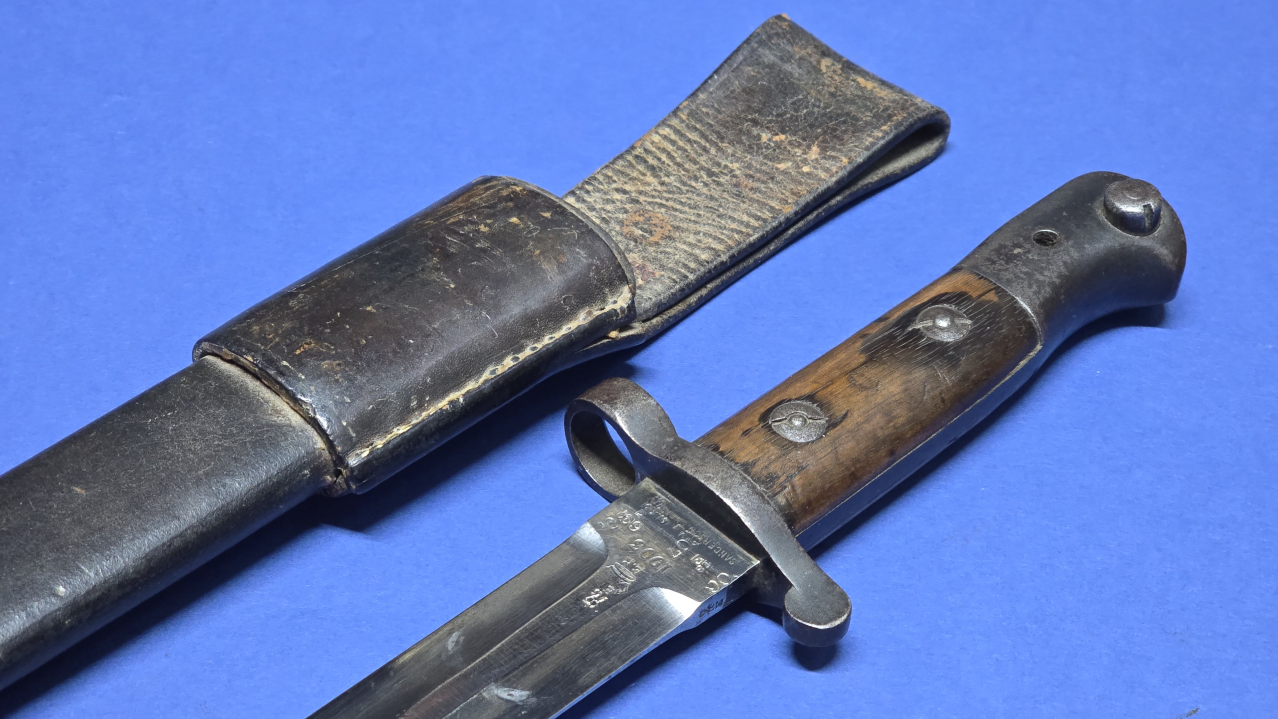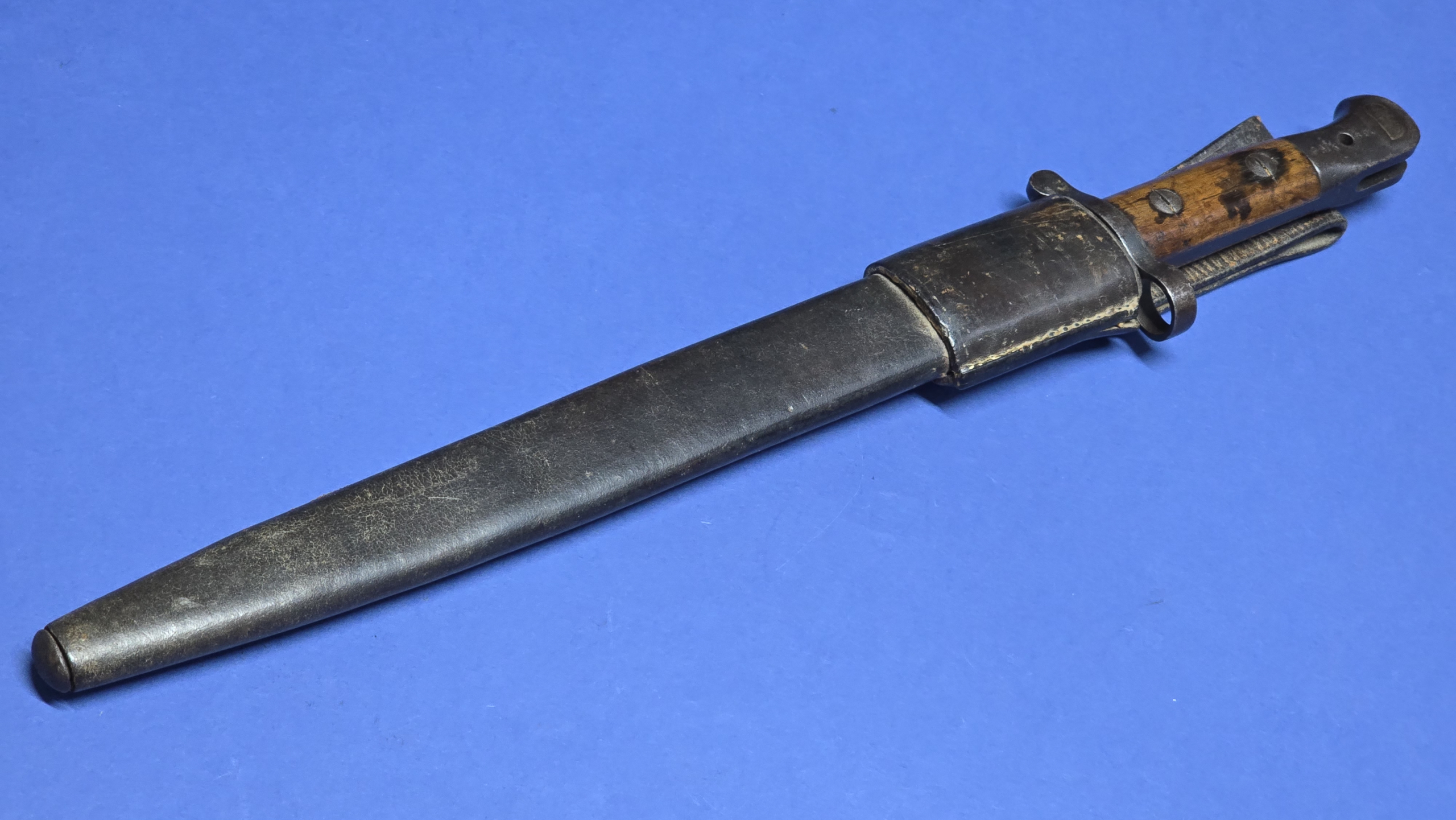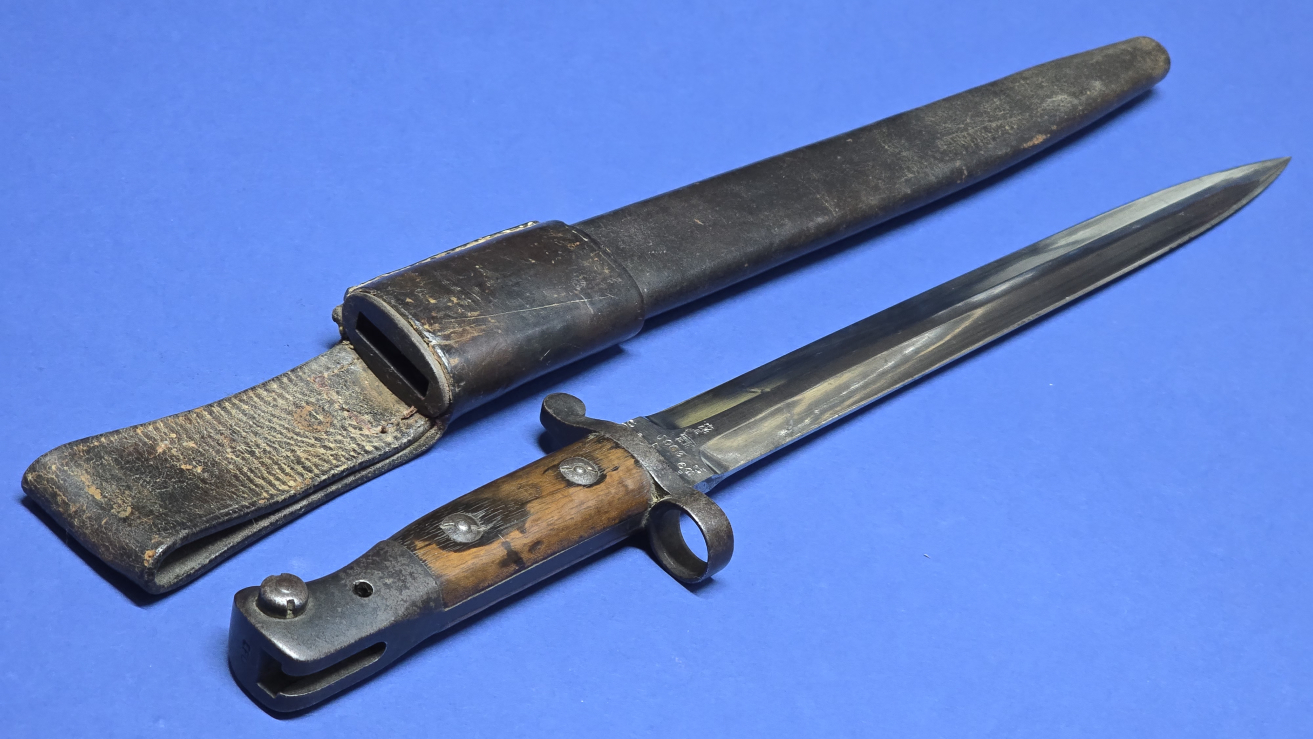 The full leather scabbard remains in very good condition with tight stitching throughout. The metal chape is present to the lower tip and displays the broad arrow mark. Further markings are present to the rear seam area, but are faint (see photos).The scabbard retains good structure and shape and the bayonet fits correctly with a satisfying, secure fit.