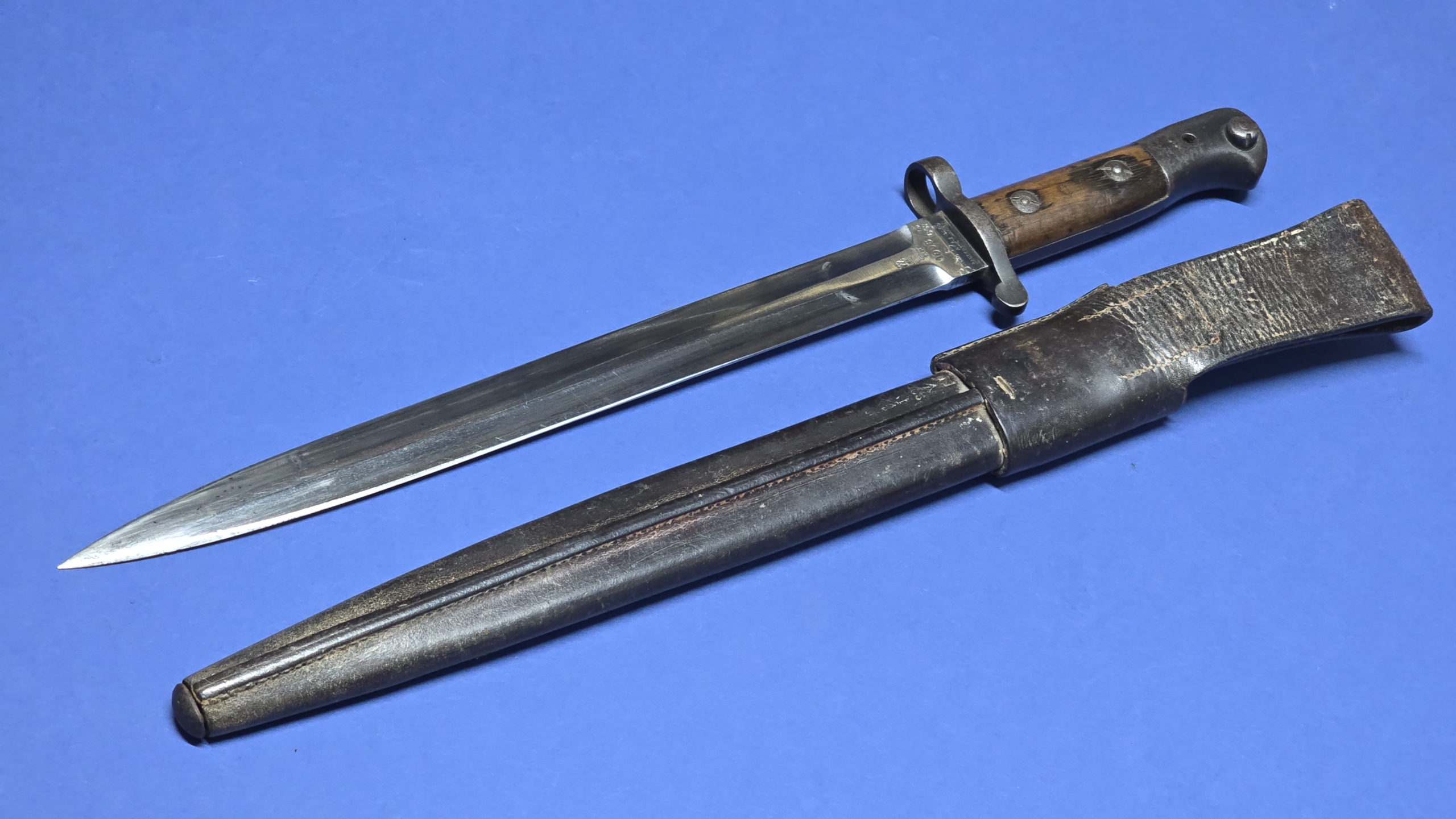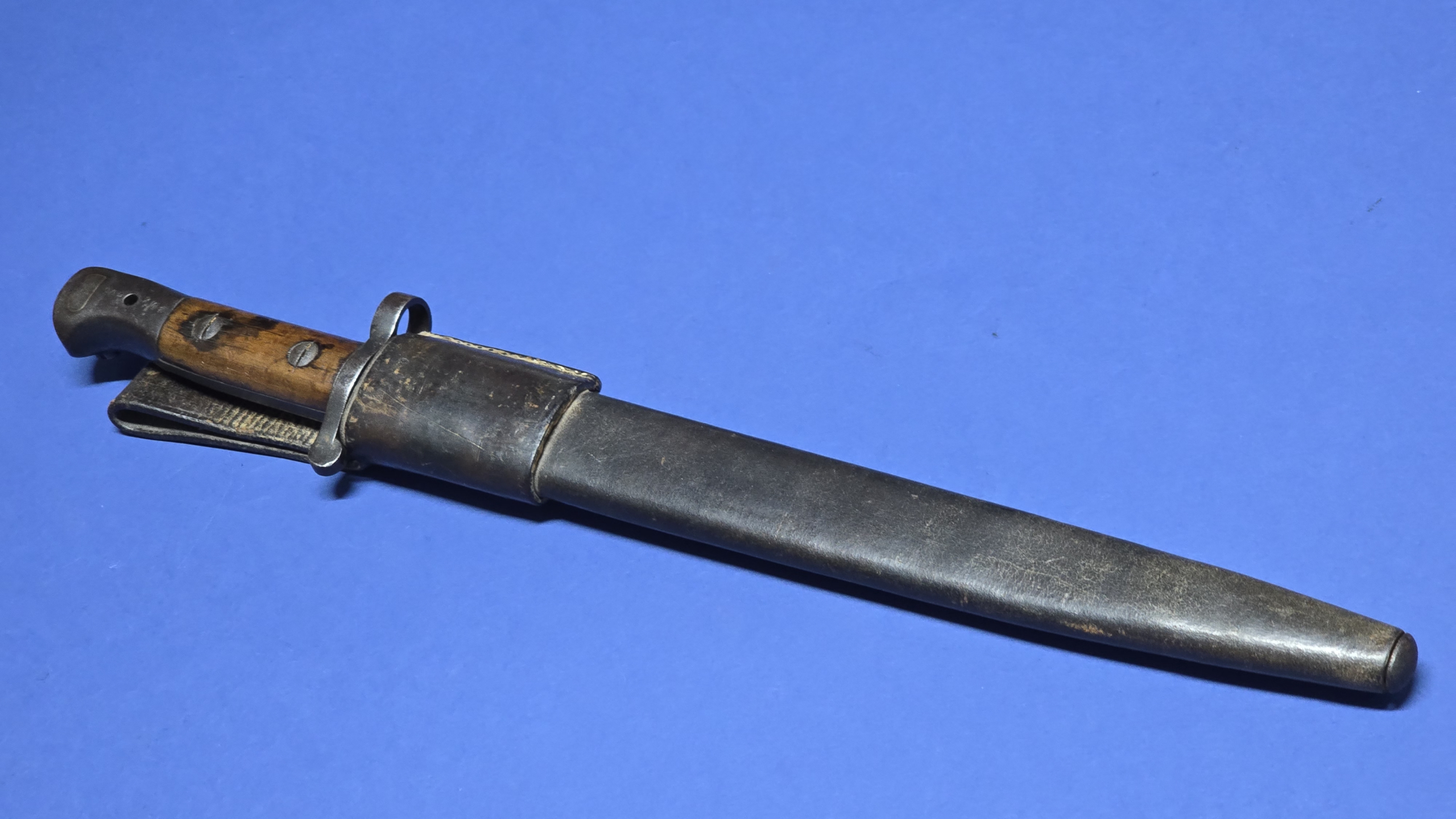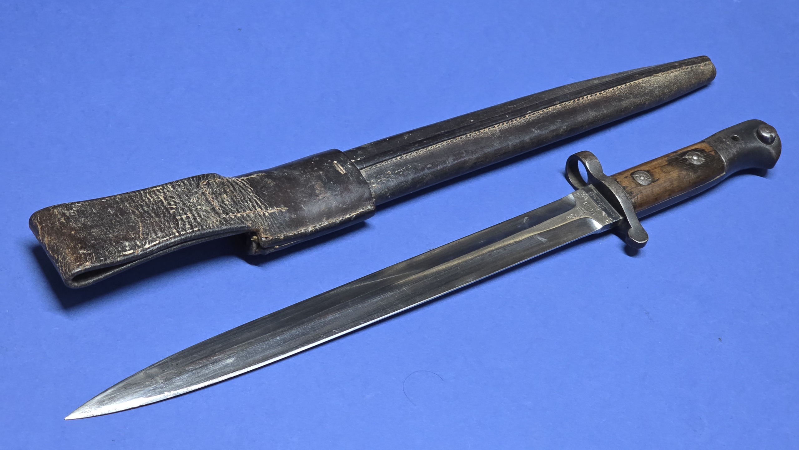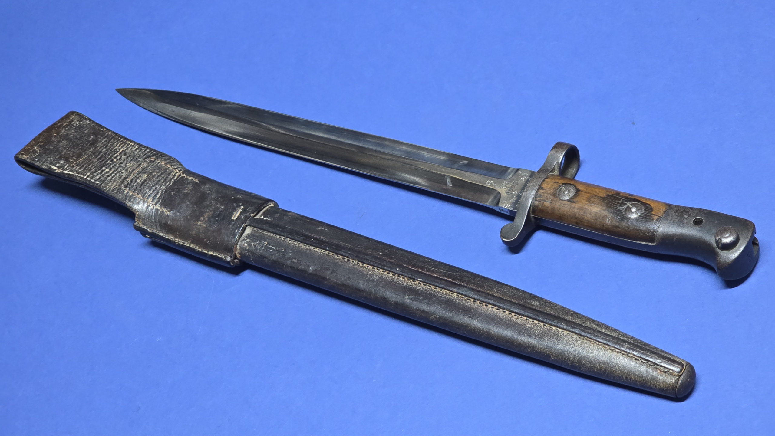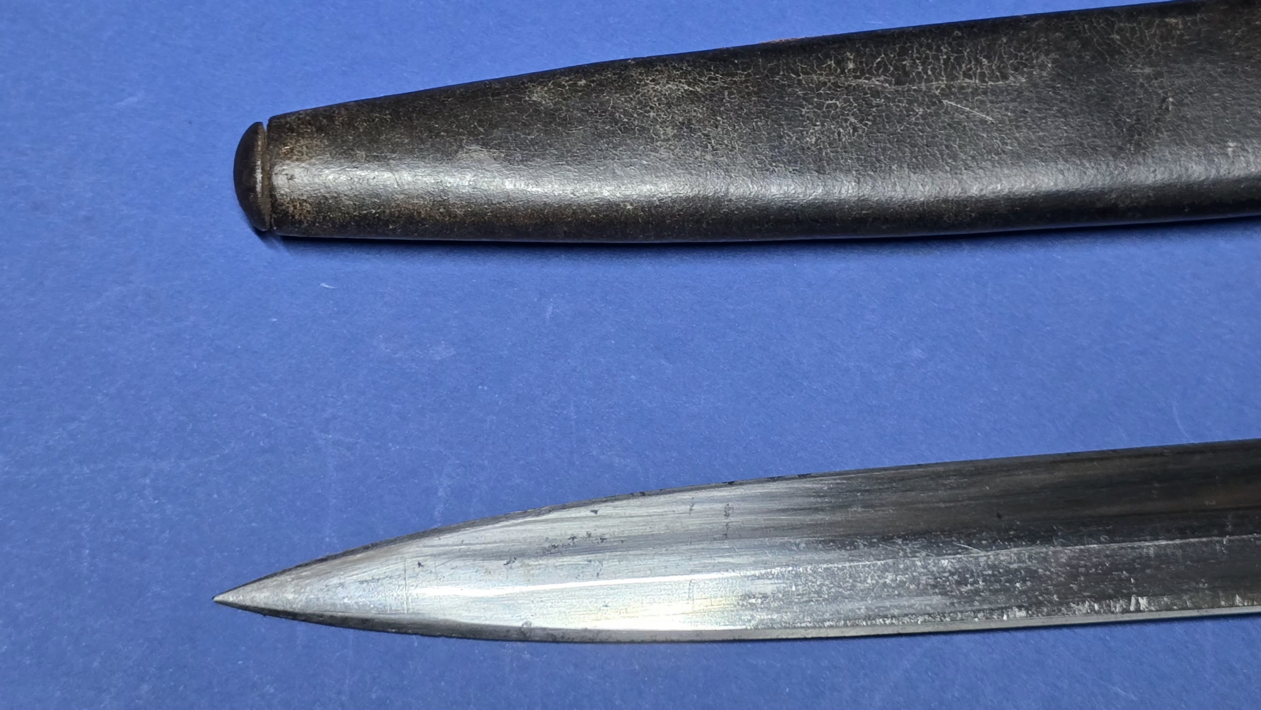 The full leather scabbard remains in very good condition with tight stitching throughout. The metal chape is present to the lower tip and displays the broad arrow mark. Further markings are present to the rear seam area, but are faint (see photos).The scabbard retains good structure and shape and the bayonet fits correctly with a satisfying, secure fit.