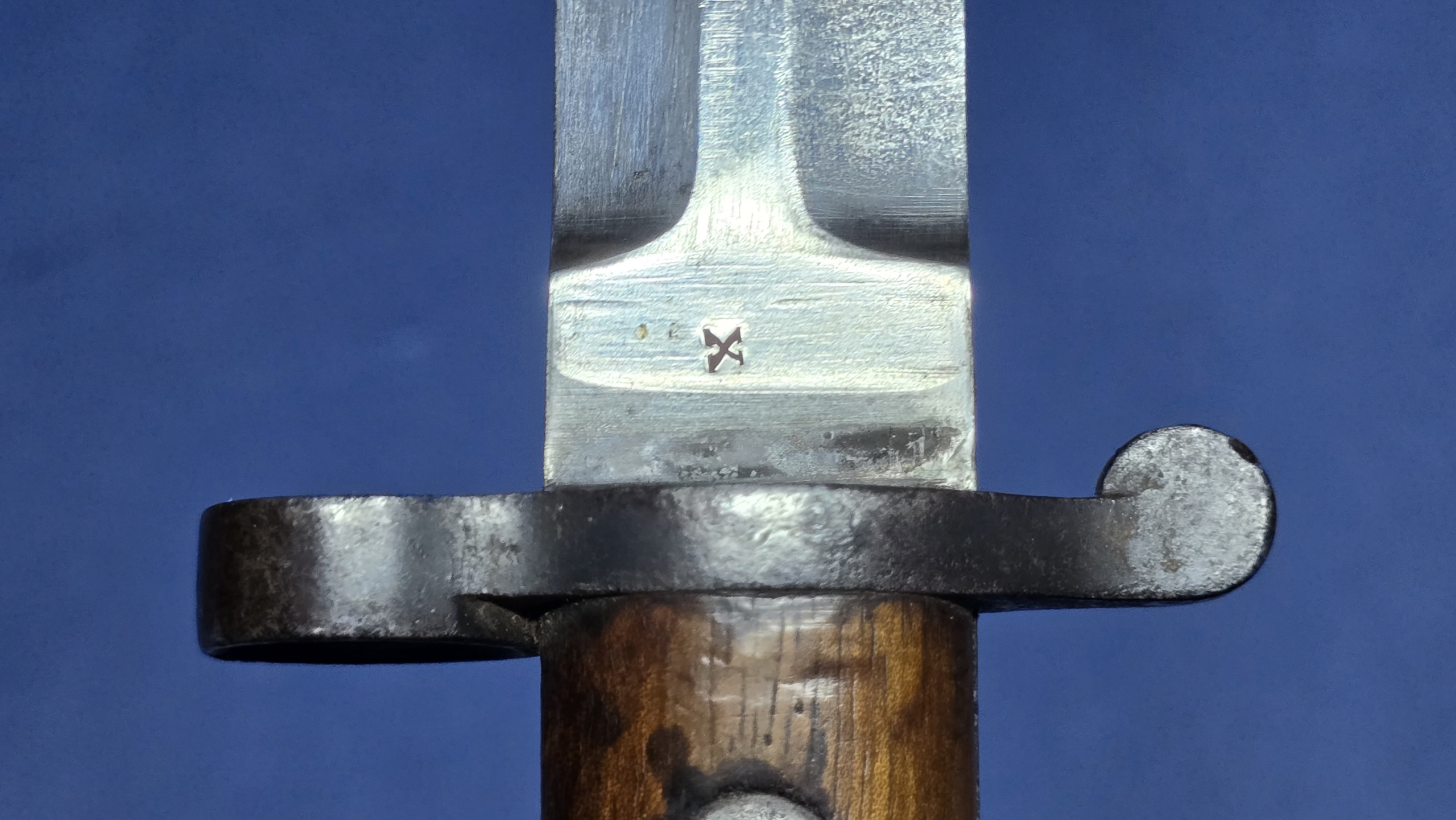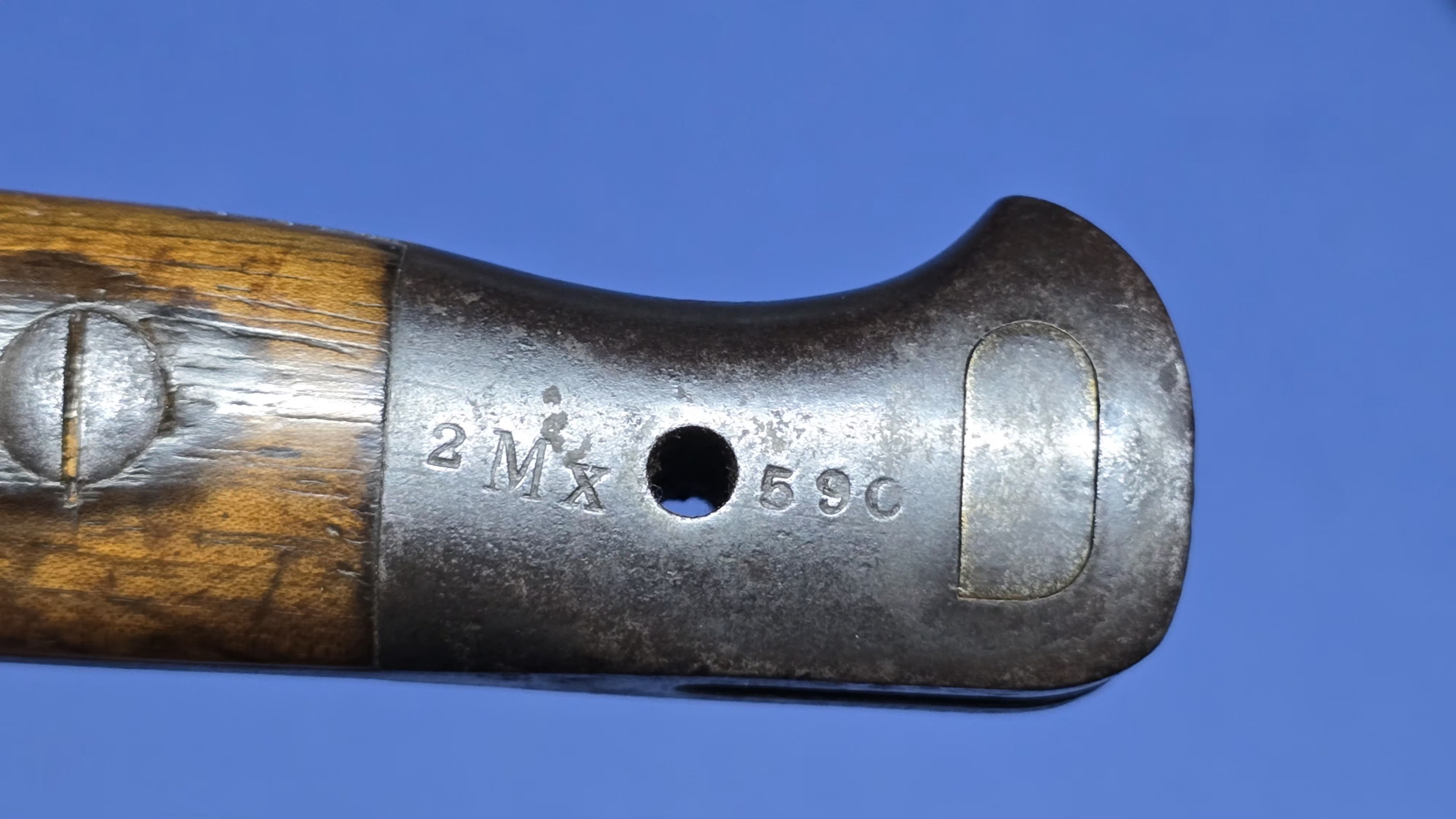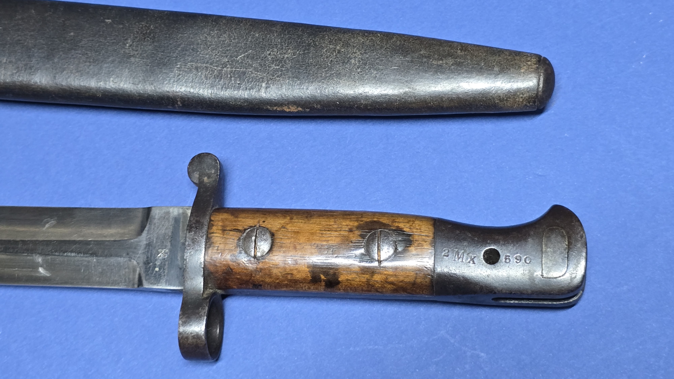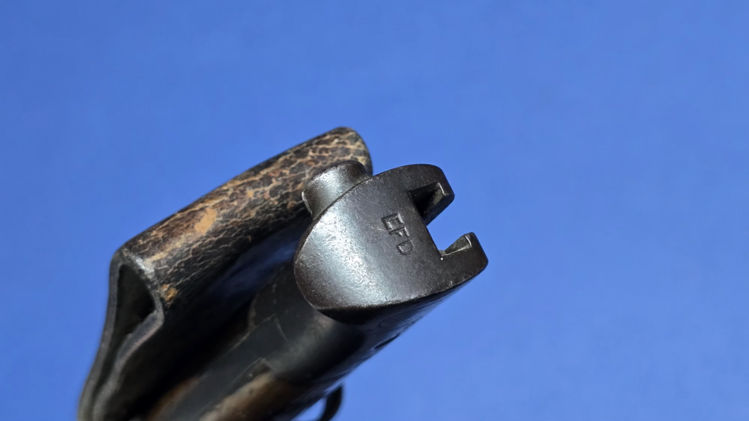 The wooden grips are original and in excellent condition, secured with their correct screw bolts. The oil hole is present to the top of the grip, and the rifle retaining button is fully functional. The pommel is clearly regimentally stamped 2 Mx 590, interpreted as 2nd Battalion, Middlesex Regiment. Always nice to see regimental markings, as it leaves an option for further research. An additional factory marking is present on top of the pommel (EFD), this refers to (Enfield Factory Designation) indicating that the bayonet was manufactured, repaired, or converted at the Royal Small Arms Factory Enfield.