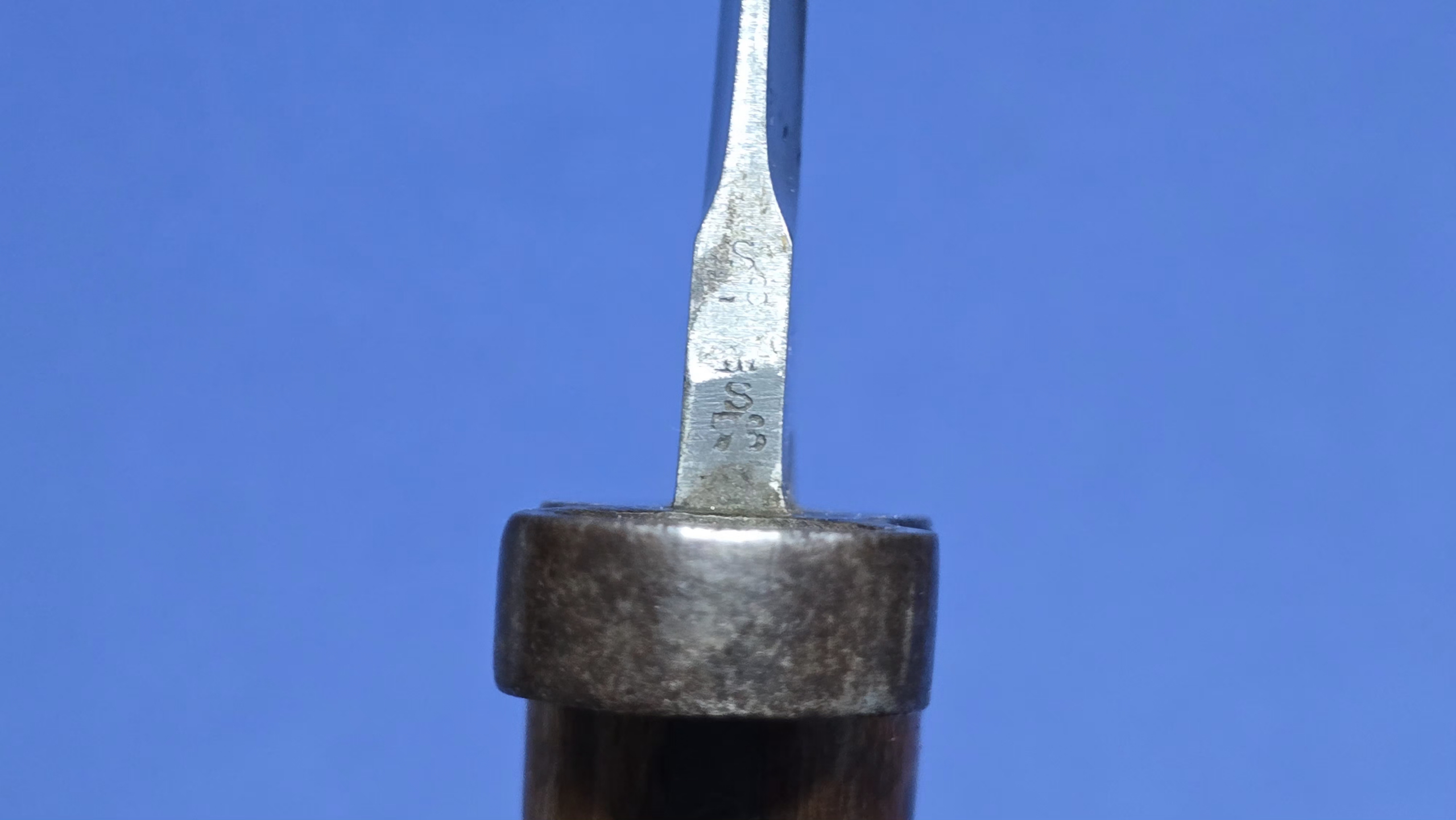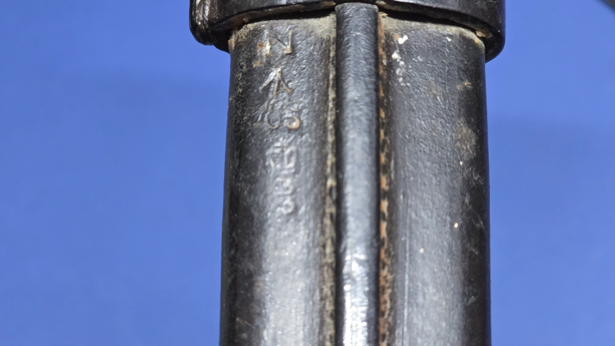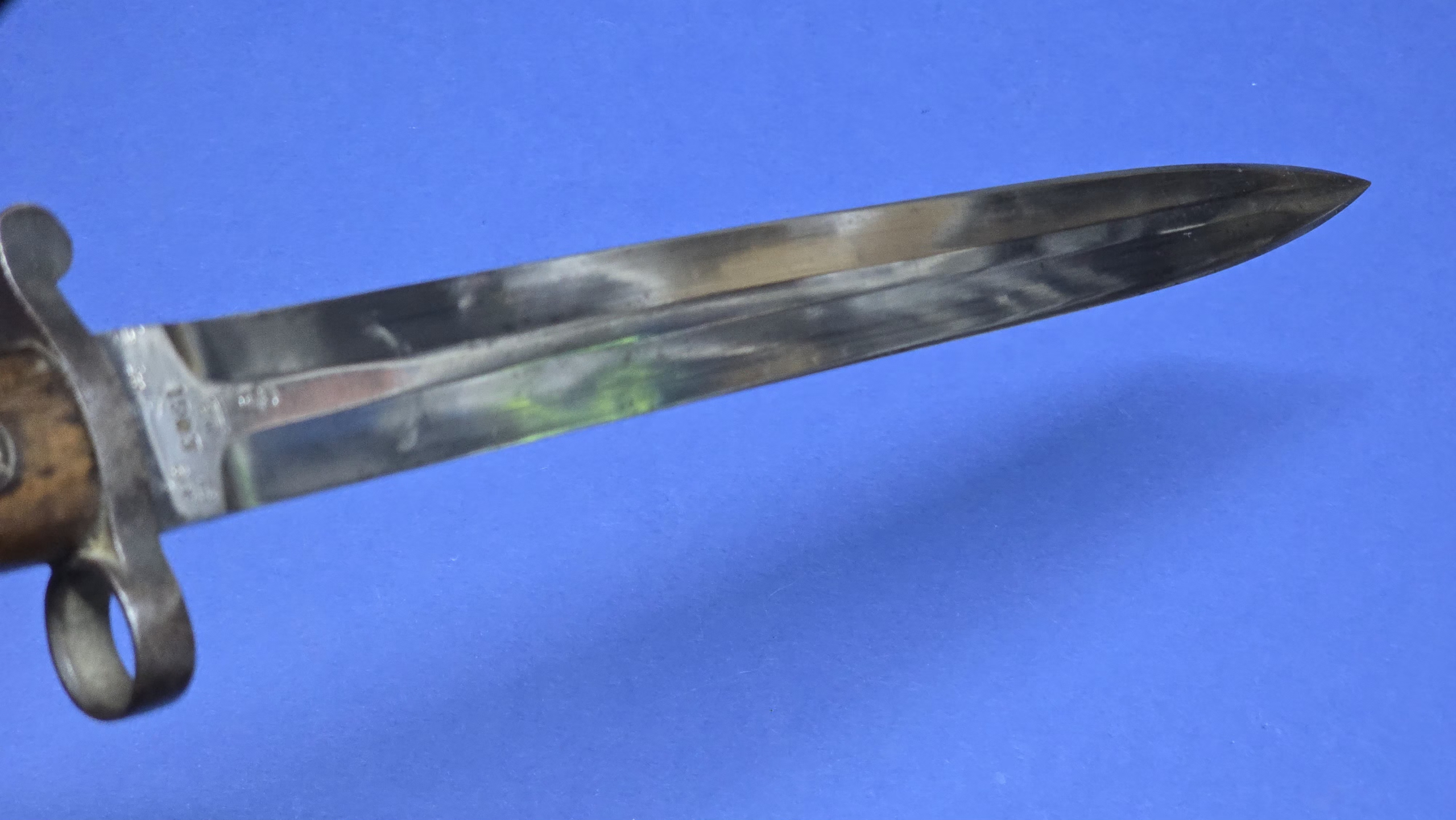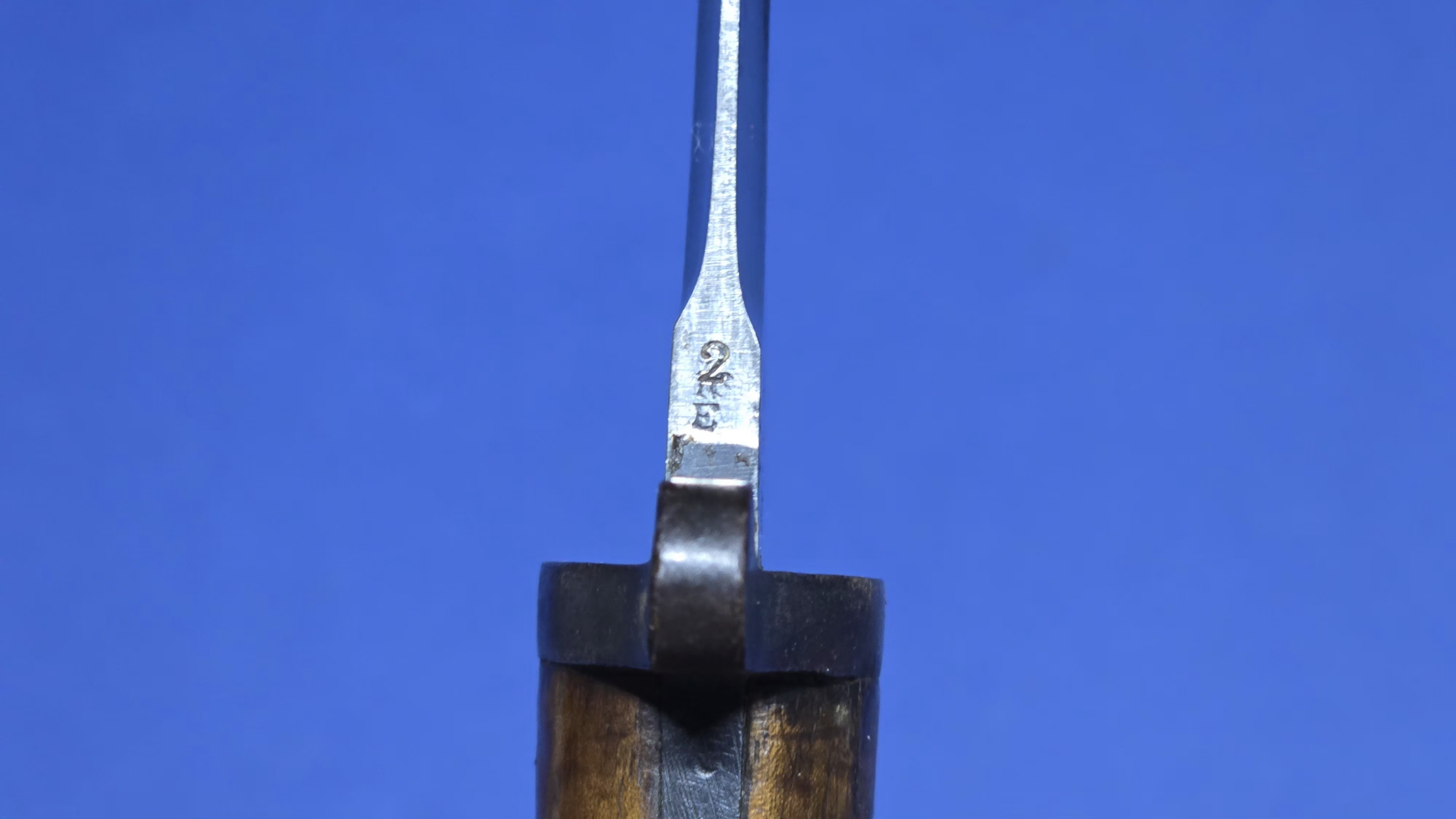 The wooden grips are original and in excellent condition, secured with their correct screw bolts. The oil hole is present to the top of the grip, and the rifle retaining button is fully functional. The pommel is clearly regimentally stamped 2 Mx 590, interpreted as 2nd Battalion, Middlesex Regiment. Always nice to see regimental markings, as it leaves an option for further research. An additional factory marking is present on top of the pommel (EFD), this refers to (Enfield Factory Designation) indicating that the bayonet was manufactured, repaired, or converted at the Royal Small Arms Factory Enfield.