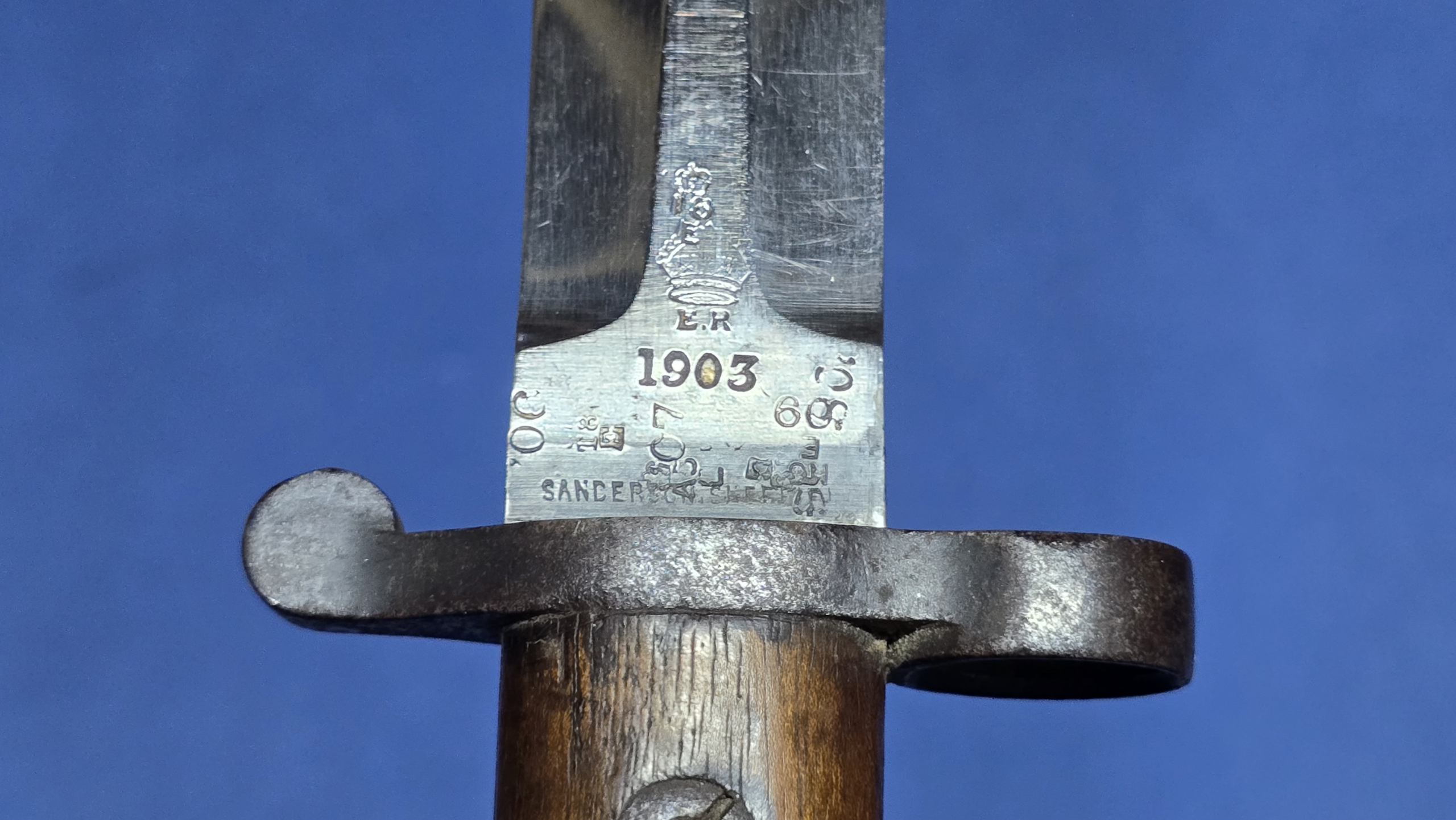 The blade is in very good condition, it remains bright and clean with a good tip. The edge is tidy and shows no signs of post war sharpening. The ricasso is crisply marked with Crown over ER, 1903, and the maker Sanderson, Sheffield. Inspection stamps are present and visible. An “X” bend test mark is stamped to the reverse, indicating it passed the official flexibility bend test. Additional inspection stamps are present to the spine.