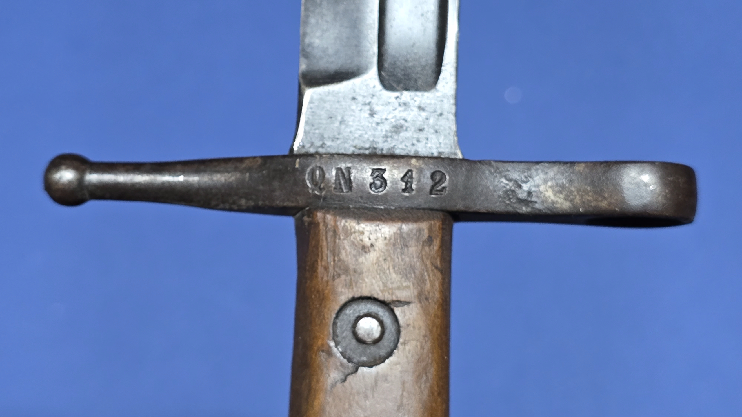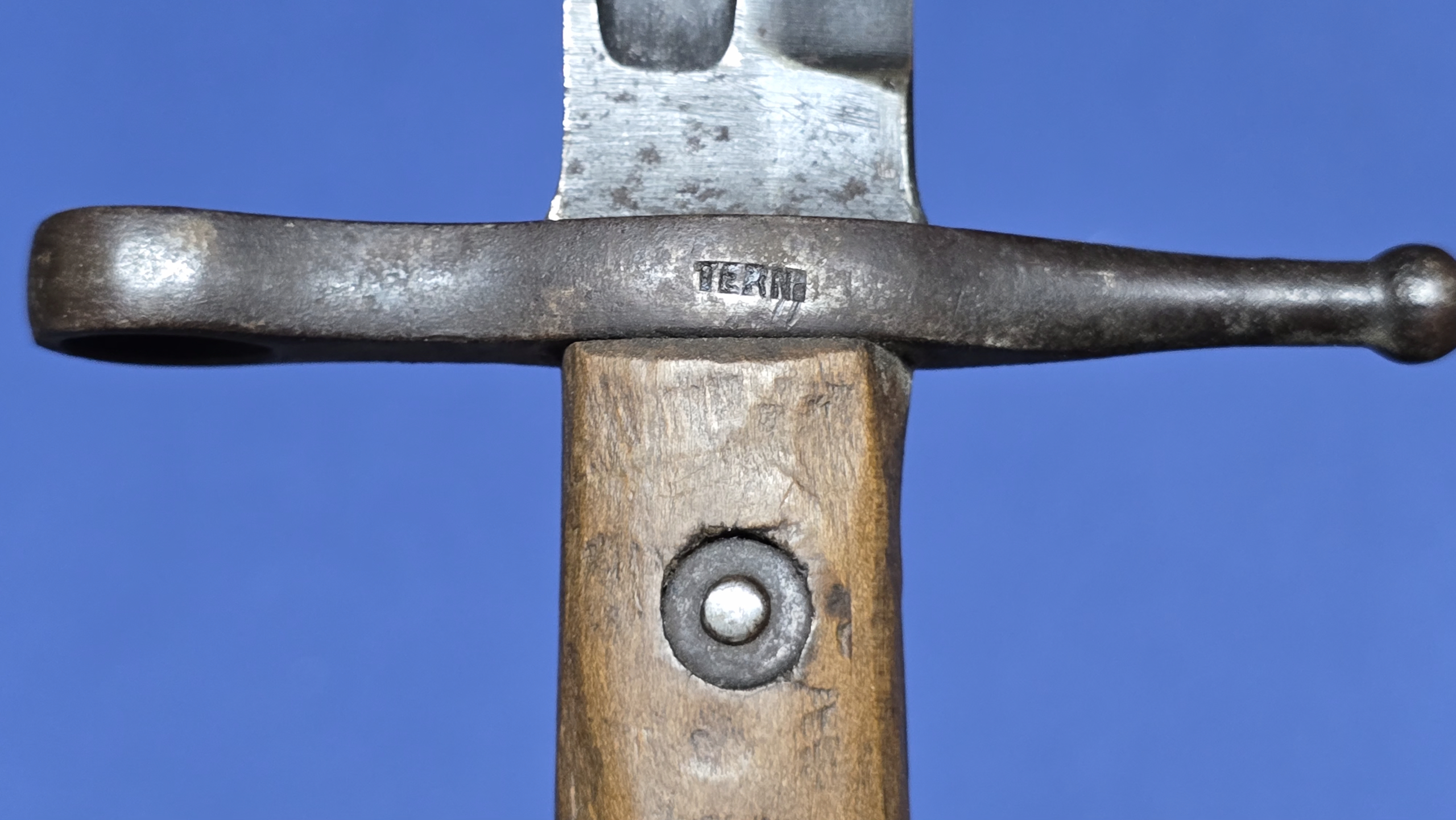 The wooden grips are in solid condition, showing some handling and small indentations, but no cracks or repairs. Rivets remain tight, and the rifle retaining catch is fully functional with a positive spring. The crossguard is unit-marked “QN312”, a period army/rack number used to identify the weapon within a sub-unit. These alphanumeric combinations (letter followed by a number series) were commonly applied at unit level and vary widely. The reverse of the crossguard is clearly stamped “Terni”, confirming manufacture by the Regia Fabbrica d’Armi di Terni, one of Italy’s principal state arsenals responsible for production of M1891 bayonets.