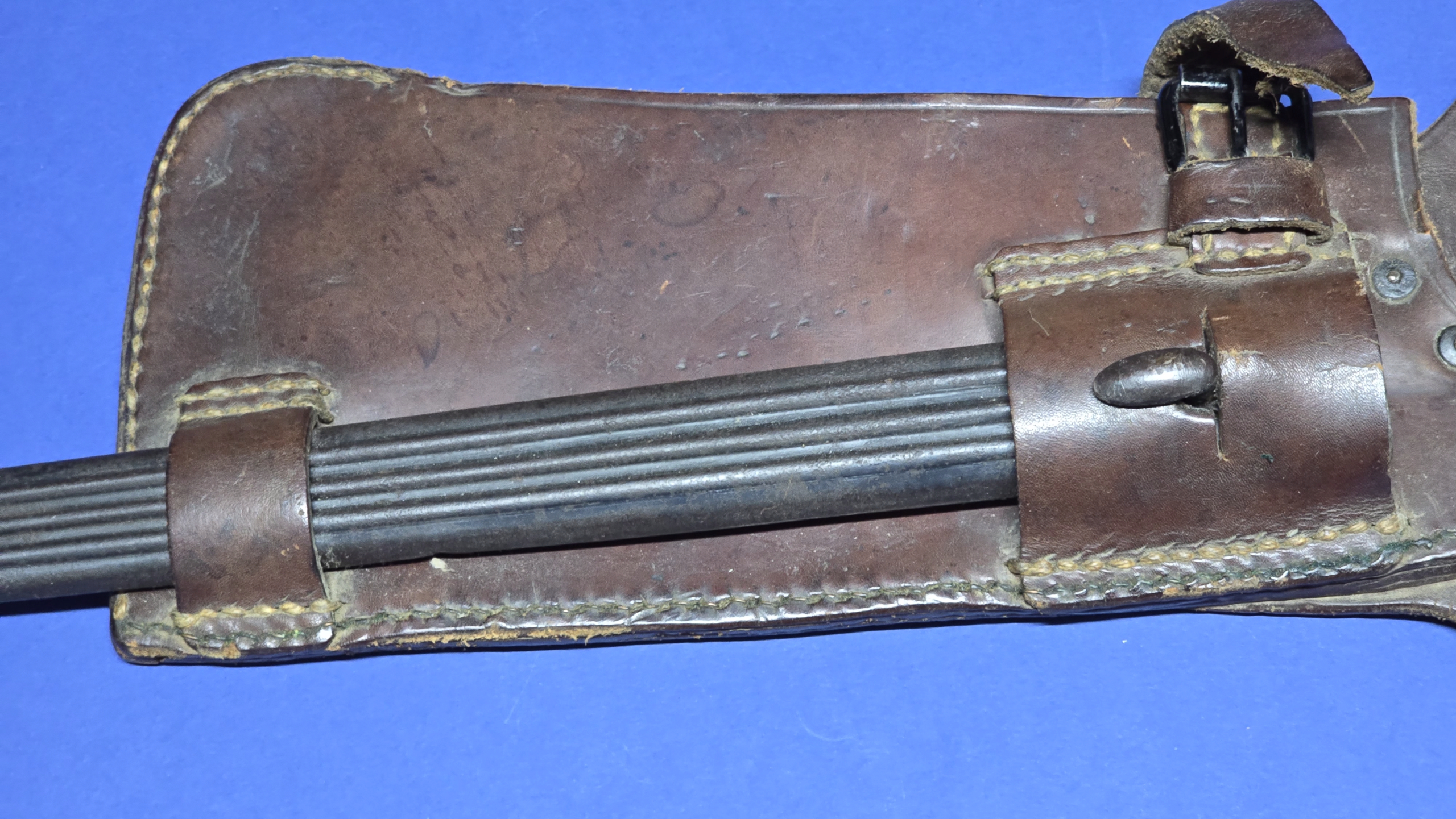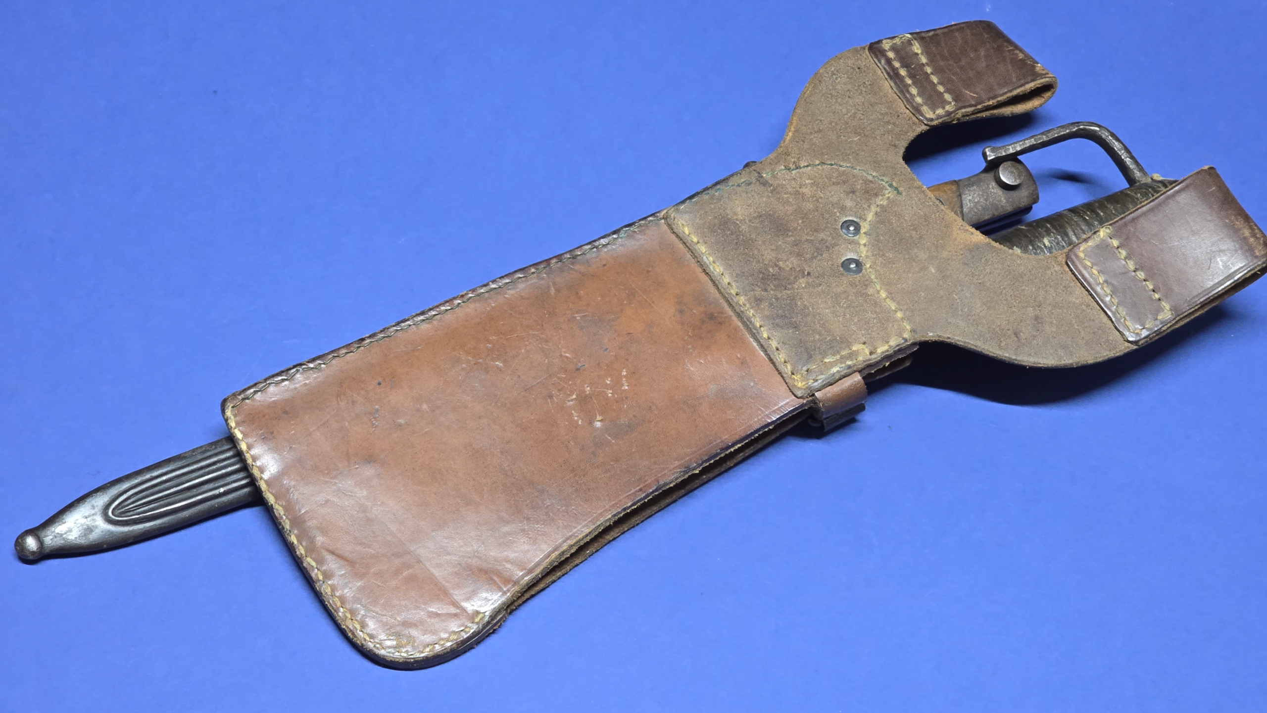 The bayonet remains in very good condition, showing approx. 90-95% of the original blued finish, with only light wear consistent with age. The factory sharpened edge is still visible, with no signs of post war sharpening. The fullers are clean, and the blade has not been polished or altered. A lovely, honest example.