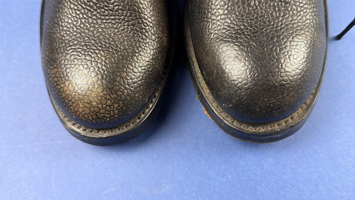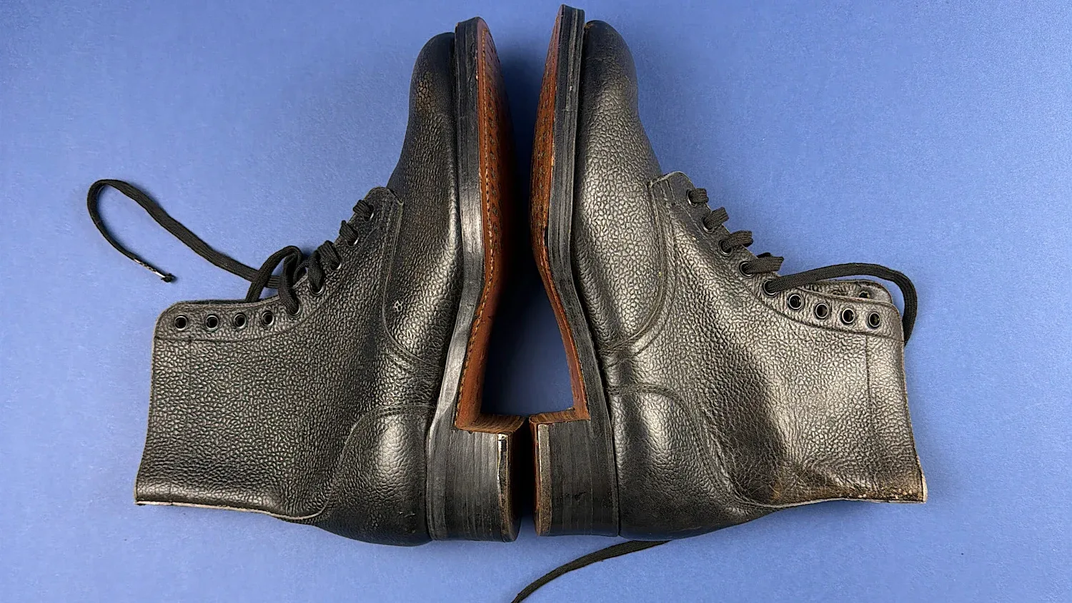 Importantly, this pair remains unissued. The soles show no walking wear, the hobnails remain sharp and unworn, and the heel irons are intact. The leather uppers retain excellent structure while remaining impressively supple, with no cracking or dryness — something increasingly uncommon in wartime footwear of this age. Only very minor surface marks consistent with long-term storage are present.