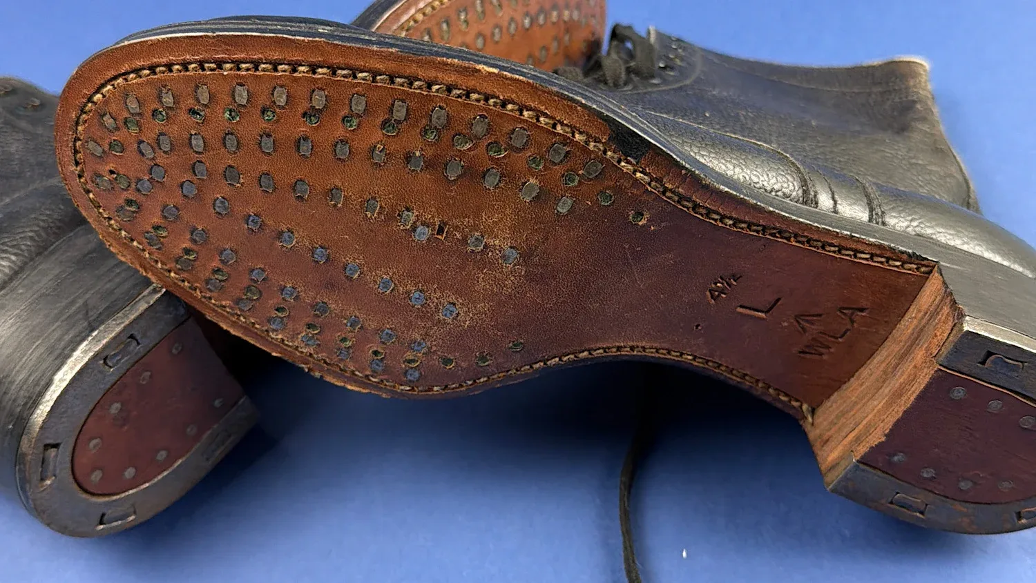Constructed from heavy pebbled black leather with full lace-up fronts, reinforced heels and studded leather soles complete with hobnails and heel irons, they are a robust agricultural pattern designed for hard rural labour. The soles are crisply stamped with “WLA”, together with size 4½ and factory production codes. Both boots also carry a large “L” stamp, which denotes the manufacturing last (the foot-shaped form used in production), rather than a left/right designation — a typical wartime factory marking and further confirmation of regulation manufacture.
