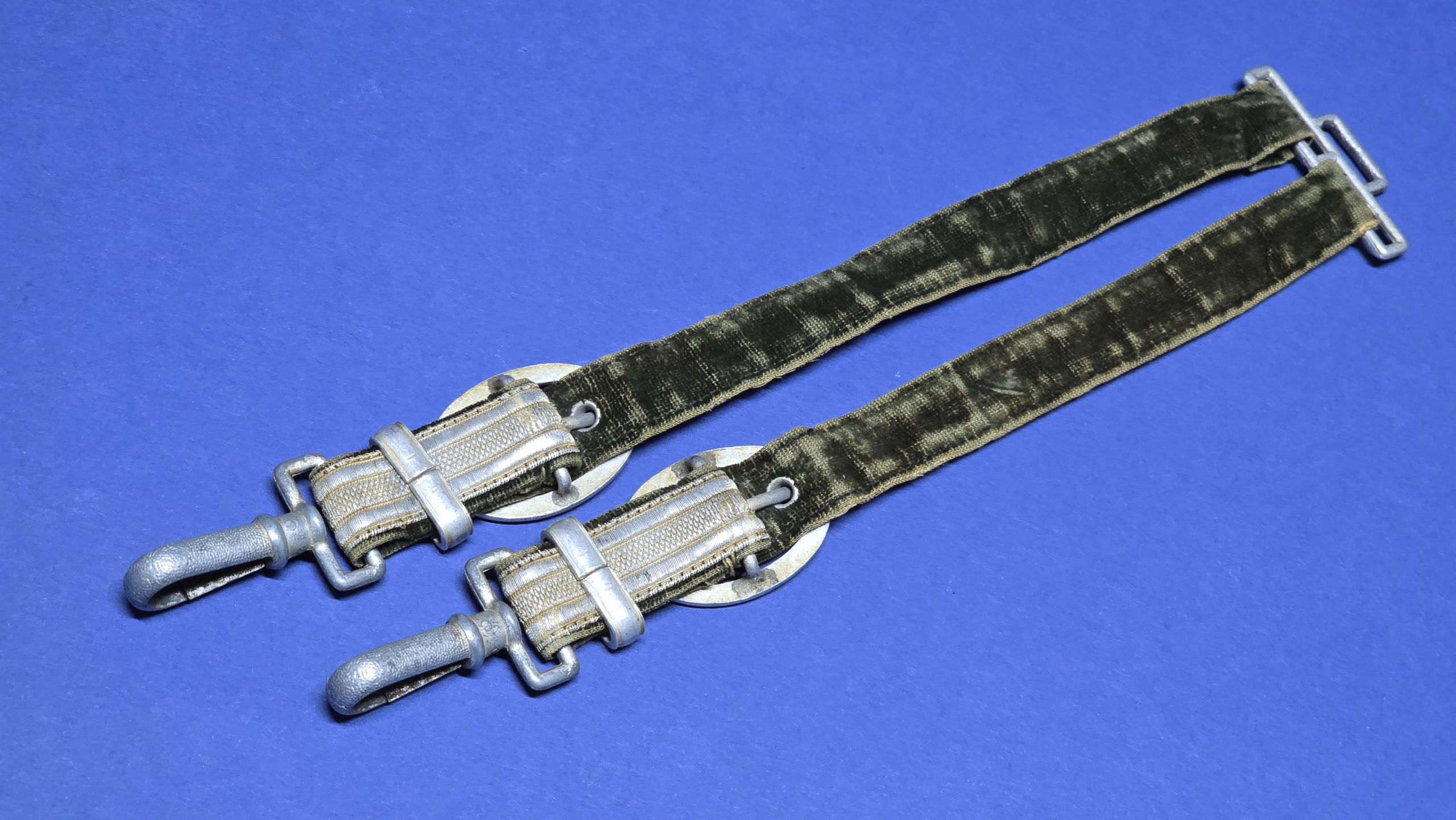 A very nice original set of German Army officer’s dagger hanger straps. These are the standard pattern straps fitted with aluminium mounts and clips, rather than the more elaborate deluxe pattern fittings.