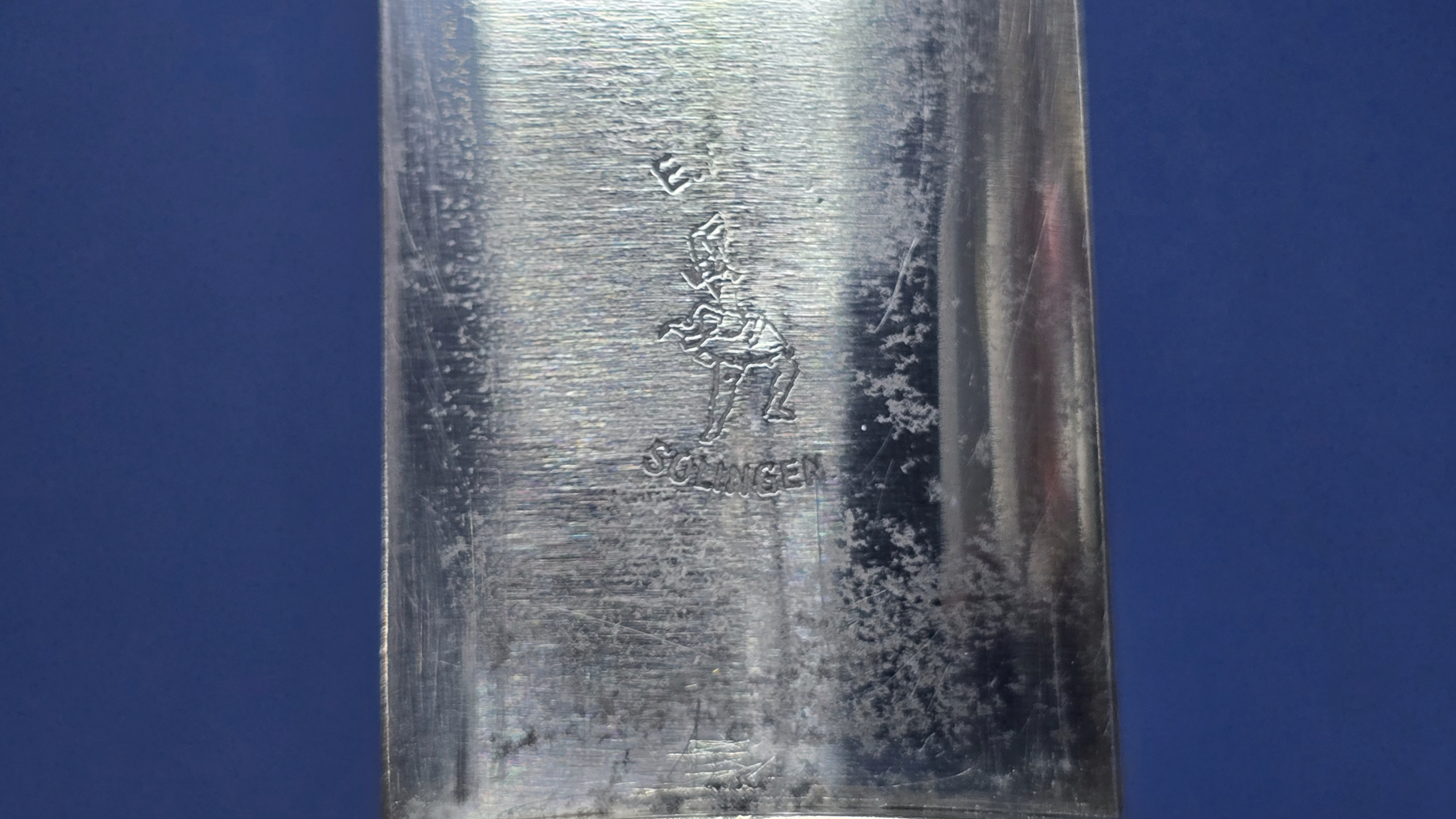 Early, solid nickle crossguards showing an untouched, honest patina. The rear lower guard carries the “NO” Gau mark, (Nordsee). These marks were used as a distribution control measure. The blade to guard fit is nice and tight, as expected on these early pieces.