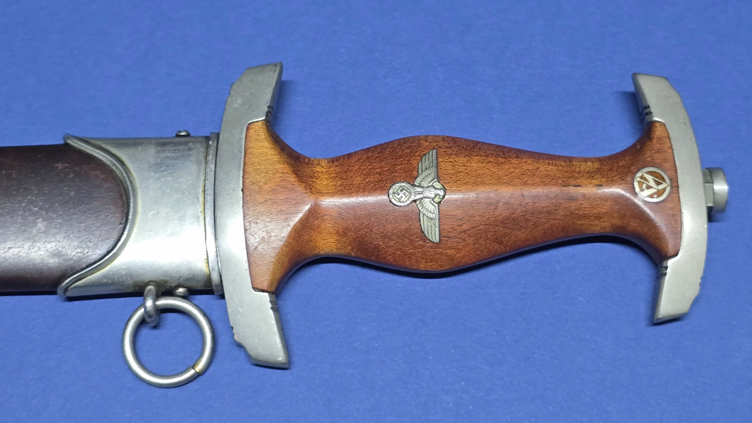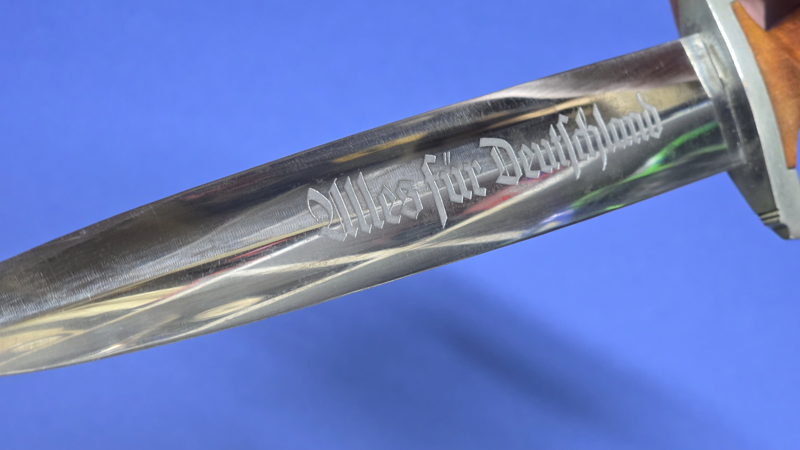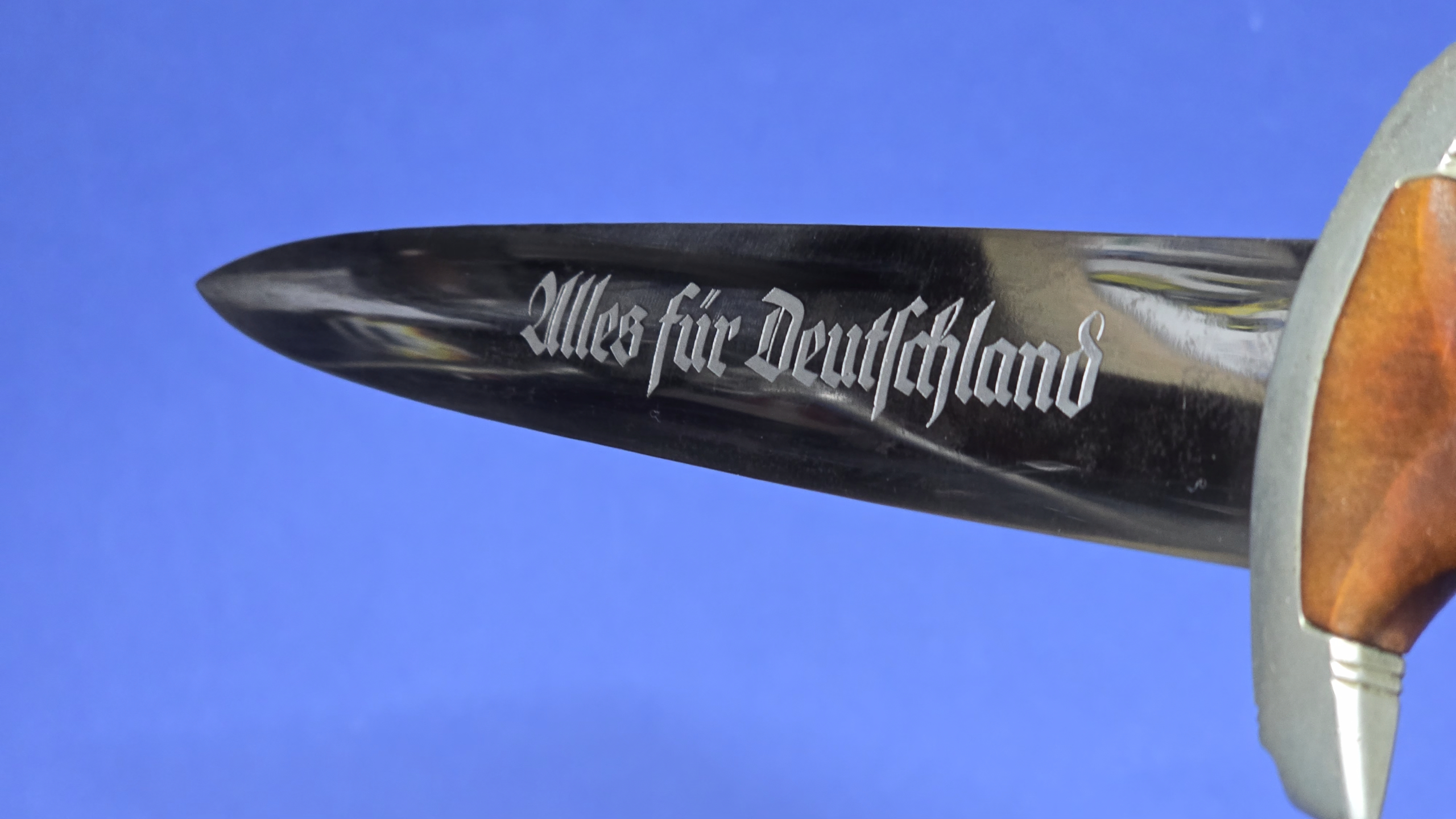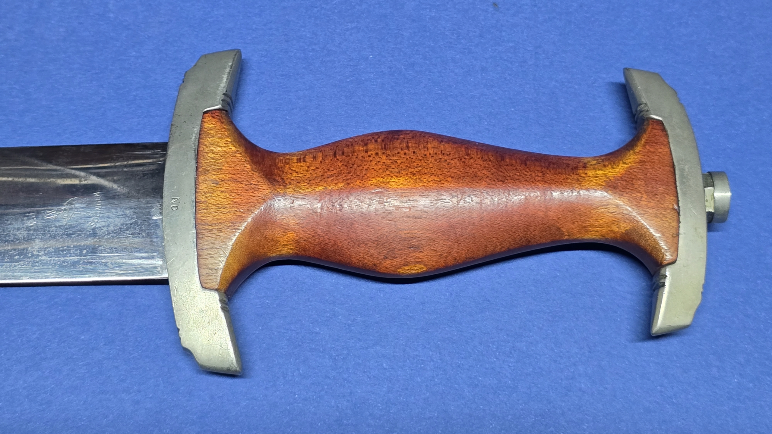The SA dagger was introduced in 1933 as the official sidearm of the Sturmabteilung (SA), the early paramilitary wing of the Nazi Party. Designed as a symbol of loyalty and political identity rather than a combat weapon, it carried the motto “Alles Fur Deutschland” (All for Germany) on the blade. Early examples, like this one, were produced with high-quality nickle fittings and hardwood grips by the Solingen makers.