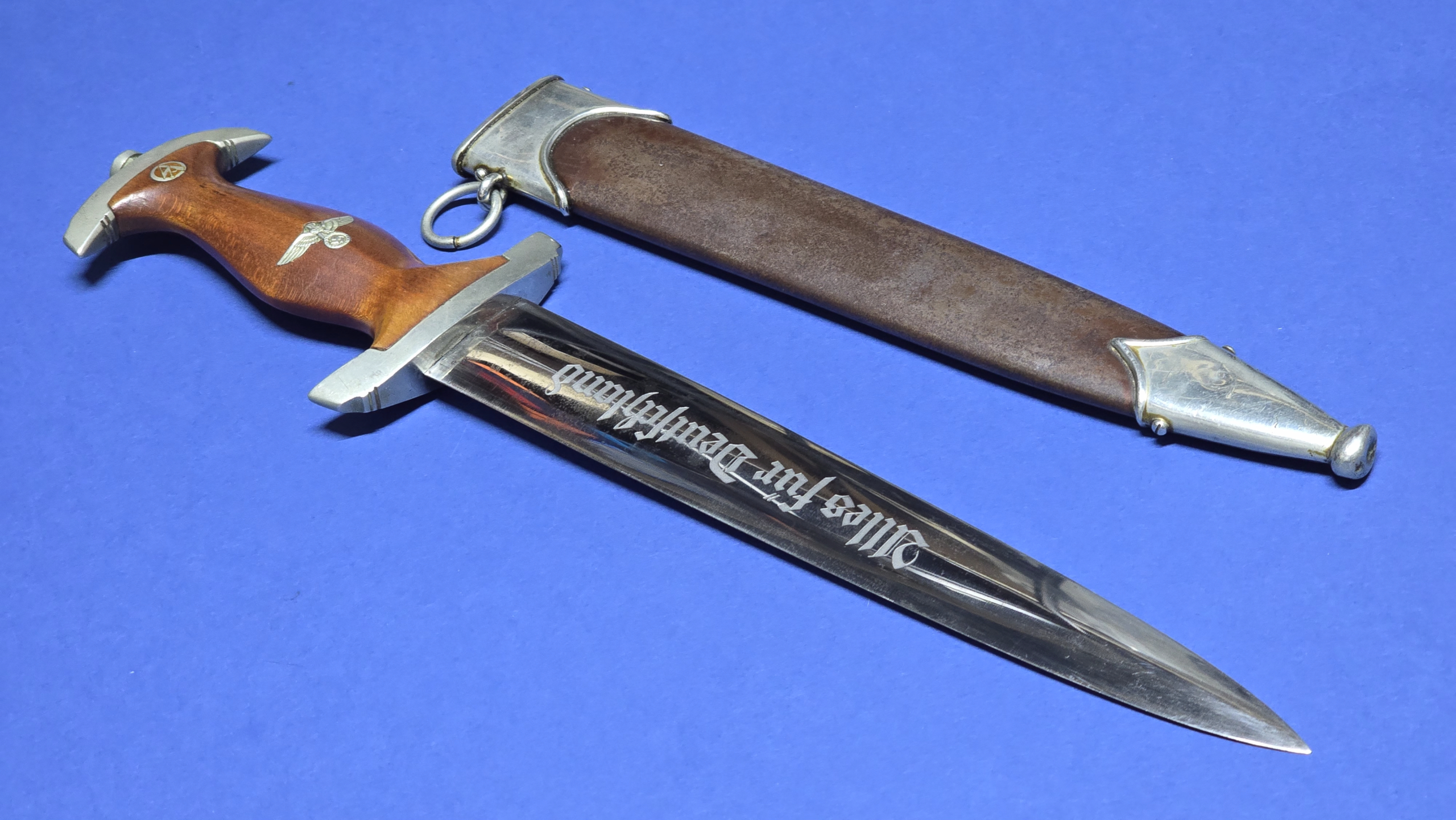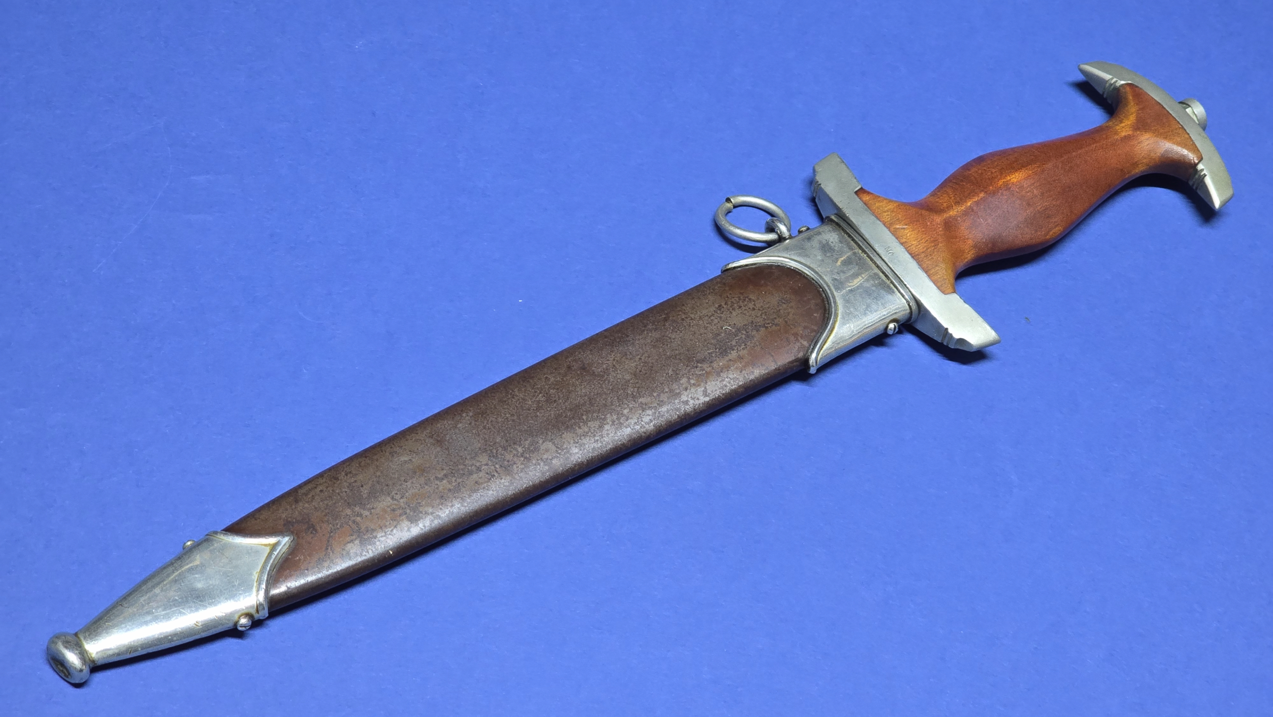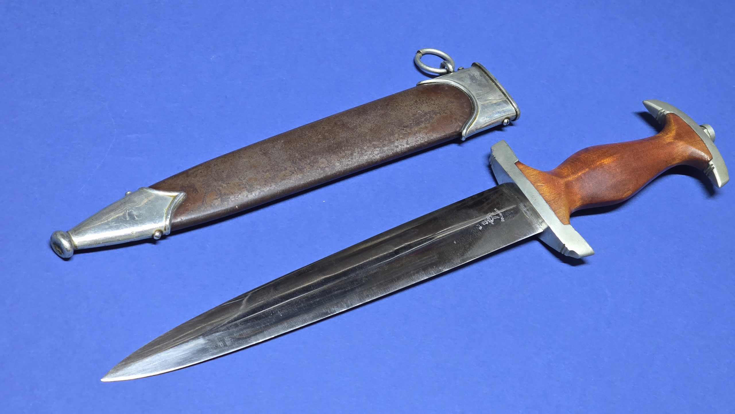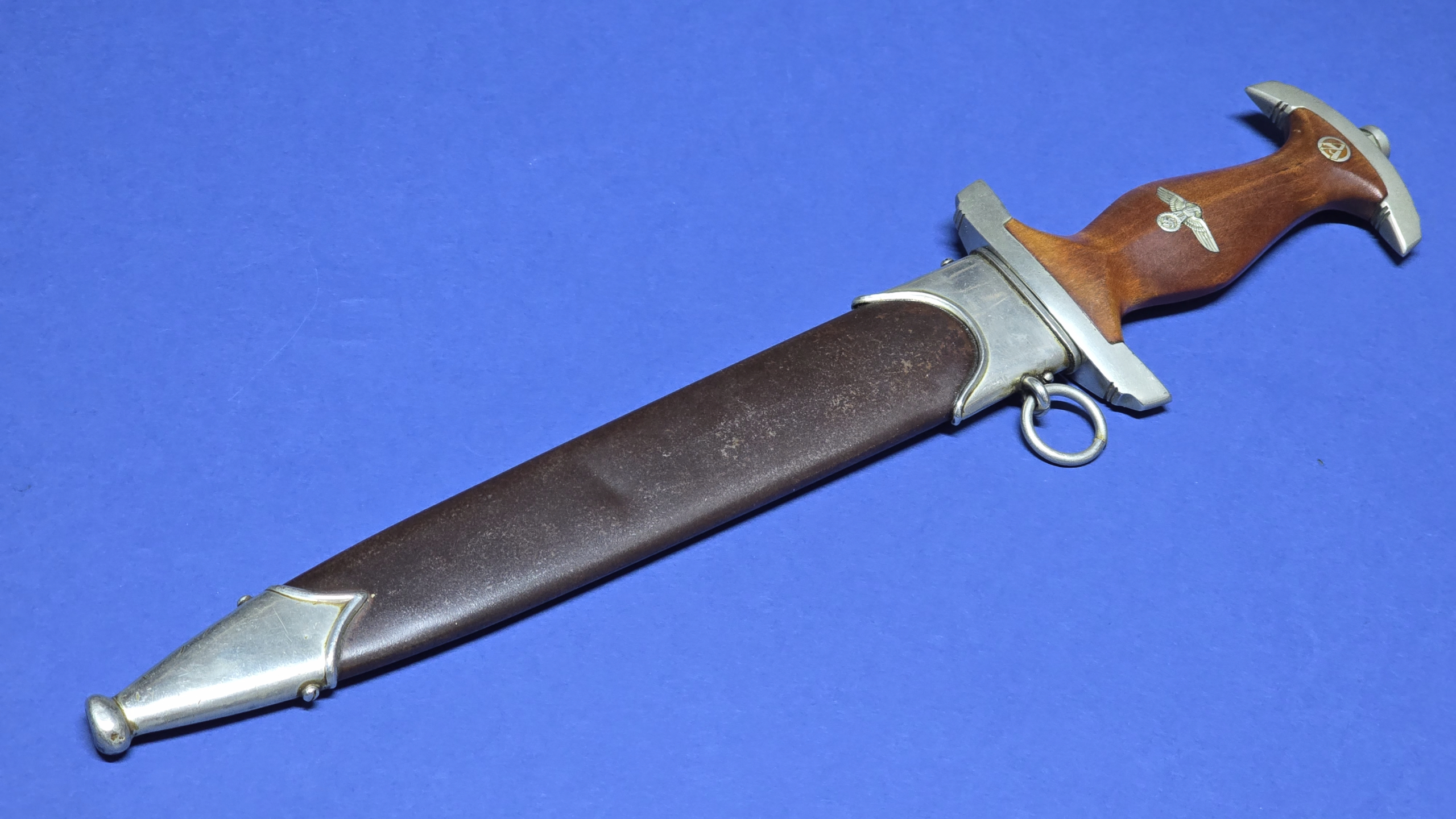 The SA dagger was introduced in 1933 as the official sidearm of the Sturmabteilung (SA), the early paramilitary wing of the Nazi Party. Designed as a symbol of loyalty and political identity rather than a combat weapon, it carried the motto “Alles Fur Deutschland” (All for Germany) on the blade. Early examples, like this one, were produced with high-quality nickle fittings and hardwood grips by the Solingen makers.