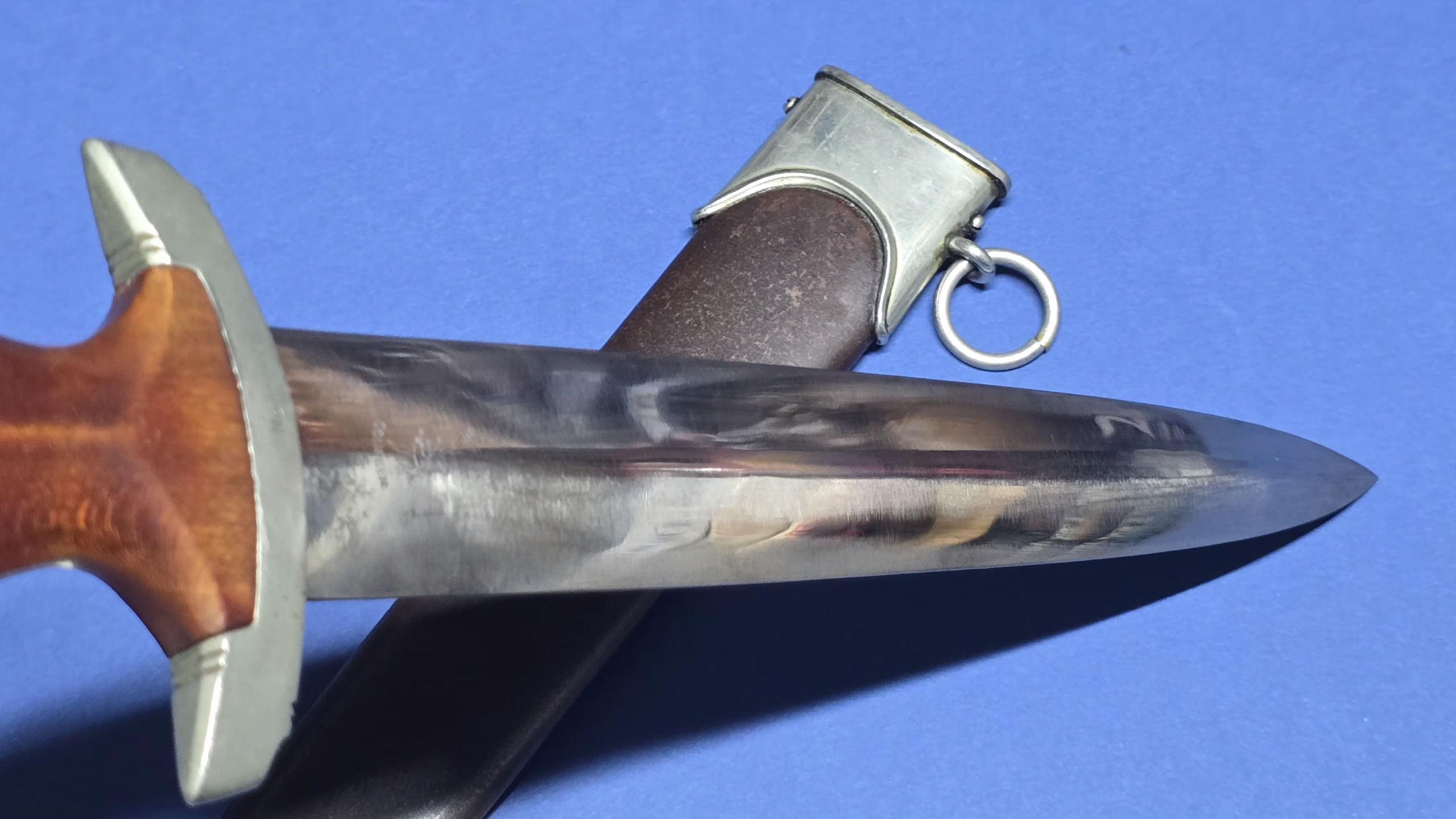 A very respectable early E.P.&S. SA dagger in very good condition. The untouched nickle fittings, classic Pack grip, and tight overall fit place it well above average examples. Its status as a factory-ground Rohm dagger adds significant historical interest and makes it far more desirable than a standard M33. A strong honest, and very displayable early SA.