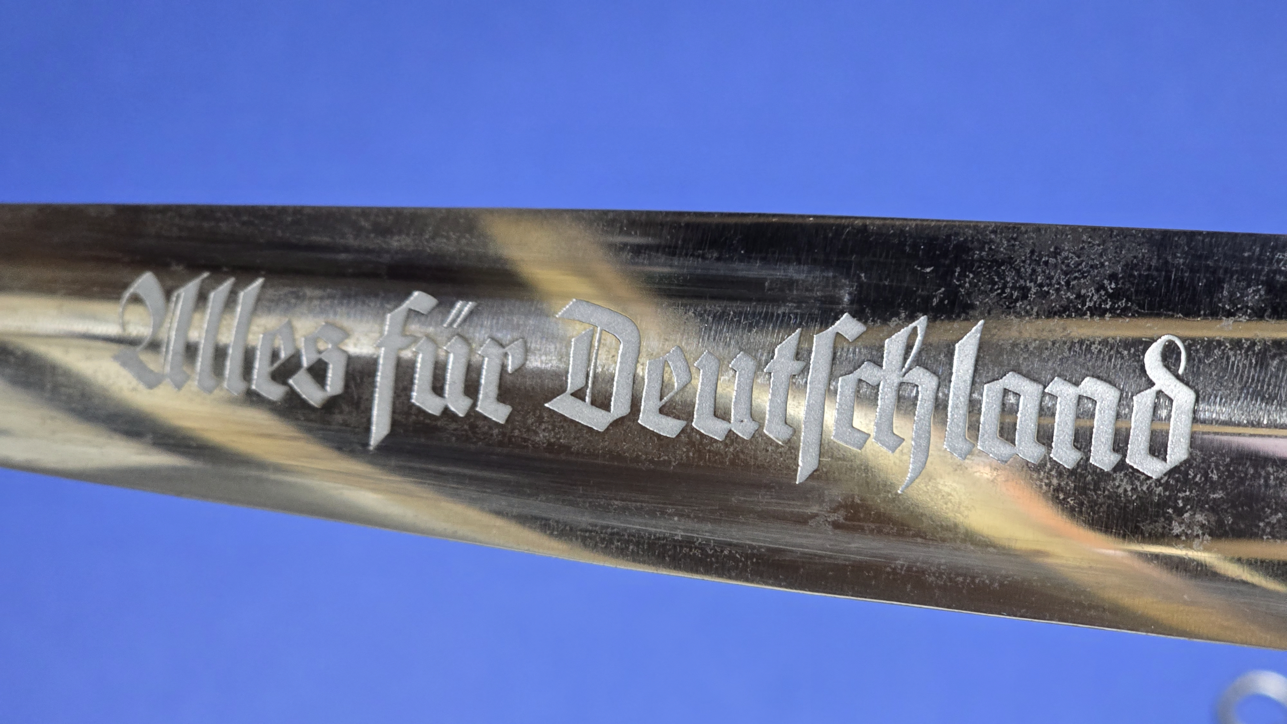 This blade began life as an Ernst Rohm dedication dagger. Following the Night of the Long Knives in 1934, Hitler ordered all Rohm inscriptions removed. This example is a factory-ground Rohm, meaning it was returned to the factory to be professionally erased. As expected, part of the reverse maker logo has been affected by the grinding, but luckily the majority still remains. There is a tiny left-over fragment of the inscription remaining, in the aera of Rohm’s signature, although, very small, and you’ll need to look closely. The obverse motto “Alles Fur Deutschland” is a good detailed inscription, with frosting remaining to the letters. The blade retains aeras of original crossgrain, with some light surface staining in places. The blade has not been sharpened and ends in a clean, original point.