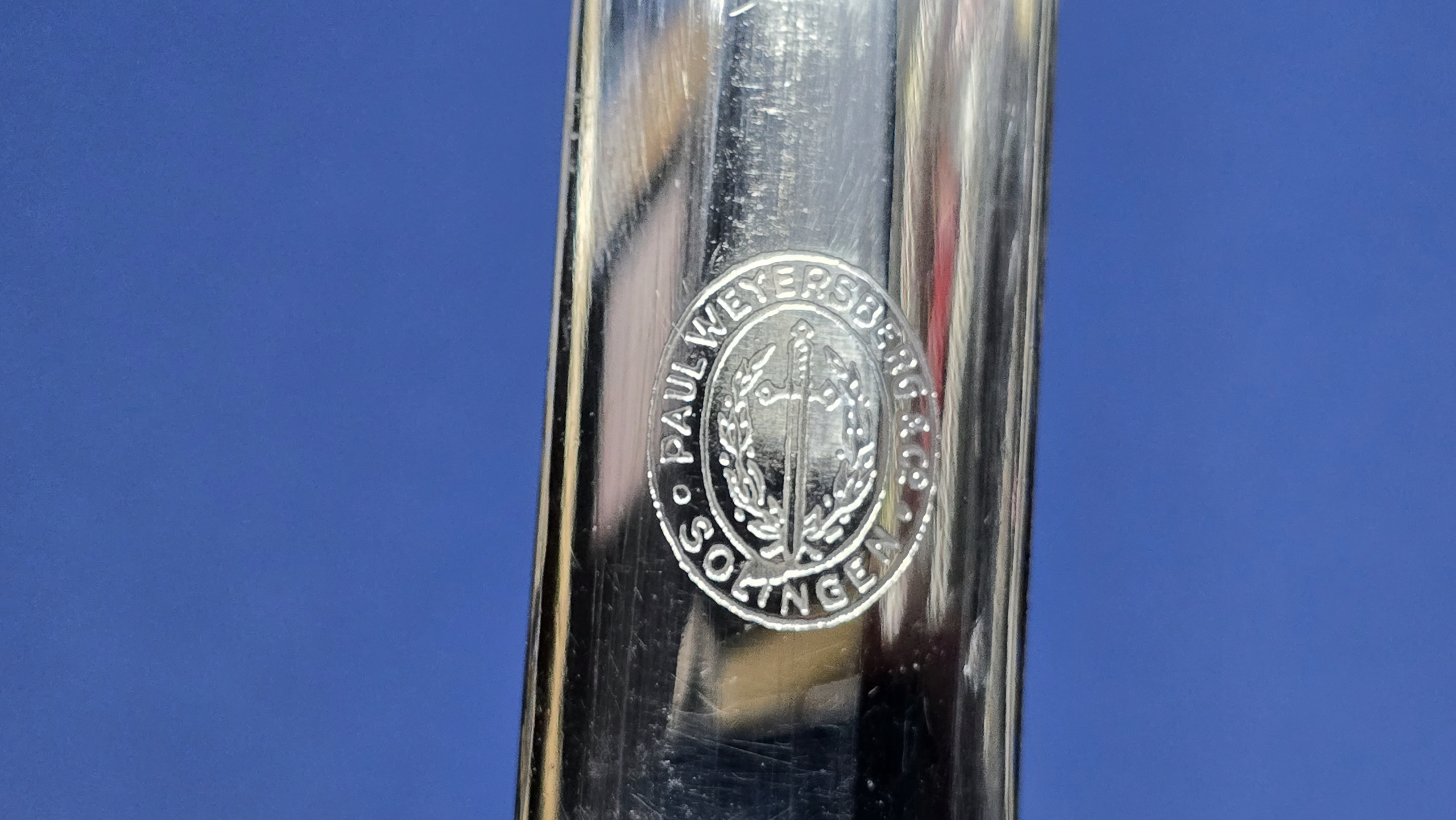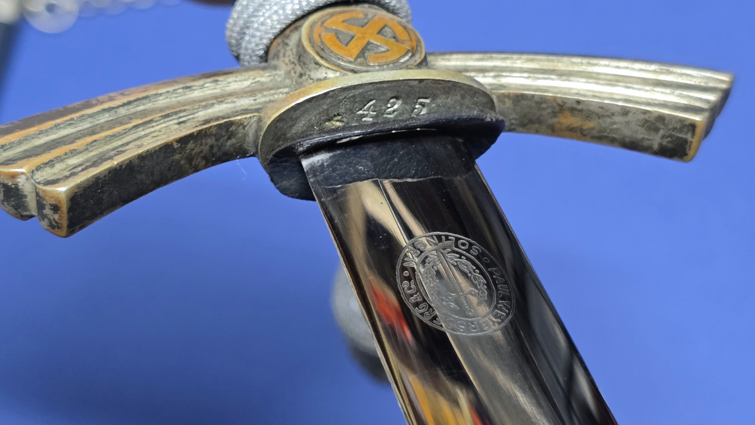 The blade is in excellent condition, retaining a mirror bright finish on both sides. It is unsharpened and has a good point. The ricasso bears the clearly etched Paul Weyersberg & Co, Solingen logo, one of the most respected manufacturers of the period, known for in-house production and superb craftsmanship. Under the original leather buffer pad, we find the unit number “4425”, another bonus that adds to the piece.