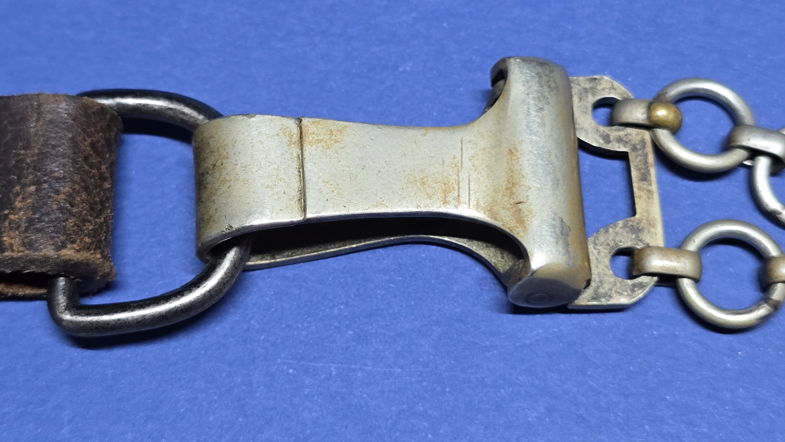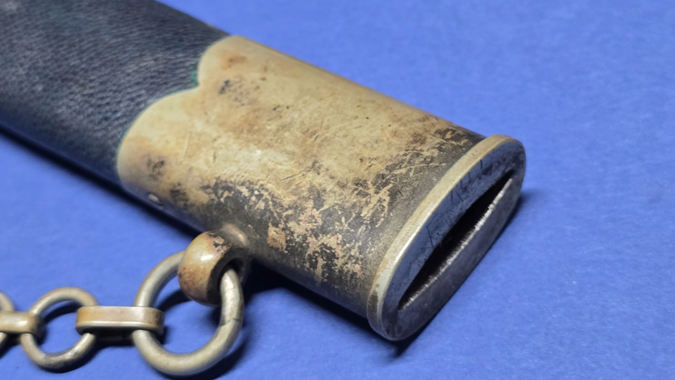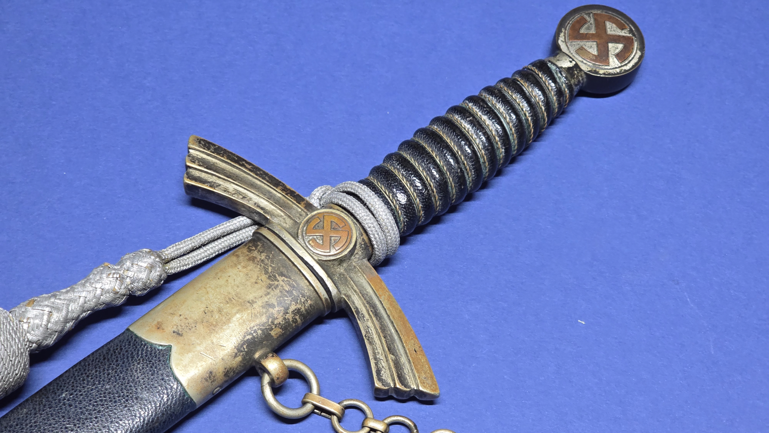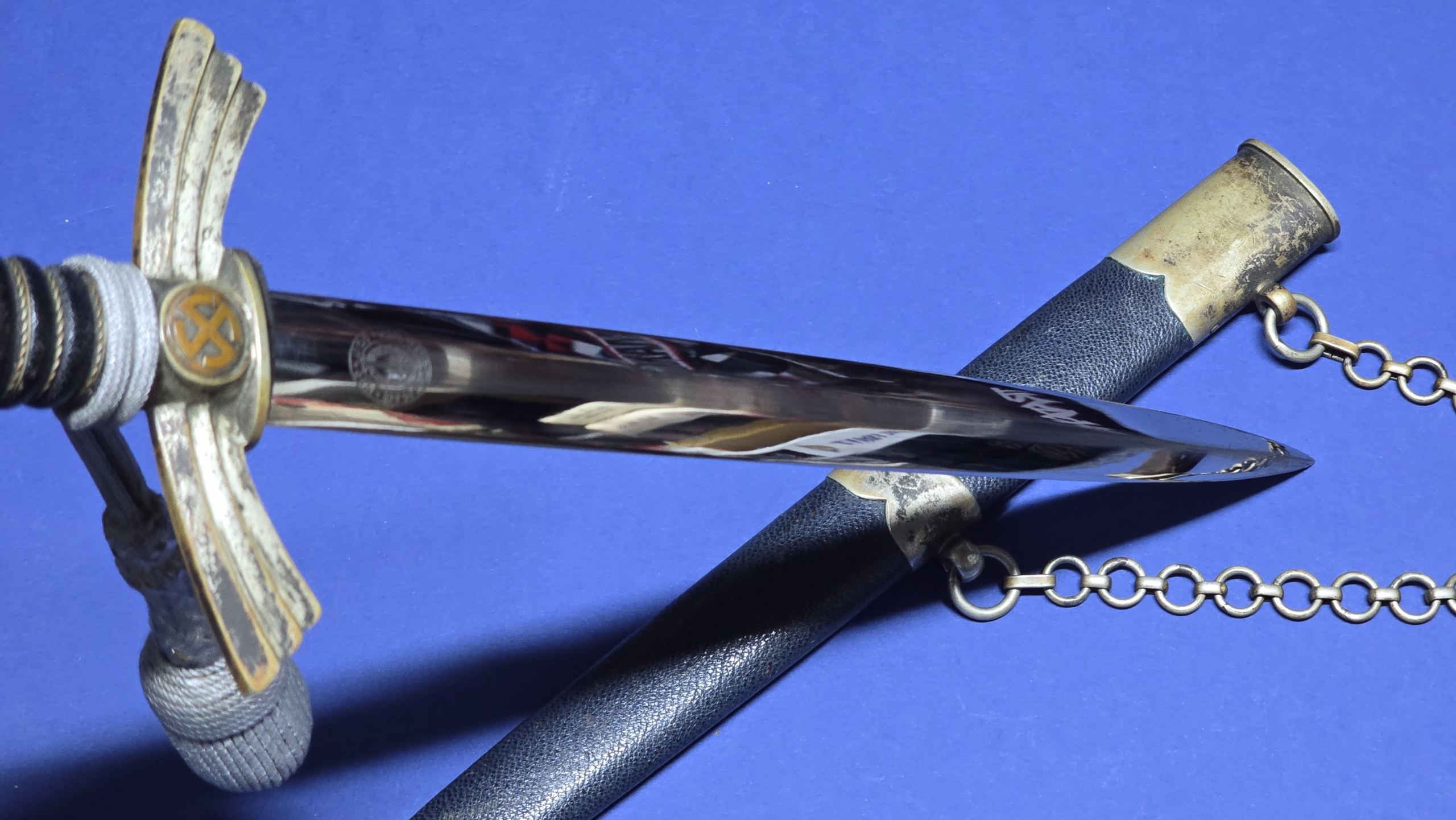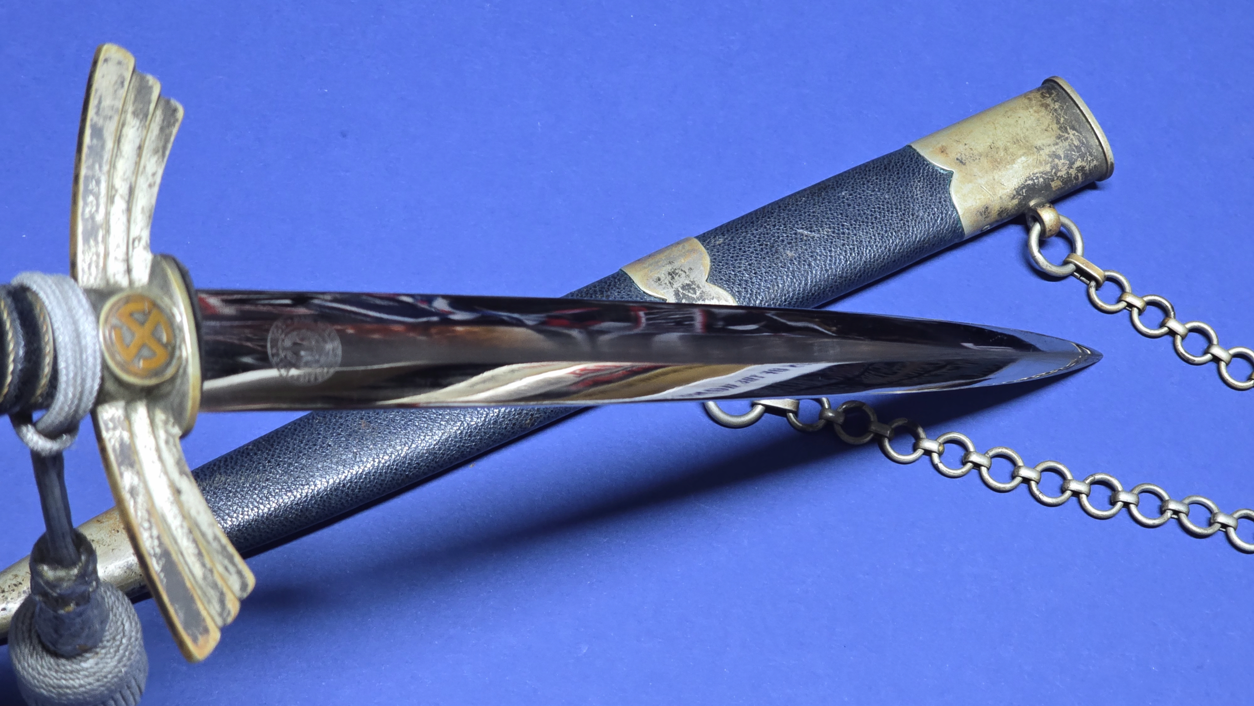 The scabbard leather is in very good condition, free from tears or splits, and fits the blade snugly. Both upper and lower nickle fittings display a nice patina, with all original screws intact and never turned. The piece comes complete with its original nickle chain, which is also uncleaned and displays patina. To finish the piece off, it has a leather belt loop attached to the chain buckle, and a correct first-pattern Luftwaffe portepee (knot), with this particular example being shorter than we normally encounter.