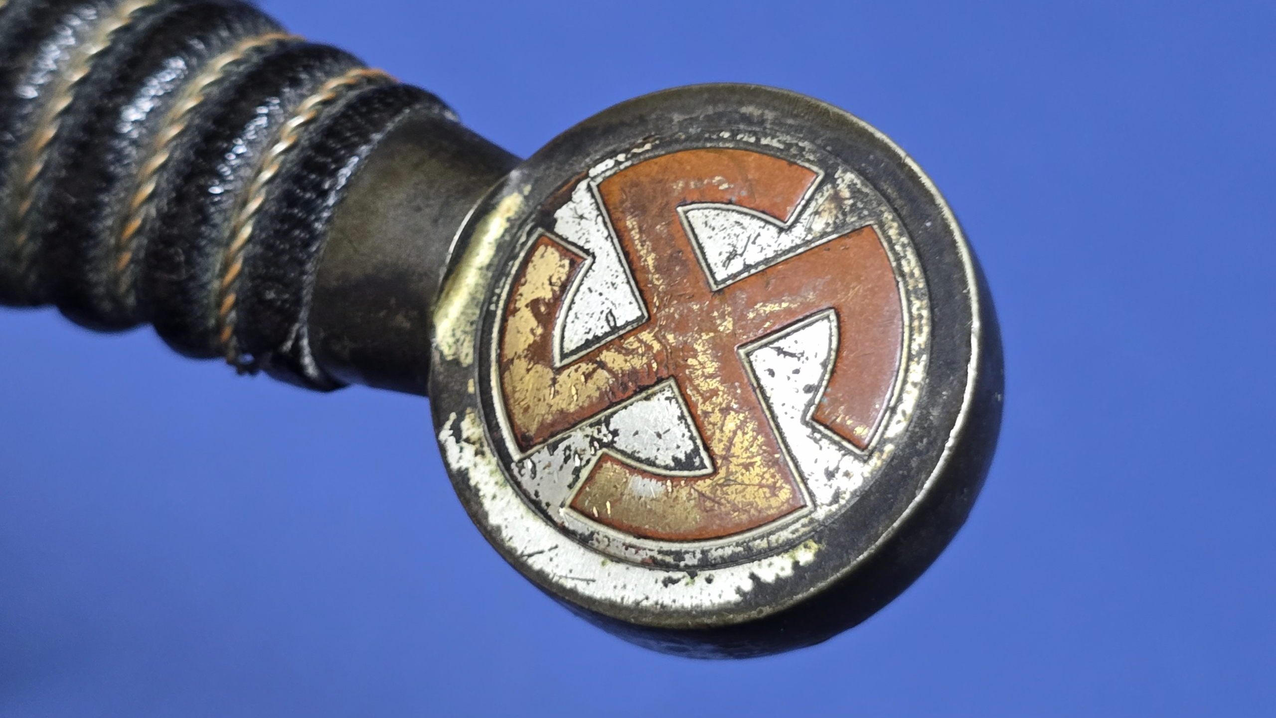 The blue moroccan leather grip remains in excellent condition, showing only light surface wear from age. The twisted grip wire is complete, nice and tight, and fits as it should. The nickle fittings display a wonderful uncleaned patina – darker in some areas and lighter in others. What’s particularly nice about this example is that both the crossguard and pommel still retain traces of the original factory frosting – something we don’t see very often. The crossguard and pommel show the high quality brass sunwheel swastika, only seen on these earl examples.