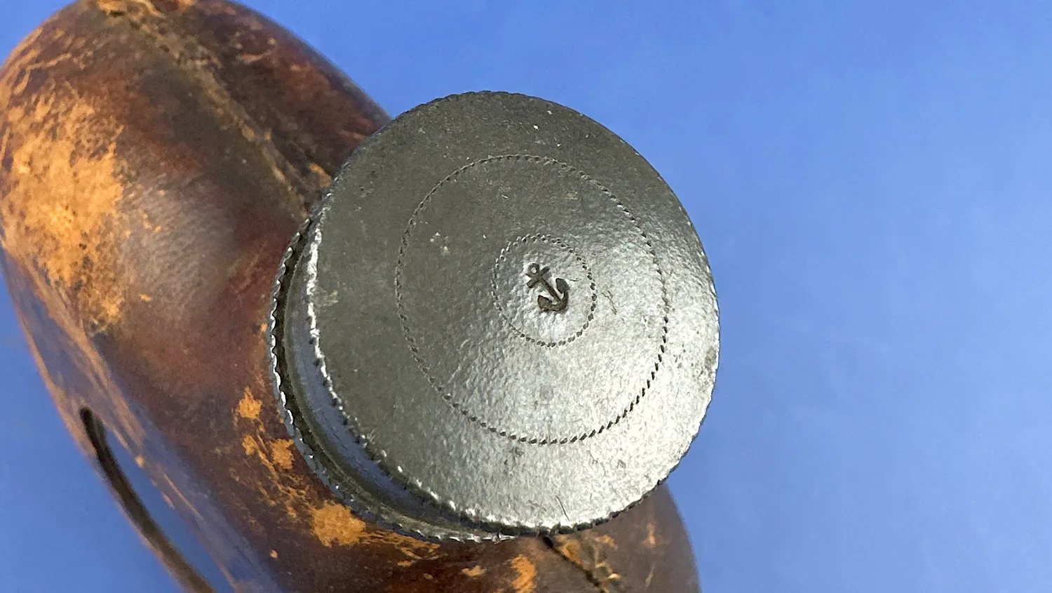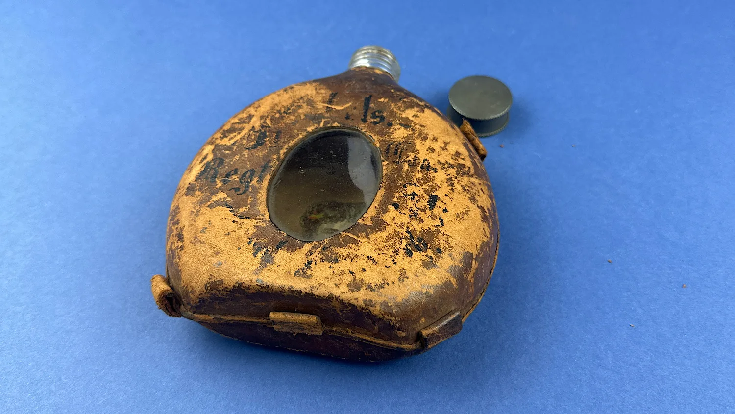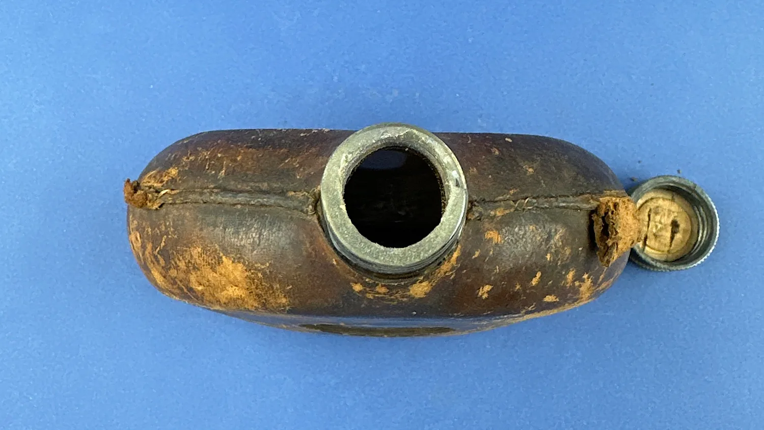 Considering it’s age, and also the main surface material being leather, this piece is in remarkable condition. Only one of the loops for a carrying lanyard has come off, but the other four are in place.The leather is well scuffed but the cap screws on and on as if it was brand new. This piece fits nicely in any serious collectors portfolio because it’s so memorable and quirky. Even if little is known about it’s history, it tells it’s own story.
