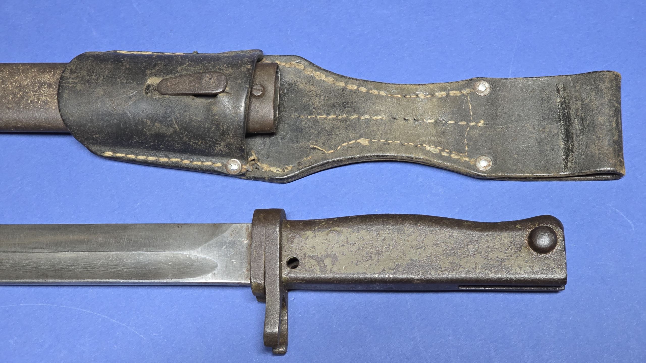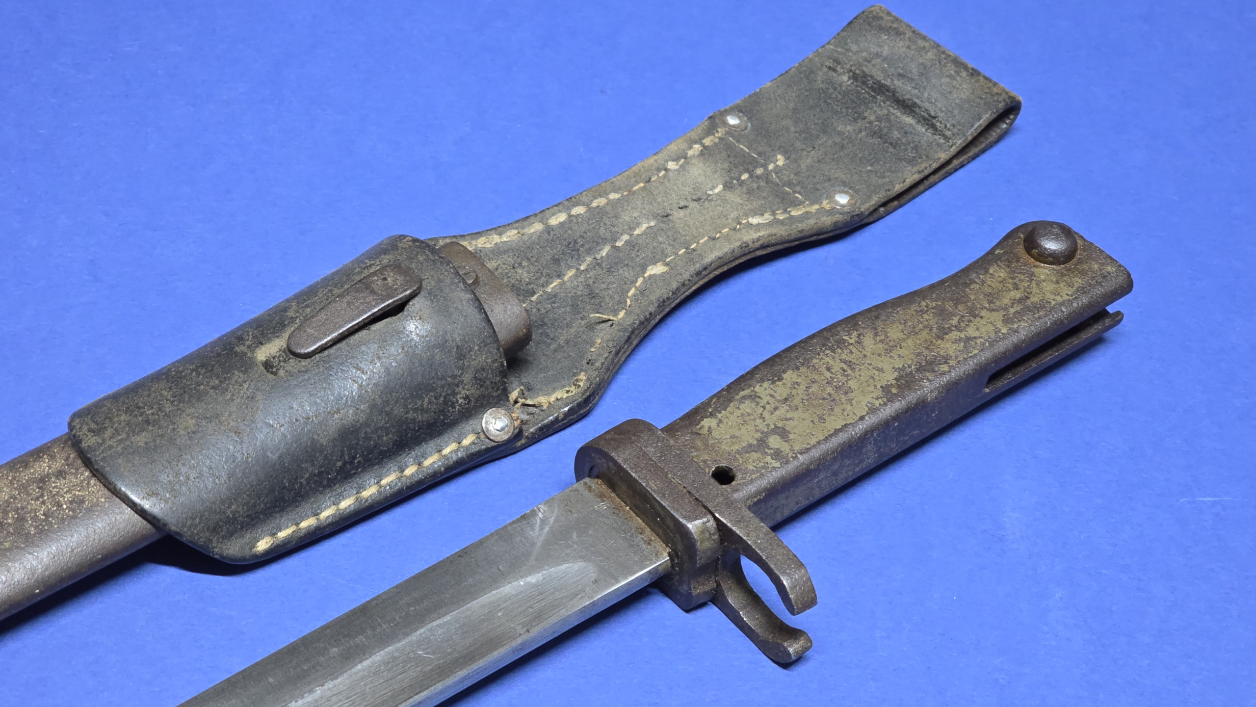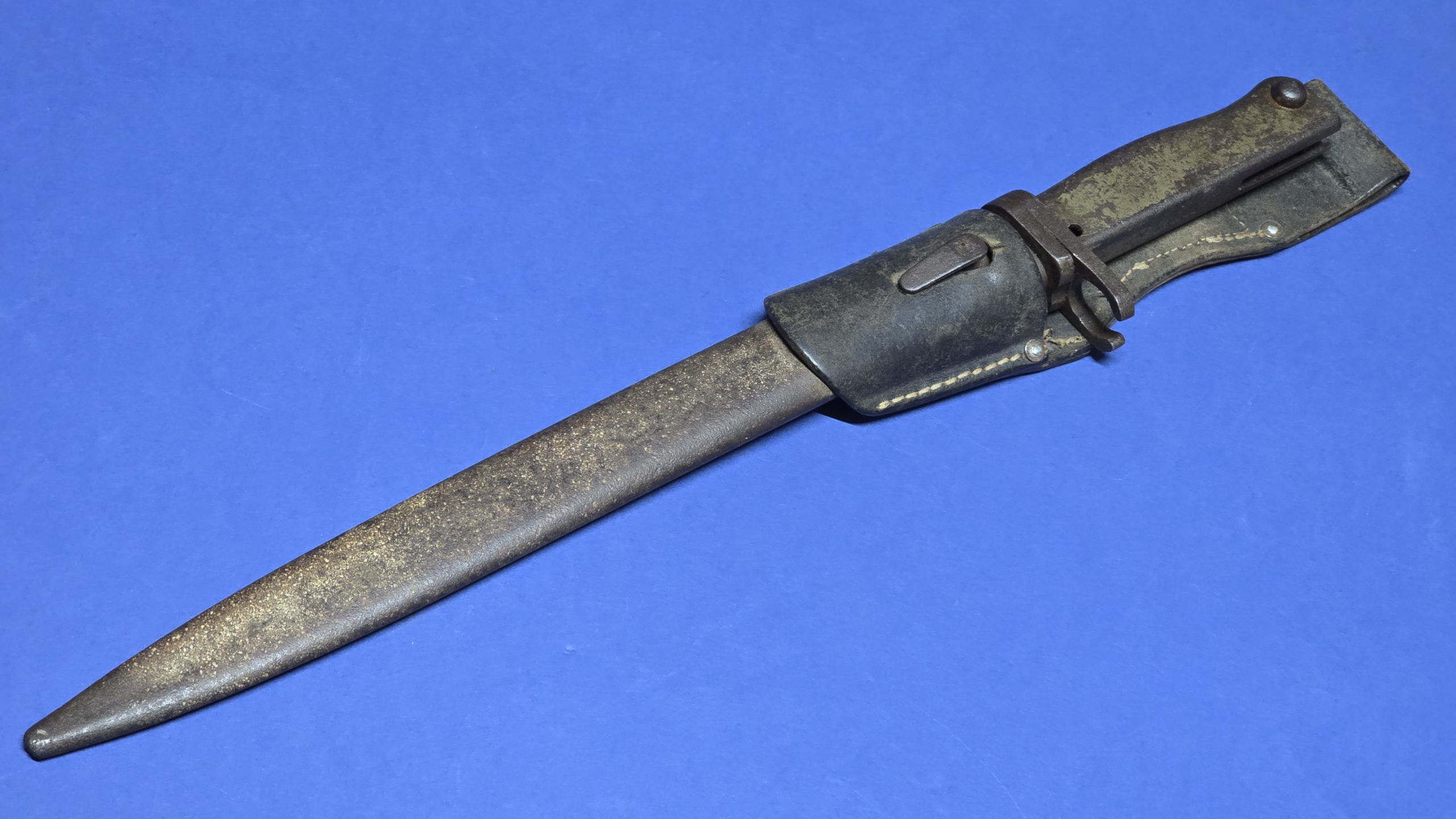 These bayonets were produced in numerous patterns and constructions, often lacking maker marks, with functionality prioritised over appearance. Originally finished with painted surfaces rather than bluing, ersatz bayonets represent a stark reflection of wartime necessity and industrial improvisation, making them an important and increasingly appreciated field of collecting today.