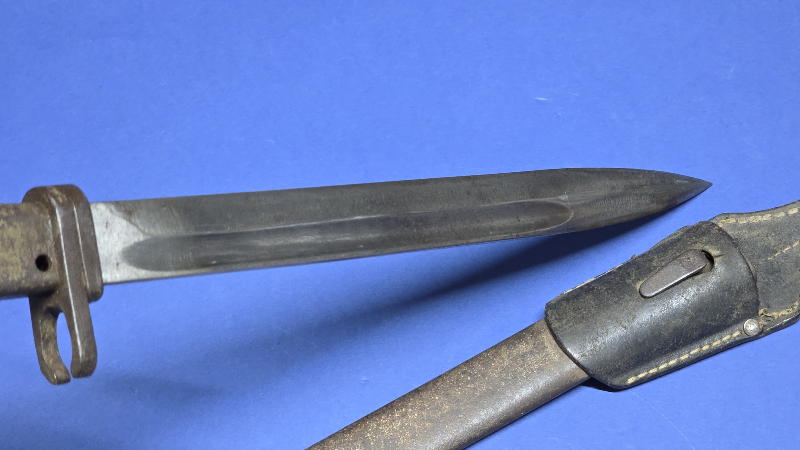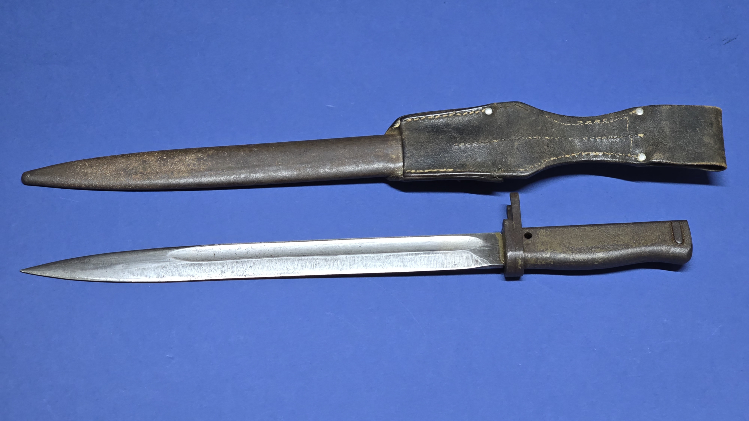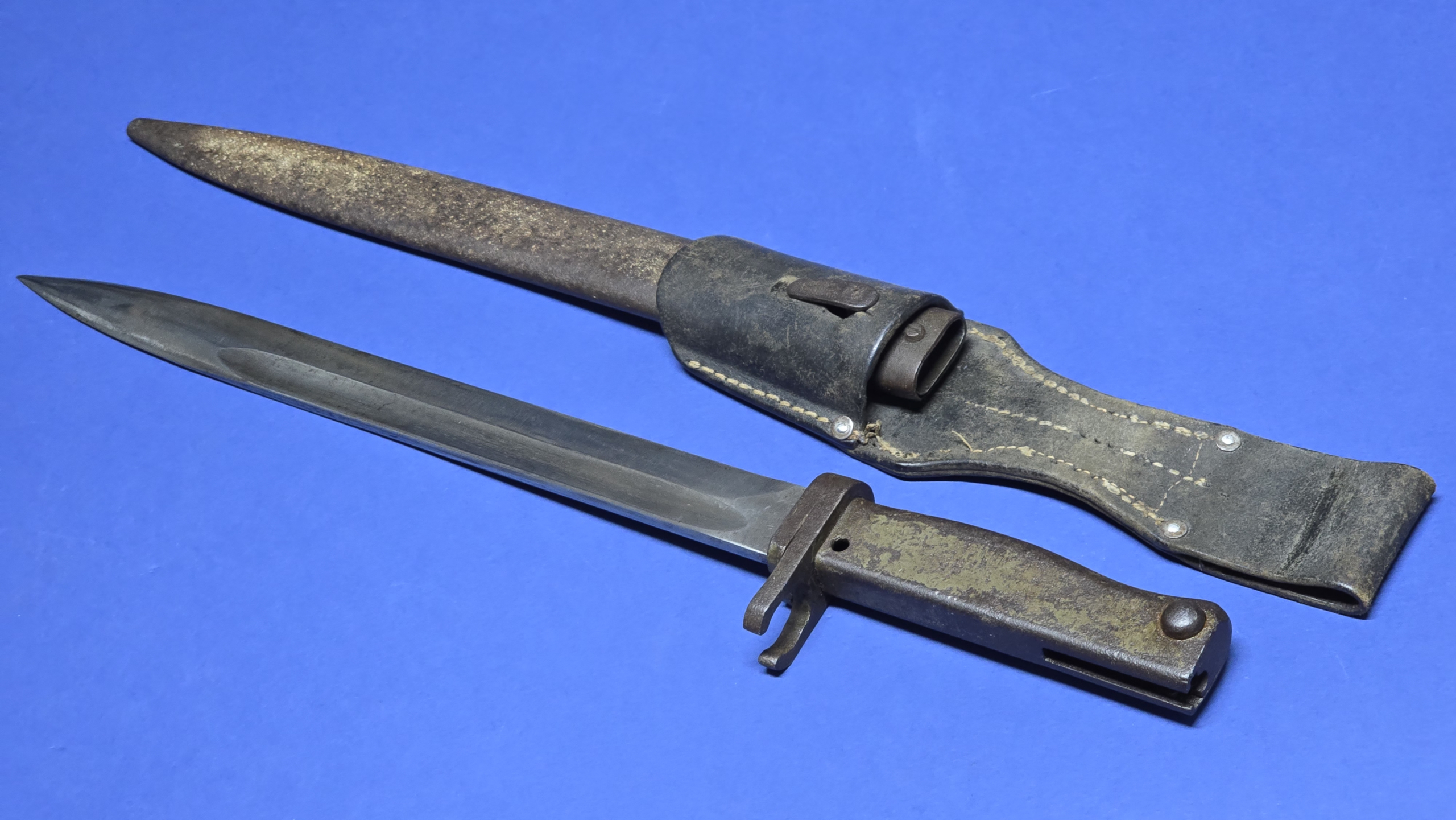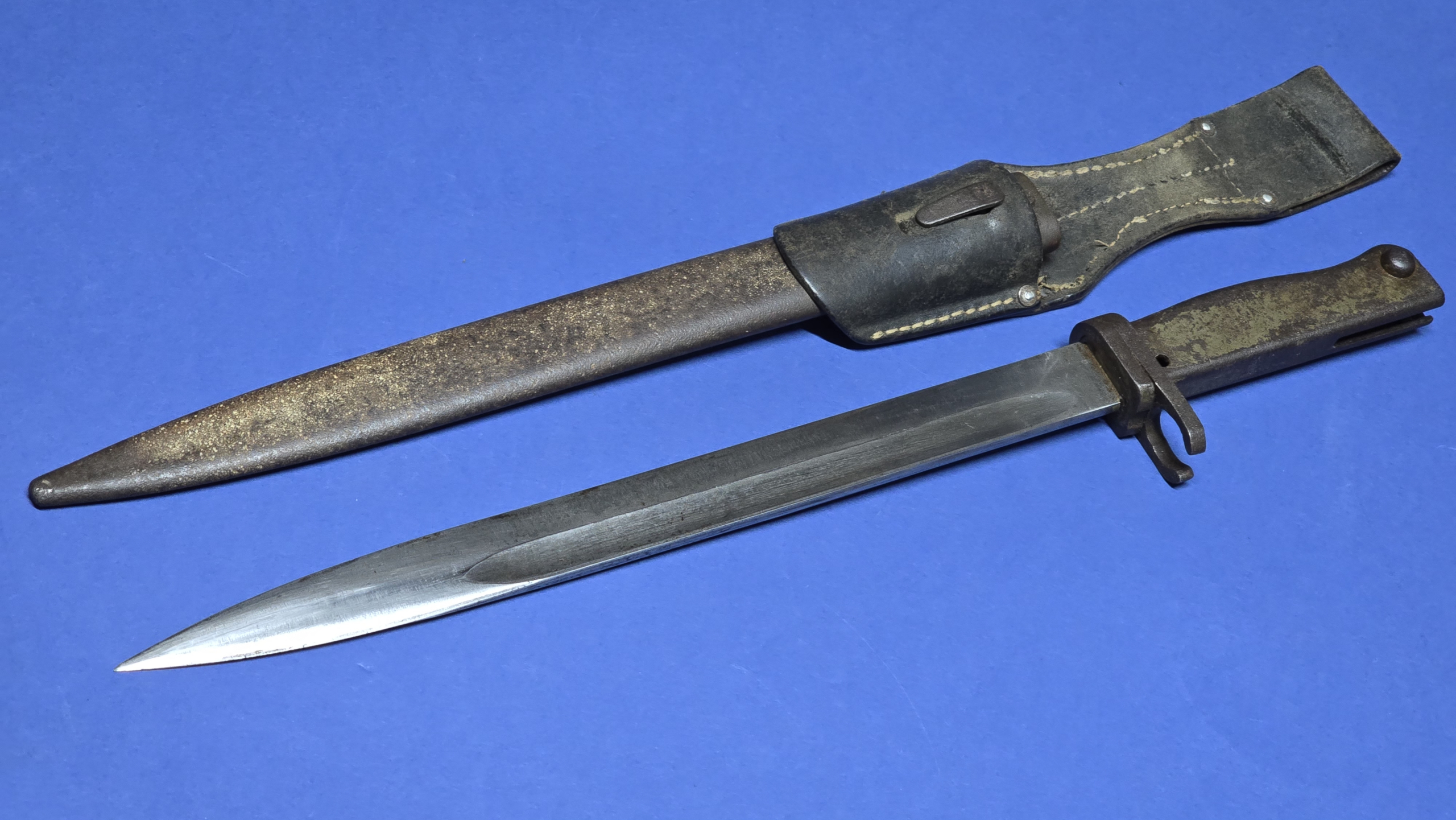 These bayonets were produced in numerous patterns and constructions, often lacking maker marks, with functionality prioritised over appearance. Originally finished with painted surfaces rather than bluing, ersatz bayonets represent a stark reflection of wartime necessity and industrial improvisation, making them an important and increasingly appreciated field of collecting today.