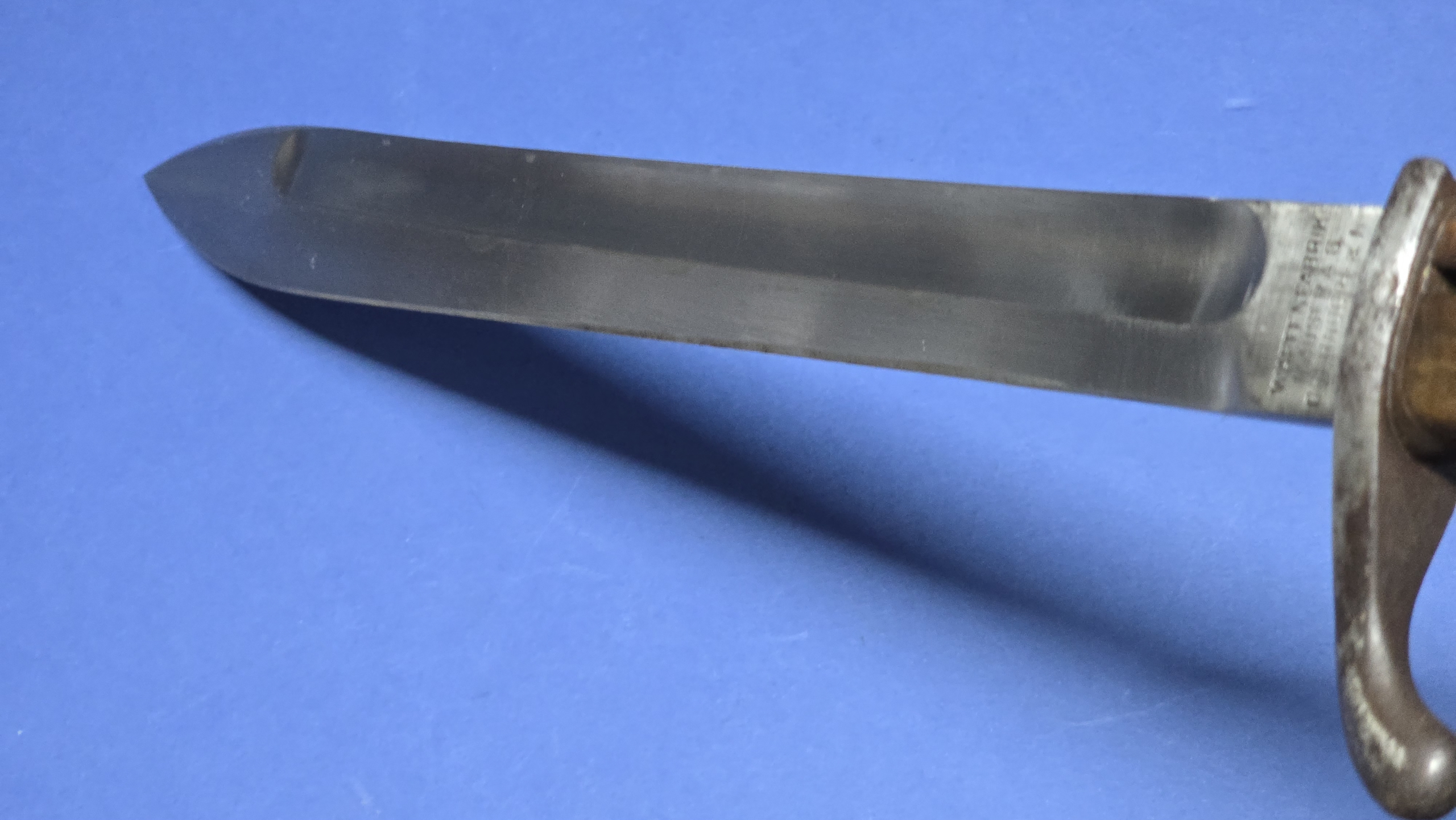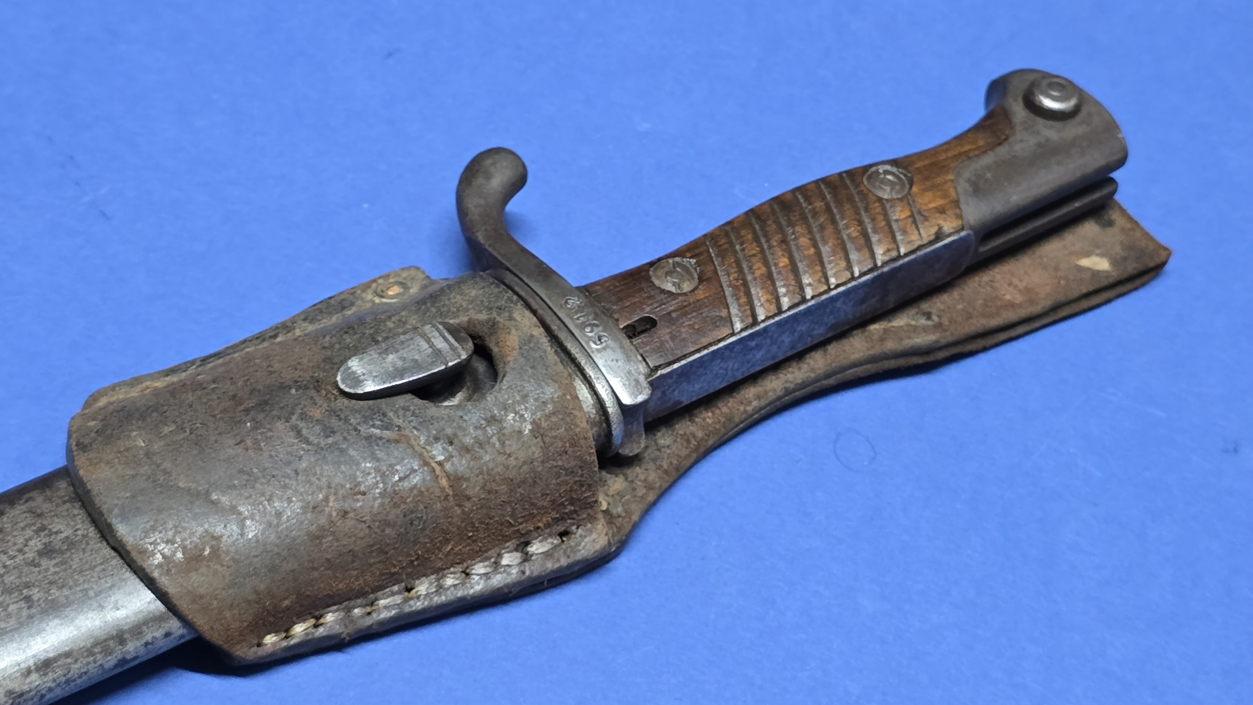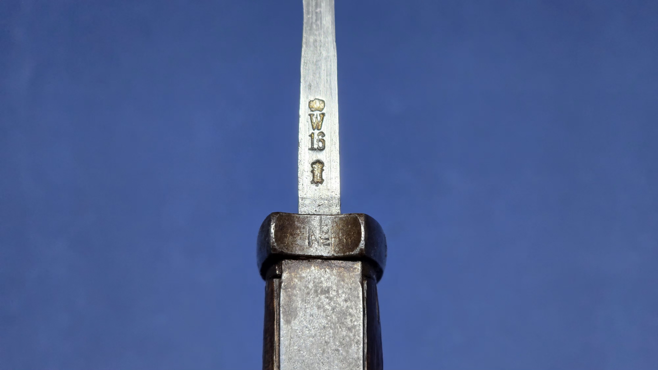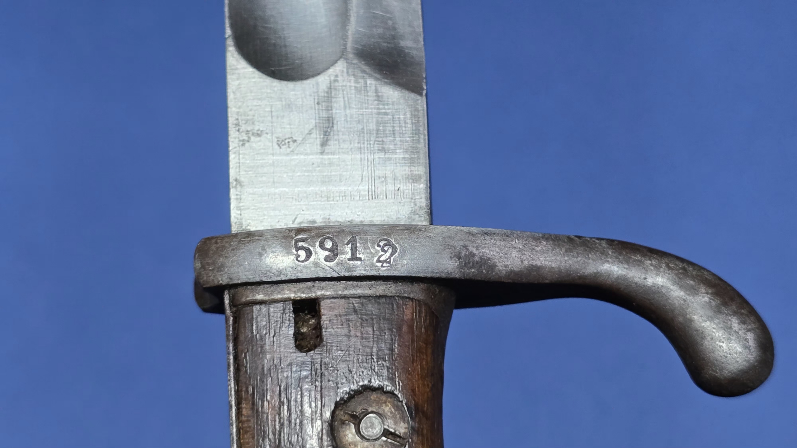 On the crossguard we have the serial number 5912. The “2” is more lightly struck than the other digits. This may be related to refurbishment work carried out during the post-war reissue period, when many WWI bayonets were reworked for continued service.