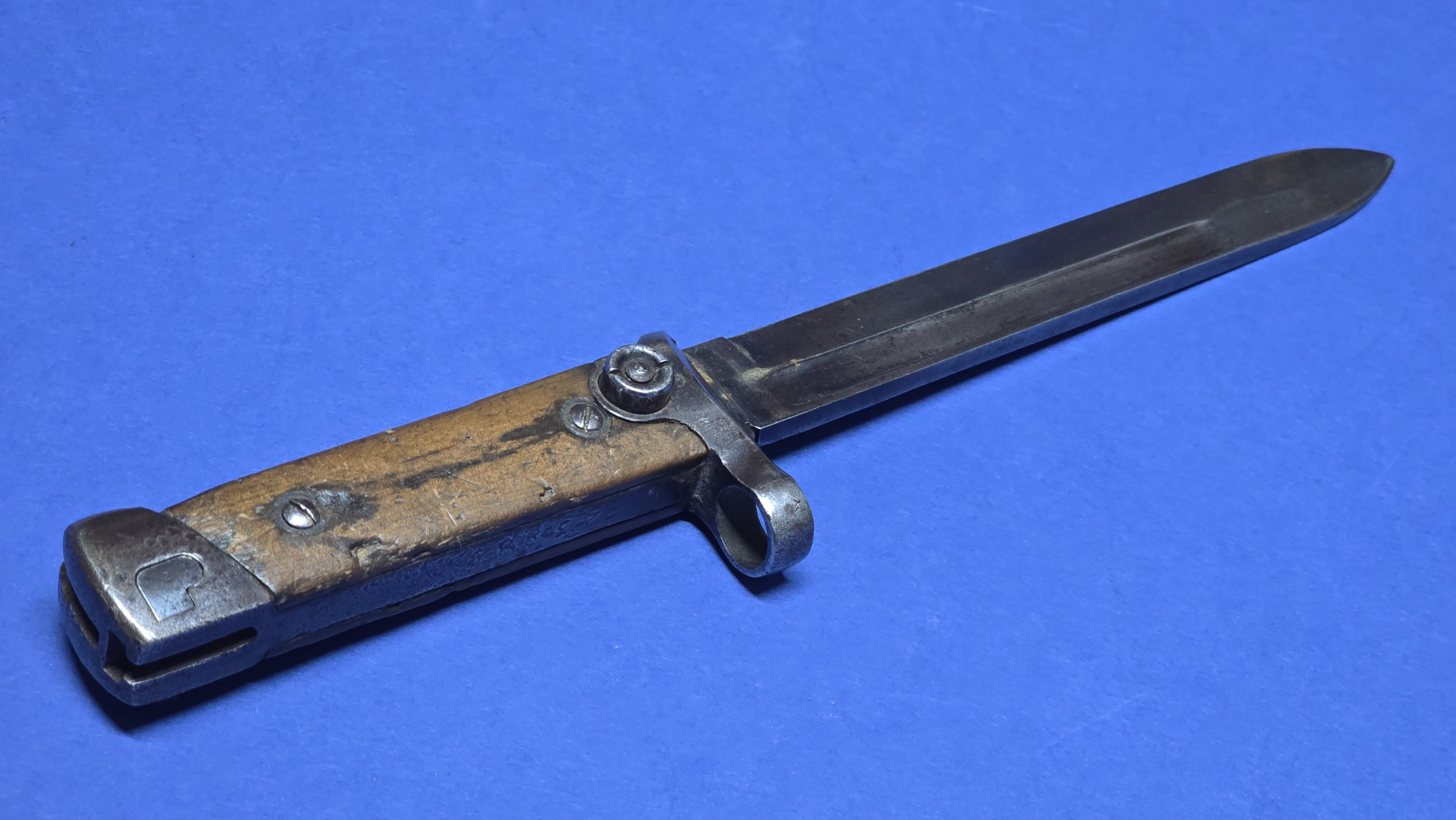 A scarce and interesting Italian folding bayonet designed for the Mannlicher–Carcano Model 1891/38 rifle. This pattern was engineered to remain attached to the rifle and fold neatly alongside the fore-end when not in use. Because of this design, many examples encountered today are found without their original scabbards, as the bayonet typically remained fixed to the weapon and the separate scabbards were often lost or discarded over time.