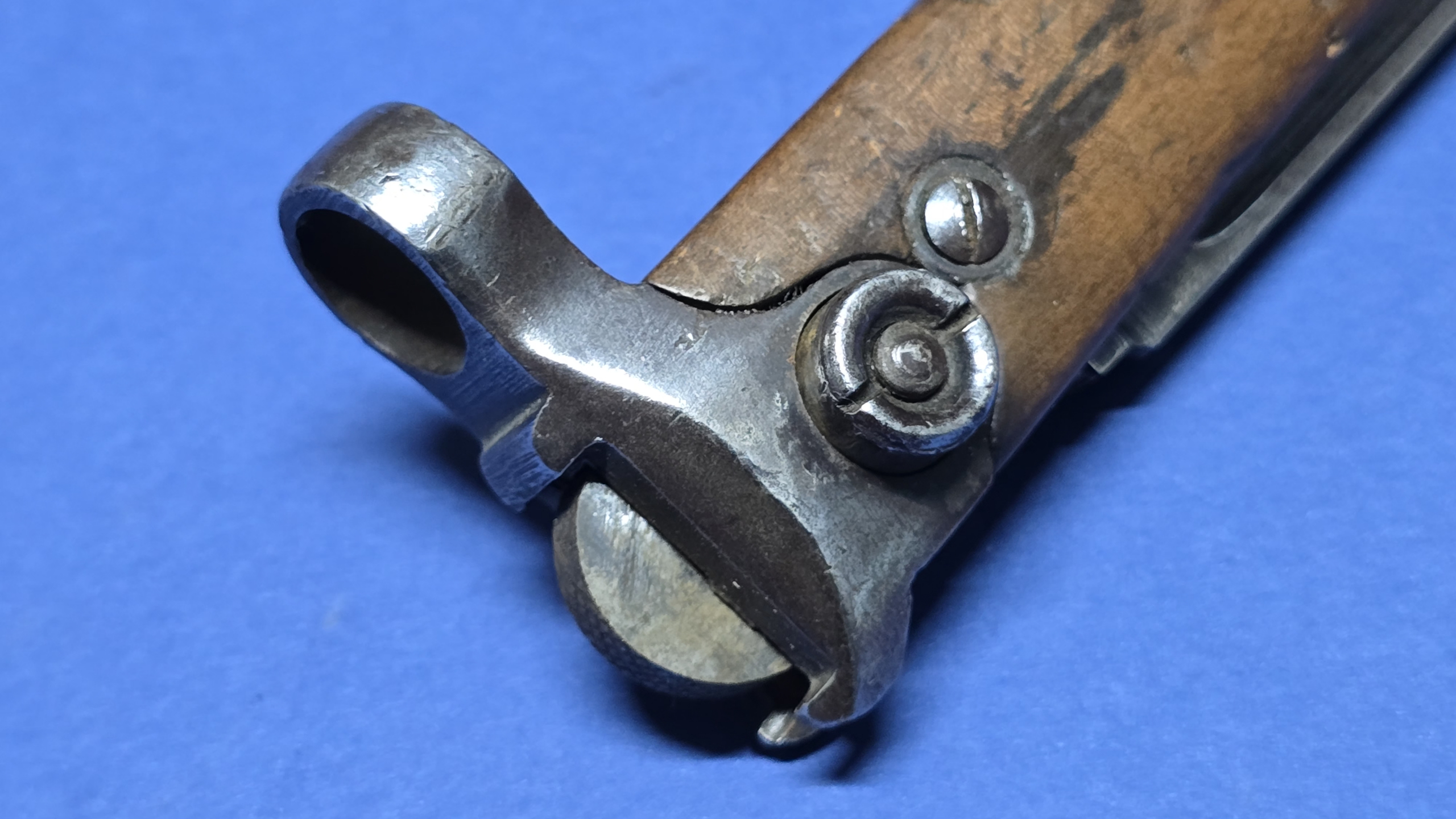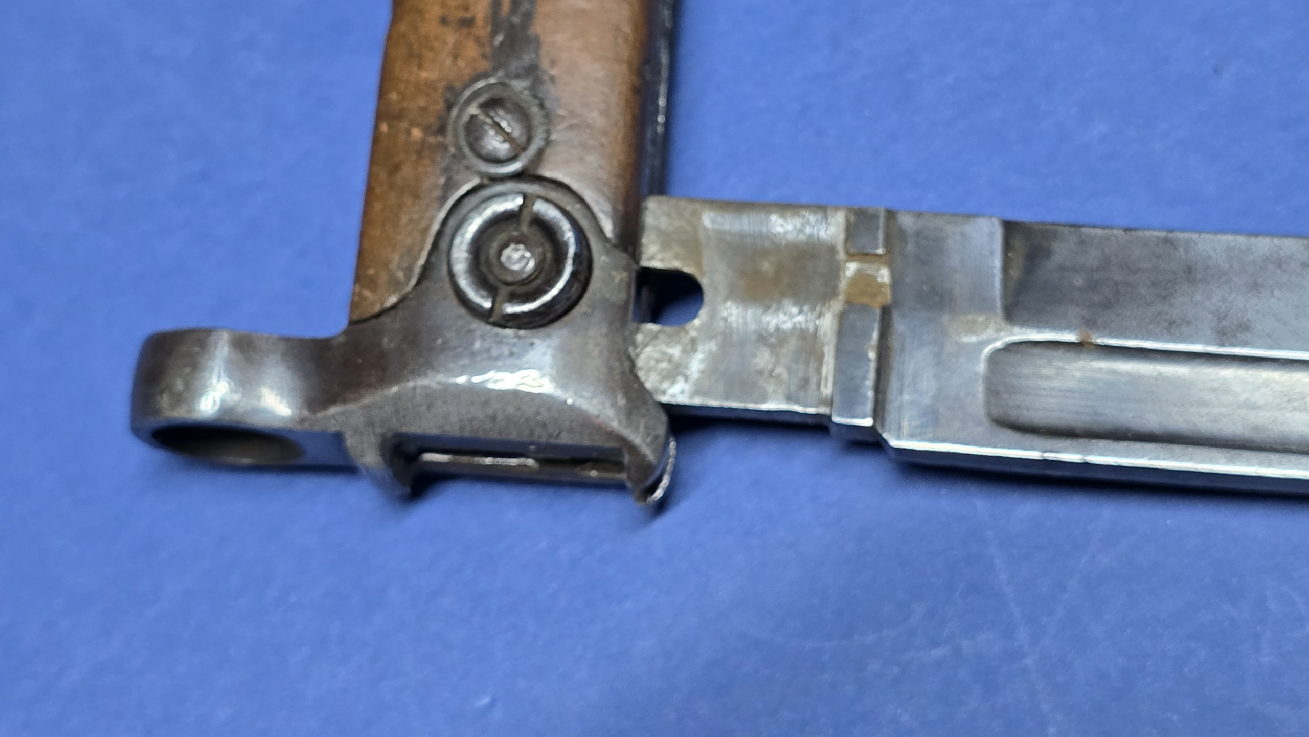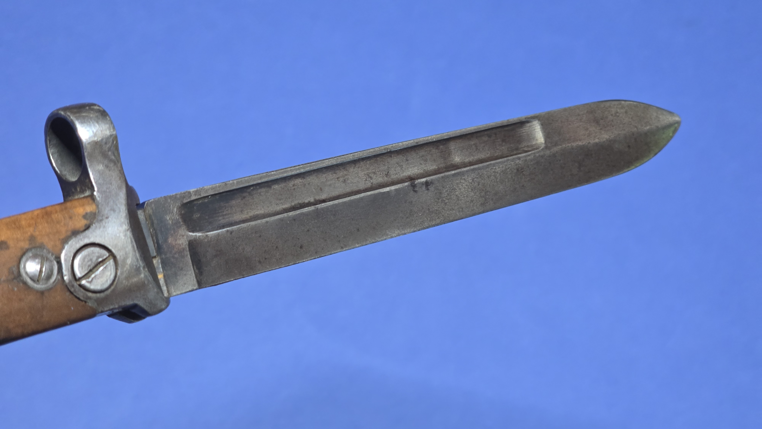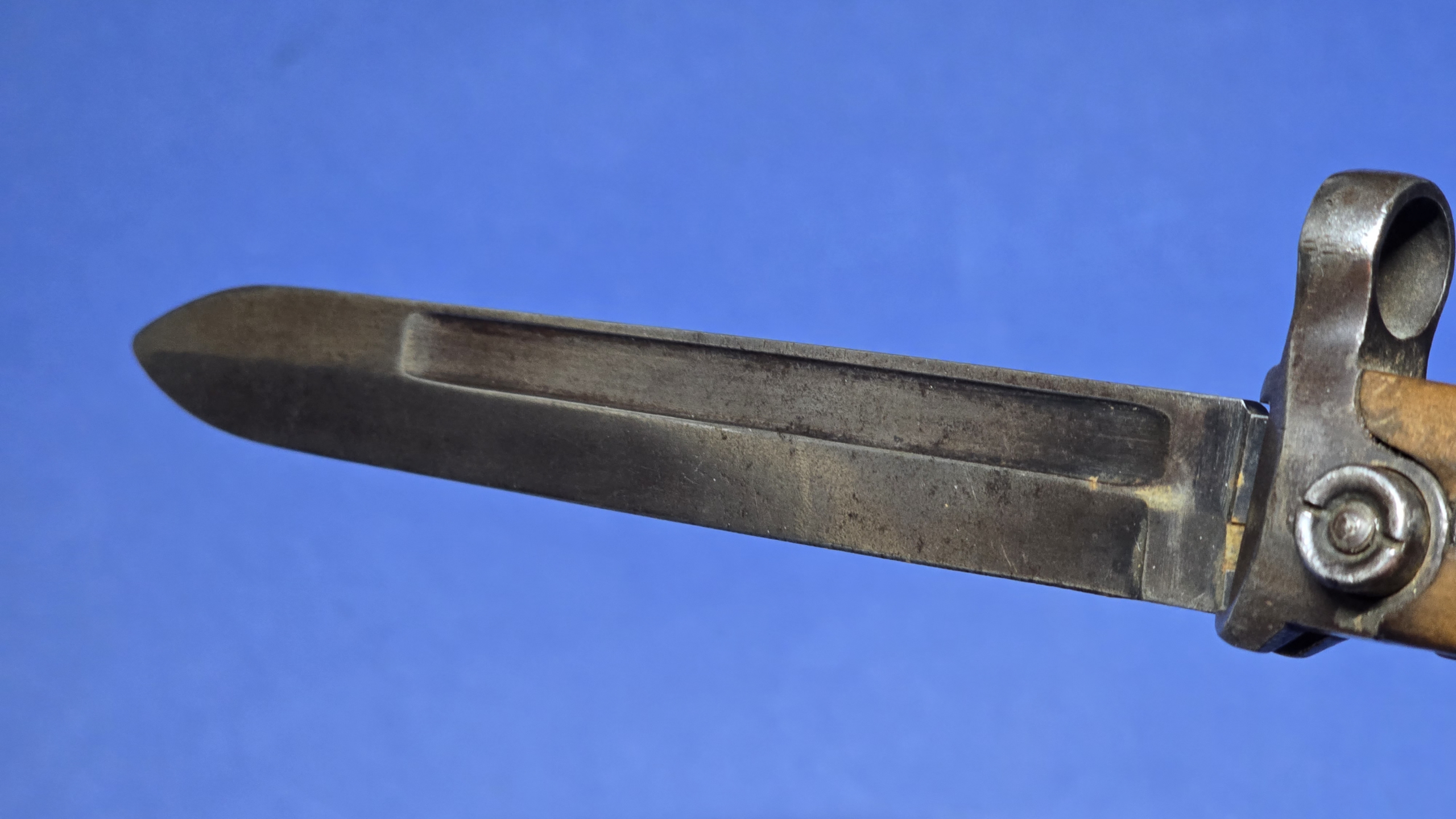 The bayonet carries its original narrow knife blade with a fuller running along each side. The blade remains clean and bright overall. It appears to have seen period sharpening, though it does not show the heavy signs of crude post-war sharpening sometimes encountered. The blade is best described as an honest service example, structurally sound and still presenting well.