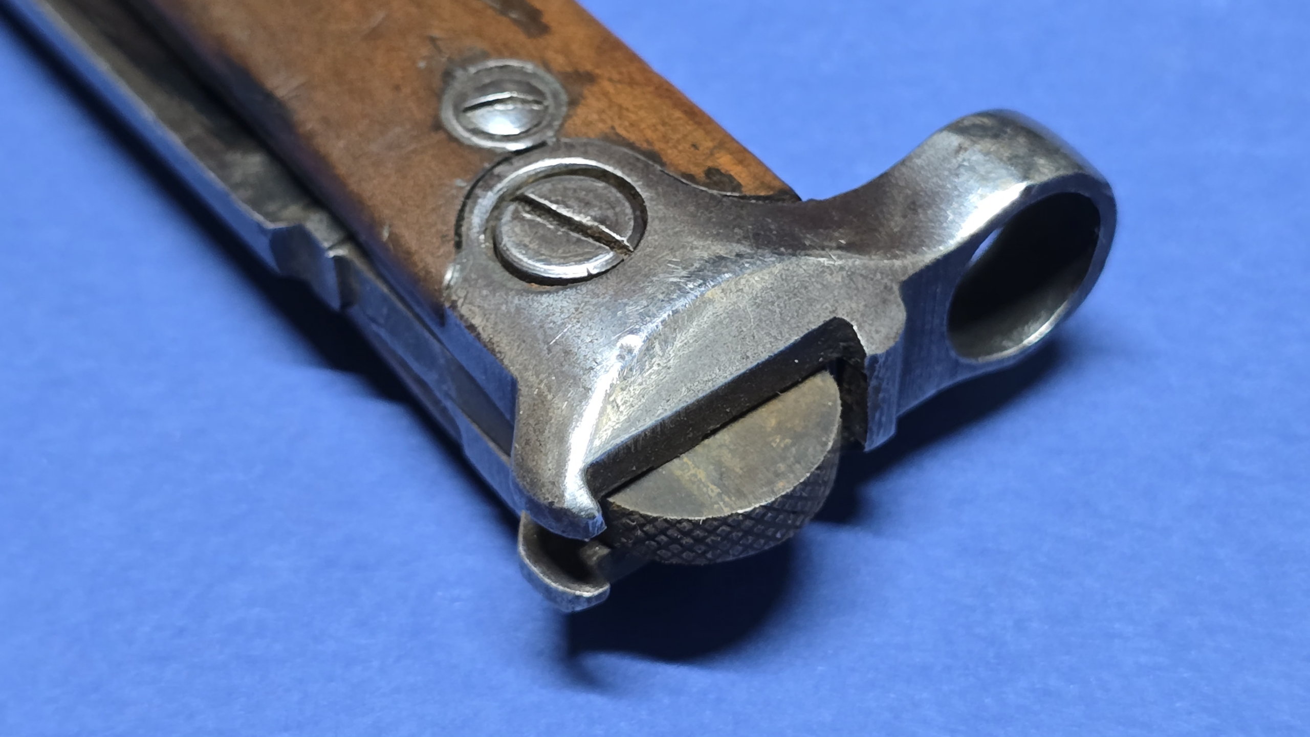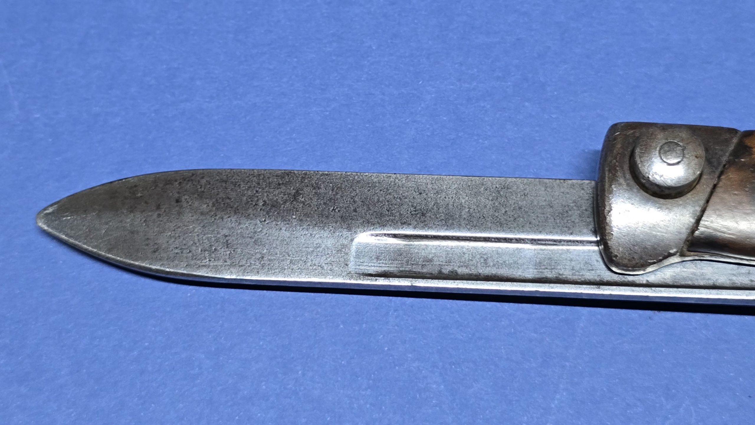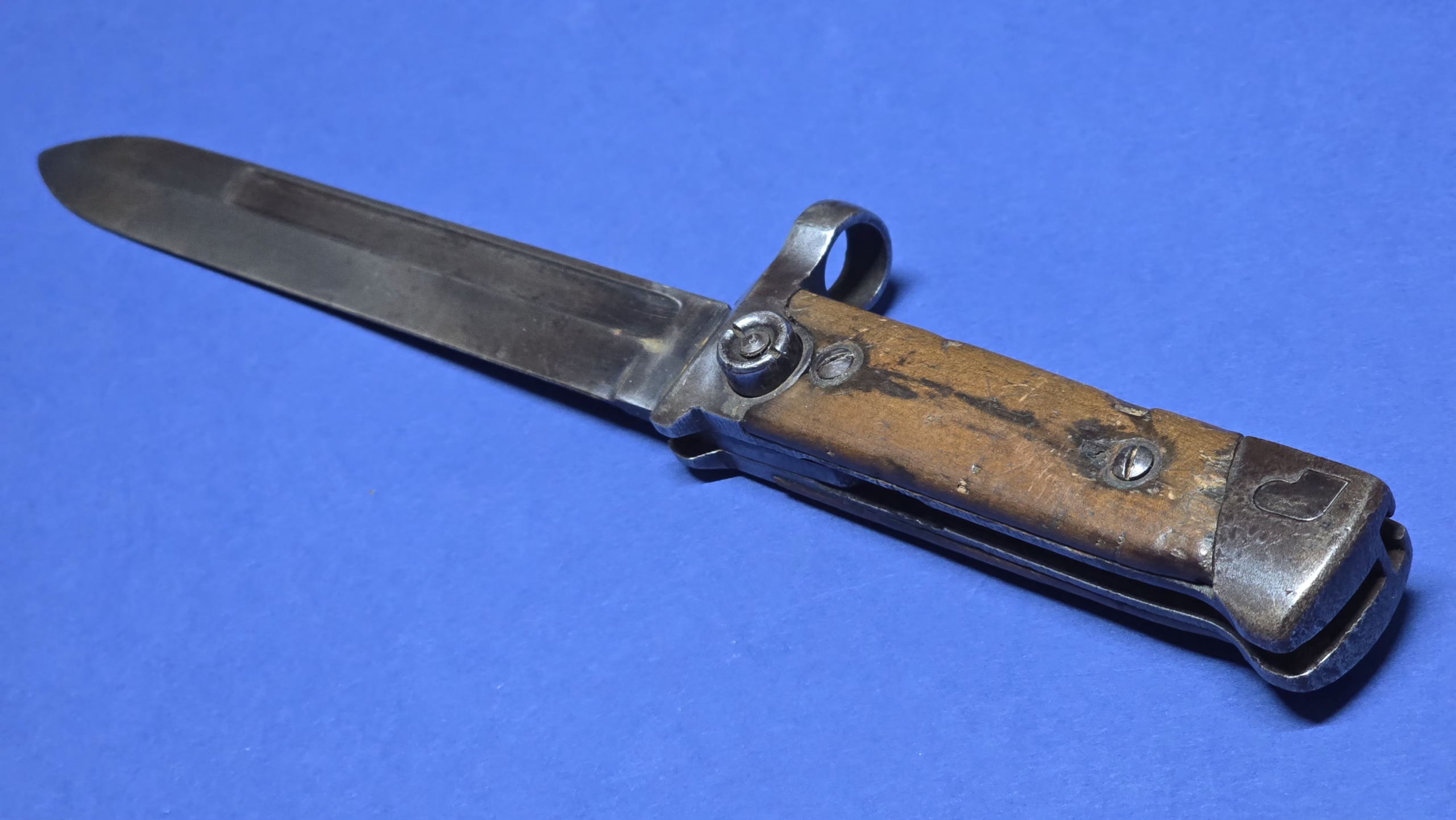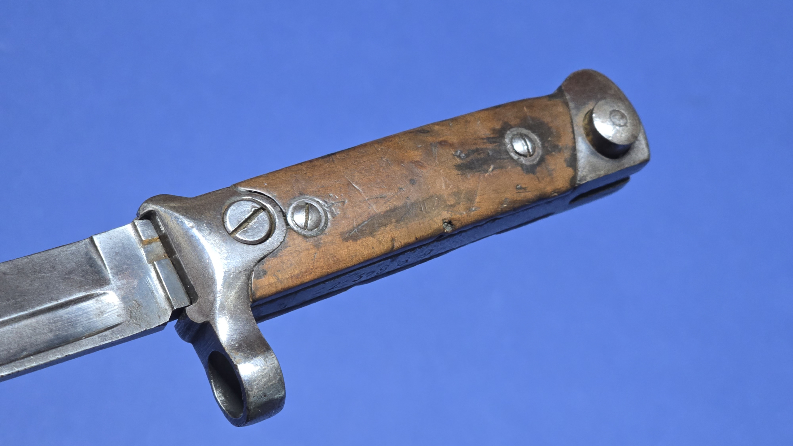 The bayonet carries its original narrow knife blade with a fuller running along each side. The blade remains clean and bright overall. It appears to have seen period sharpening, though it does not show the heavy signs of crude post-war sharpening sometimes encountered. The blade is best described as an honest service example, structurally sound and still presenting well.