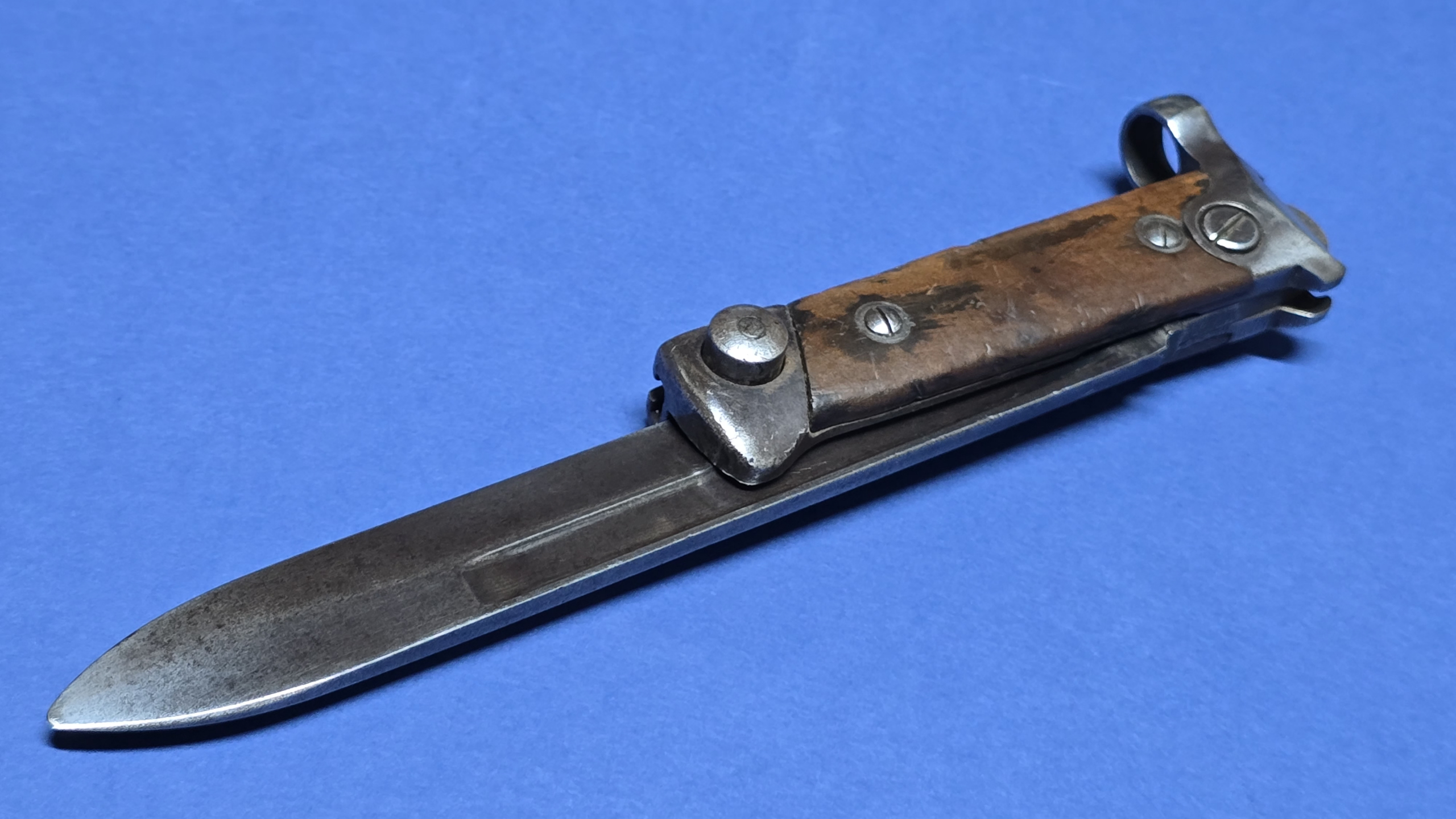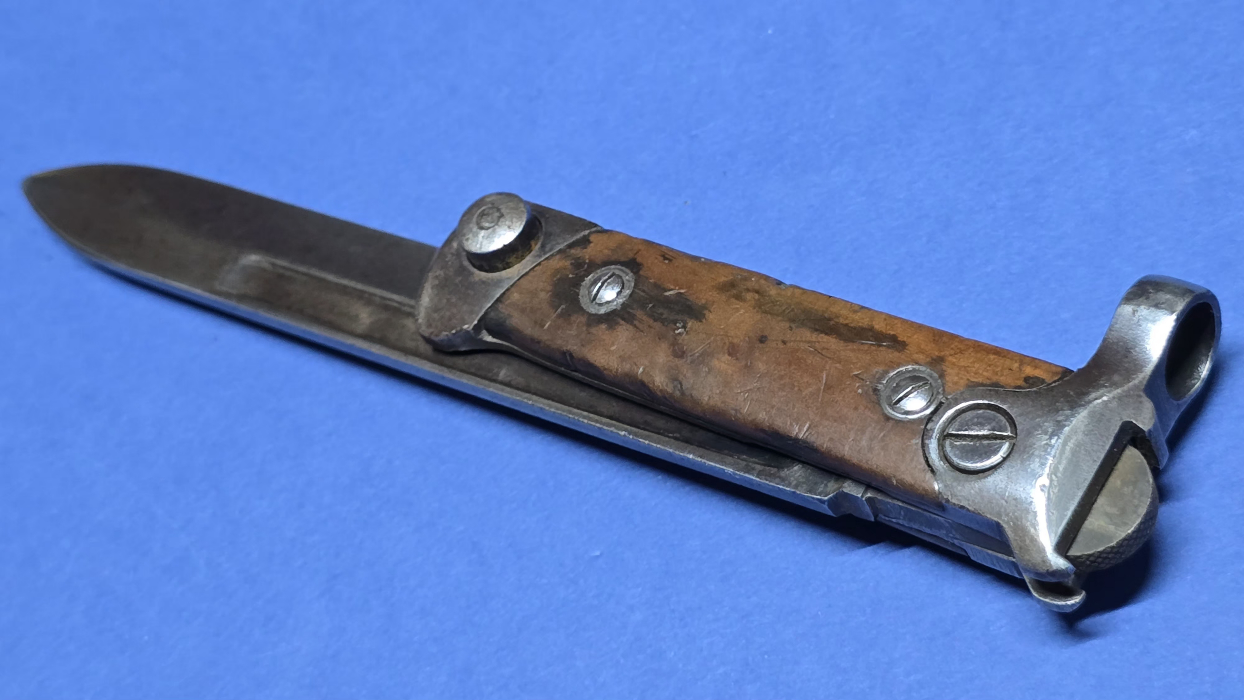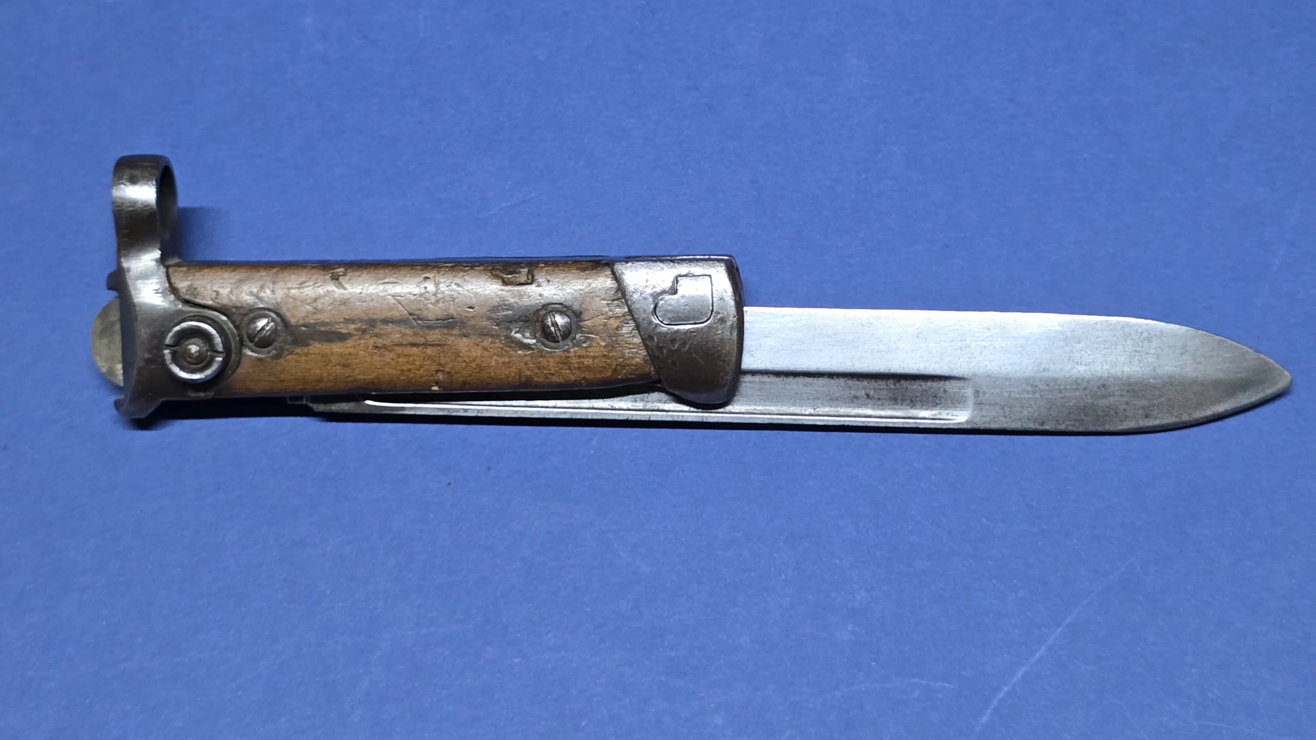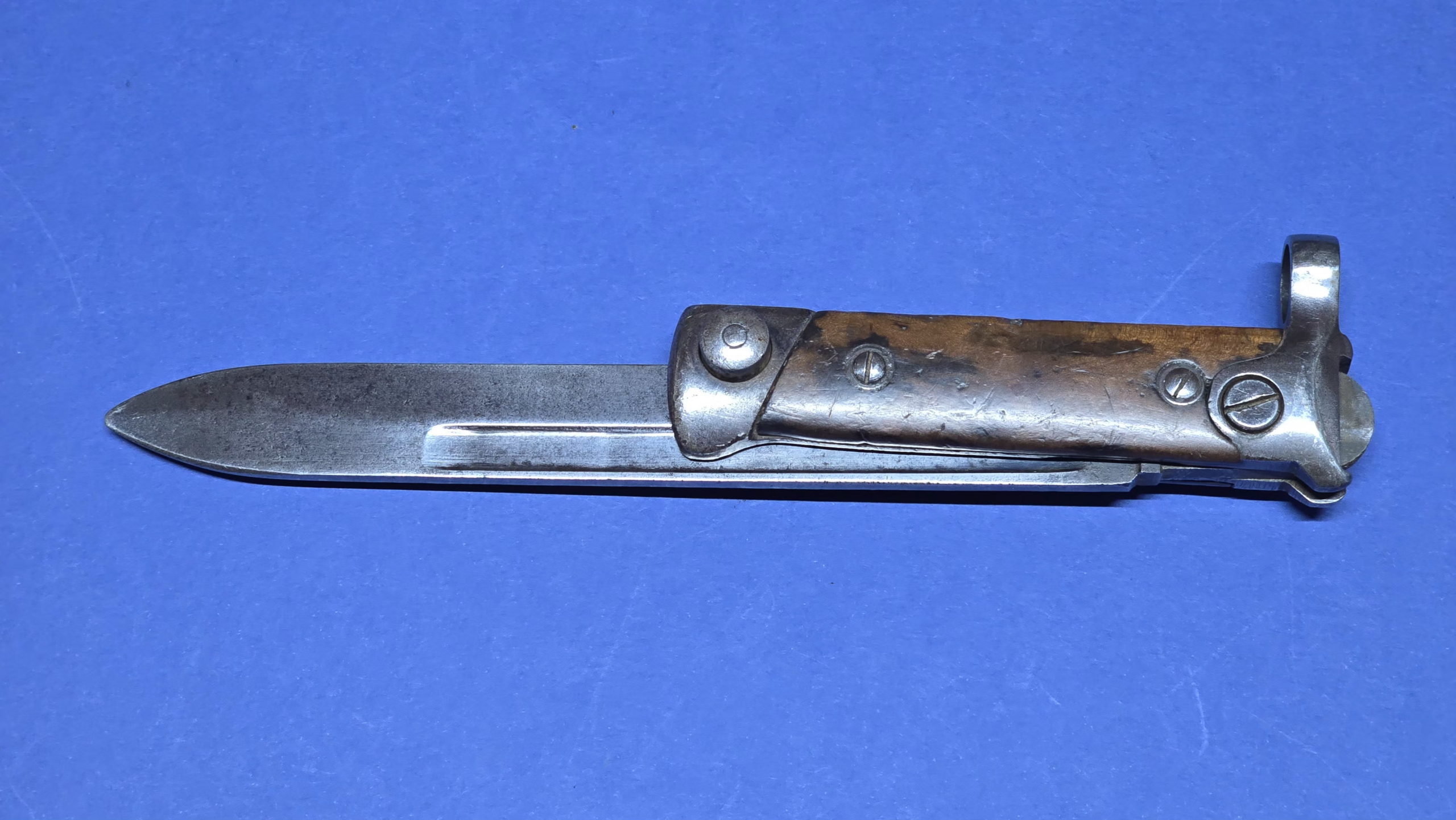 This is a compact and clever little design typical of late Carcano development. Compact and well engineered, these folding bayonets represent an interesting variation within the Carcano bayonet family and are always sought after by collectors of Second World War Italian militaria.