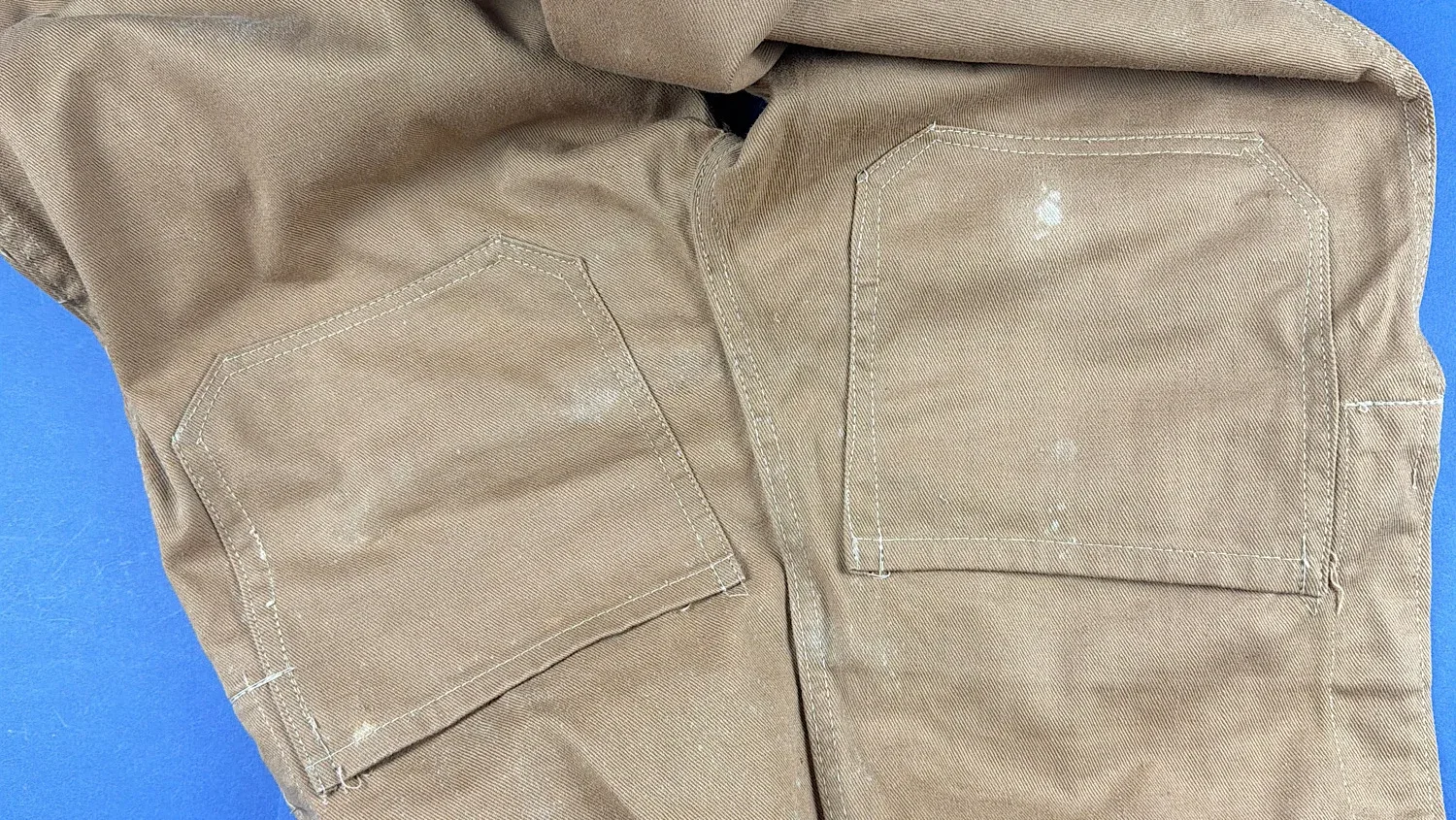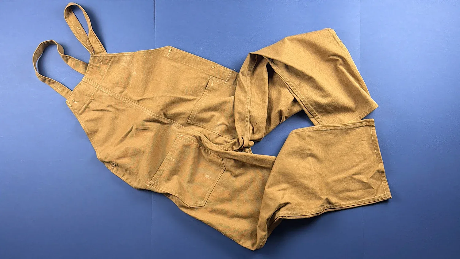 This is not a theatrical or reproduction piece, but an honest working garment. Signs of genuine agricultural use remain visible, including light staining, small paint or lime flecks, and minor rust specking near the lower leg. There is slight stress visible to one strap stitching area, but it remains secure and original. All buttons are present and period correct. There are no modern alterations or repairs evident. The overall structure is sound, and the garment displays well while retaining authentic period character.