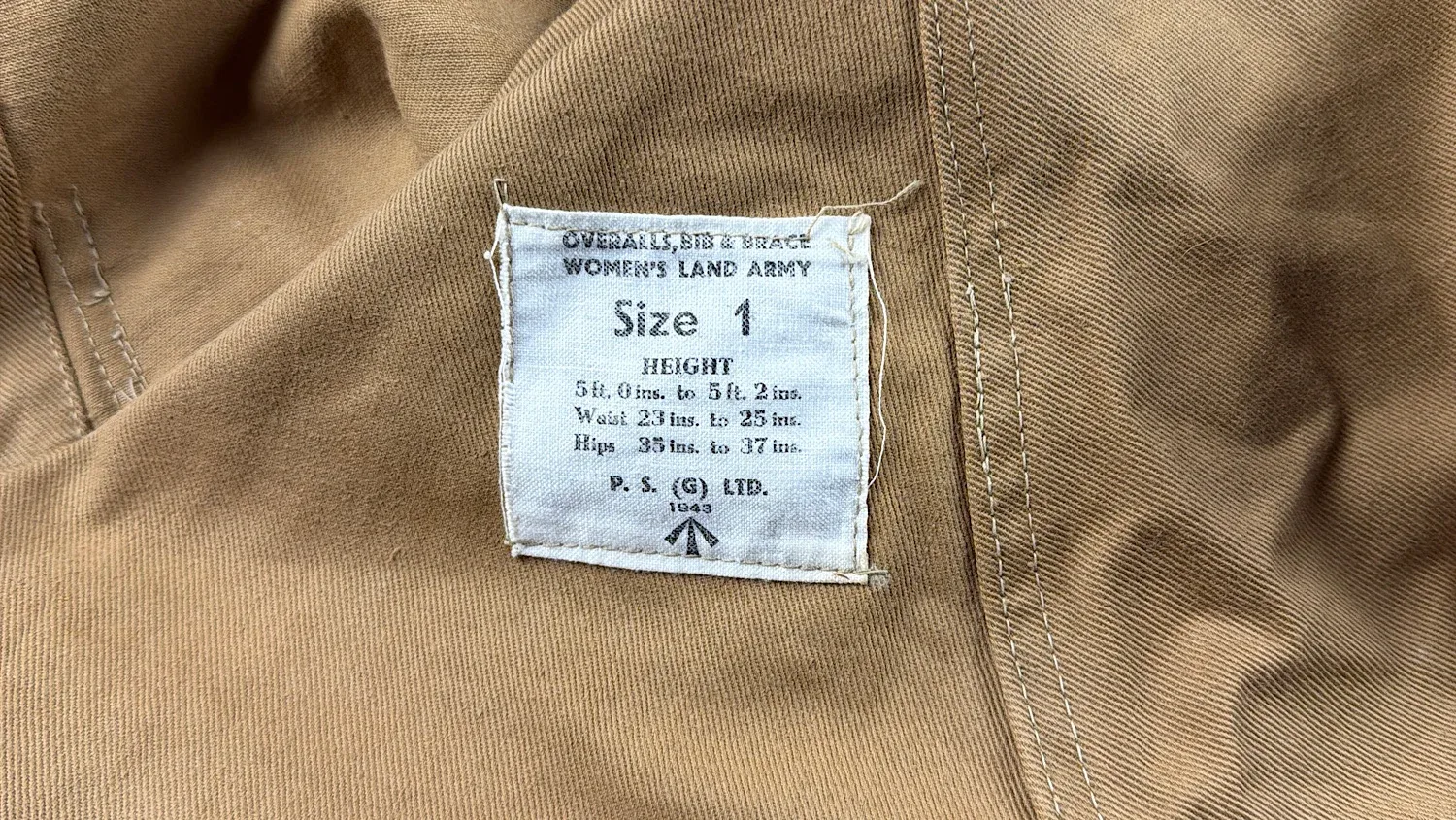 This is an original and clearly dated 1943 Women’s Land Army bib and brace overall, issued for use during WW2 and worn as part of Britain’s agricultural war effort on the Home Front.