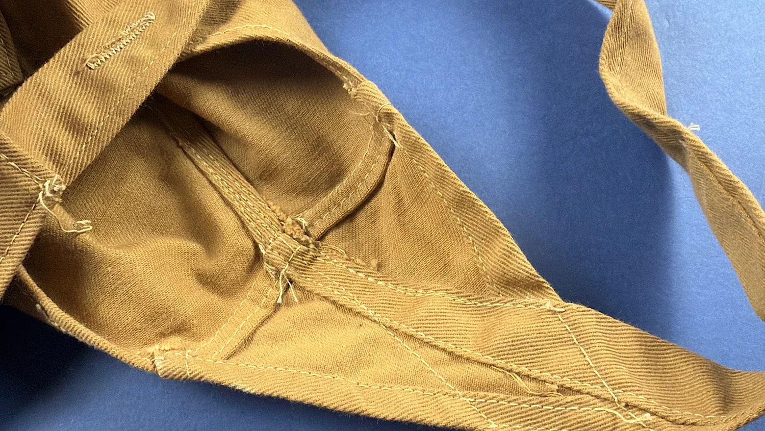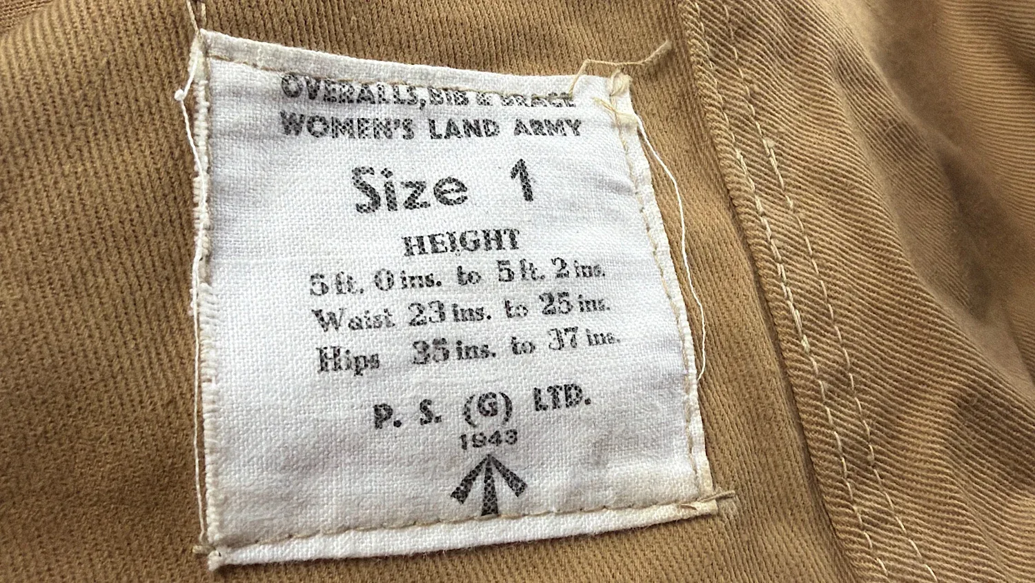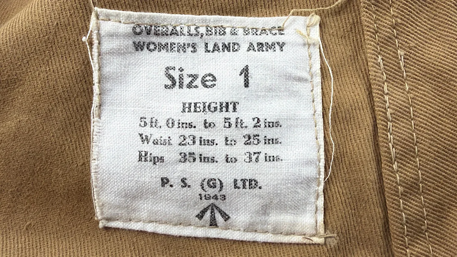 The interior retains its original woven contract label reading “Overalls, Bib & Brace – Women’s Land Army”, Size 1, and dated 1943. The date places this example firmly in the middle years of the war, at a time when Britain was still heavily reliant on domestic food production and agricultural labour. The construction is entirely consistent with wartime government issue: heavy cotton drill fabric, reinforced strap stitching, twin rear patch pockets, and original brown composite utility buttons typical of mid-war production.