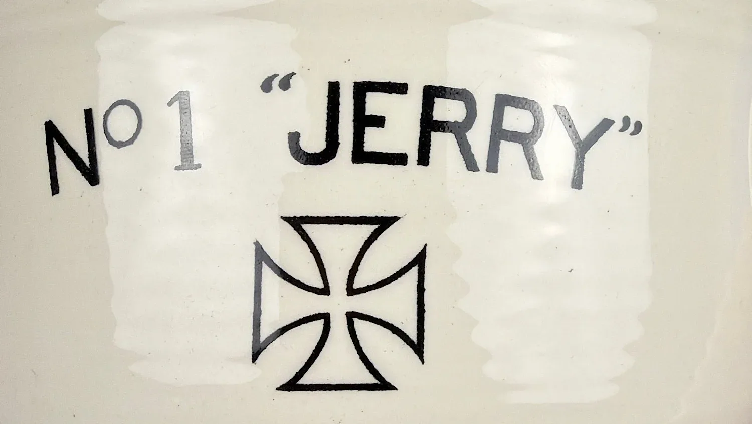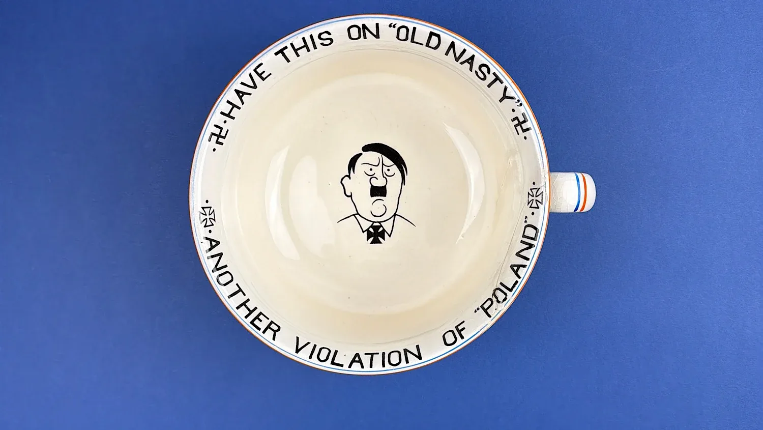 Made in England and boldly decorated, the interior features a caricature of Adolf Hitler positioned deliberately at the base of the bowl, while the rim carries the slogan: “Have This on ‘Old Nasty’ – Another Violation of ‘Poland’” alongside references to “No.1 ‘Jerry’” and Iron Cross motifs. The wording directly references Germany’s invasion of Poland in September 1939, anchoring the piece firmly to the earliest phase of the conflict.