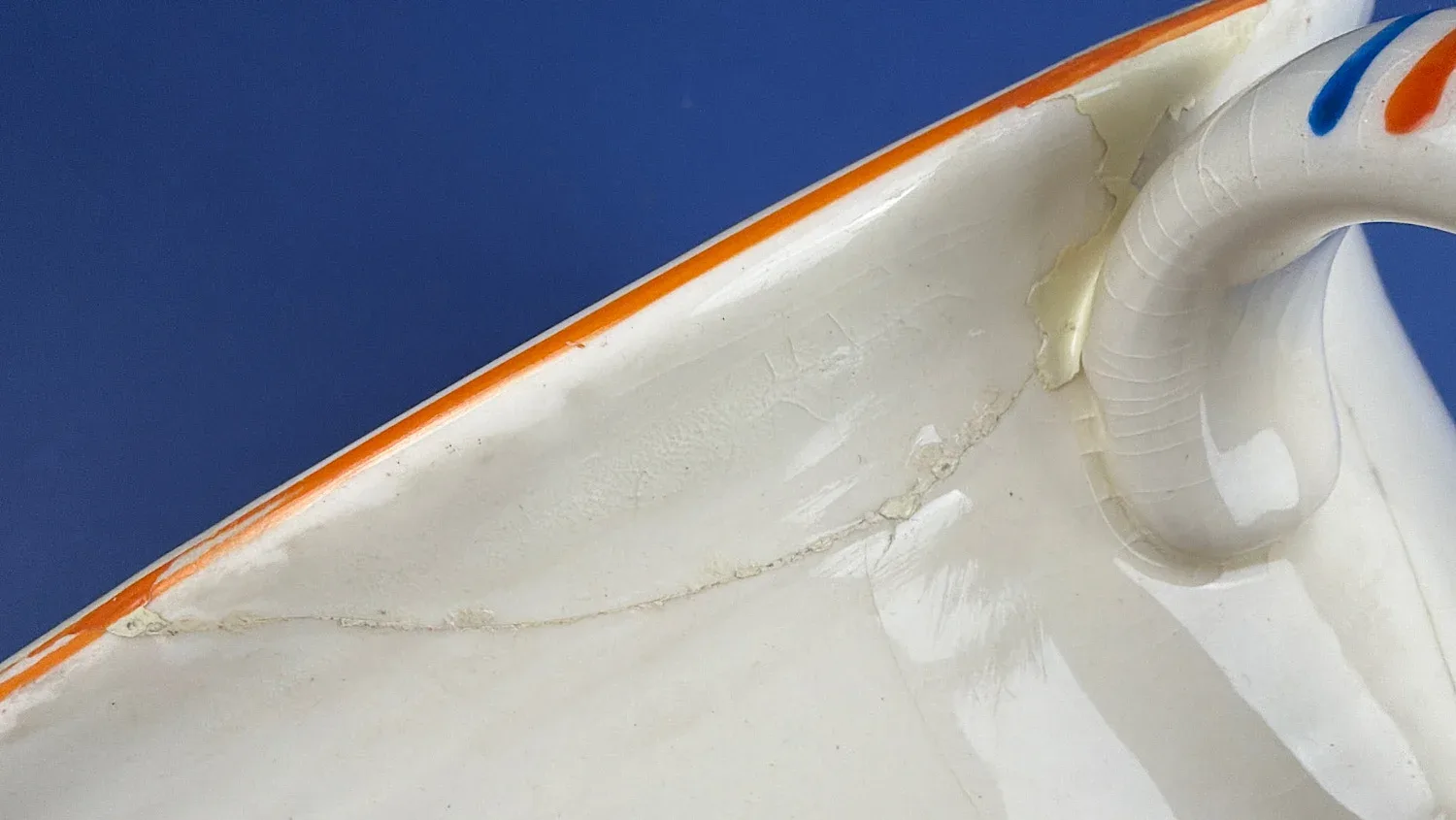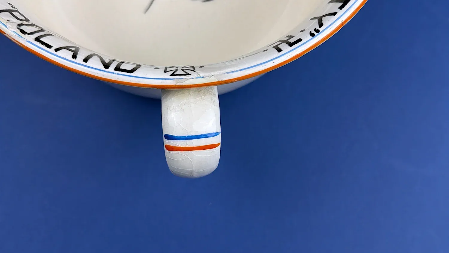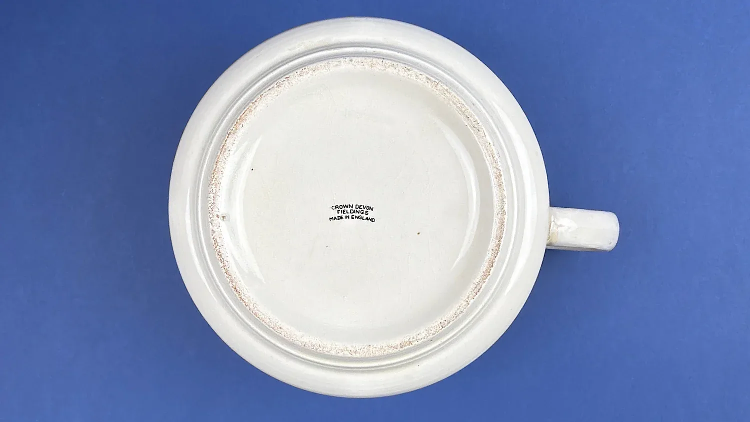 Full disclosure, it’s not in perfect condition. As the photos show, there is some damage near the handle however, it has been repaired rather well. The crazing to the glaze is not damage but natural ageing, commonly seen on period glazed ceramics. Aside from the repaired damage though, this piece remains in lovely condition and would fit well (and cause a chuckle or two) in any Home Front Collection. A superb addition to any serious WW2 Home Front collection.