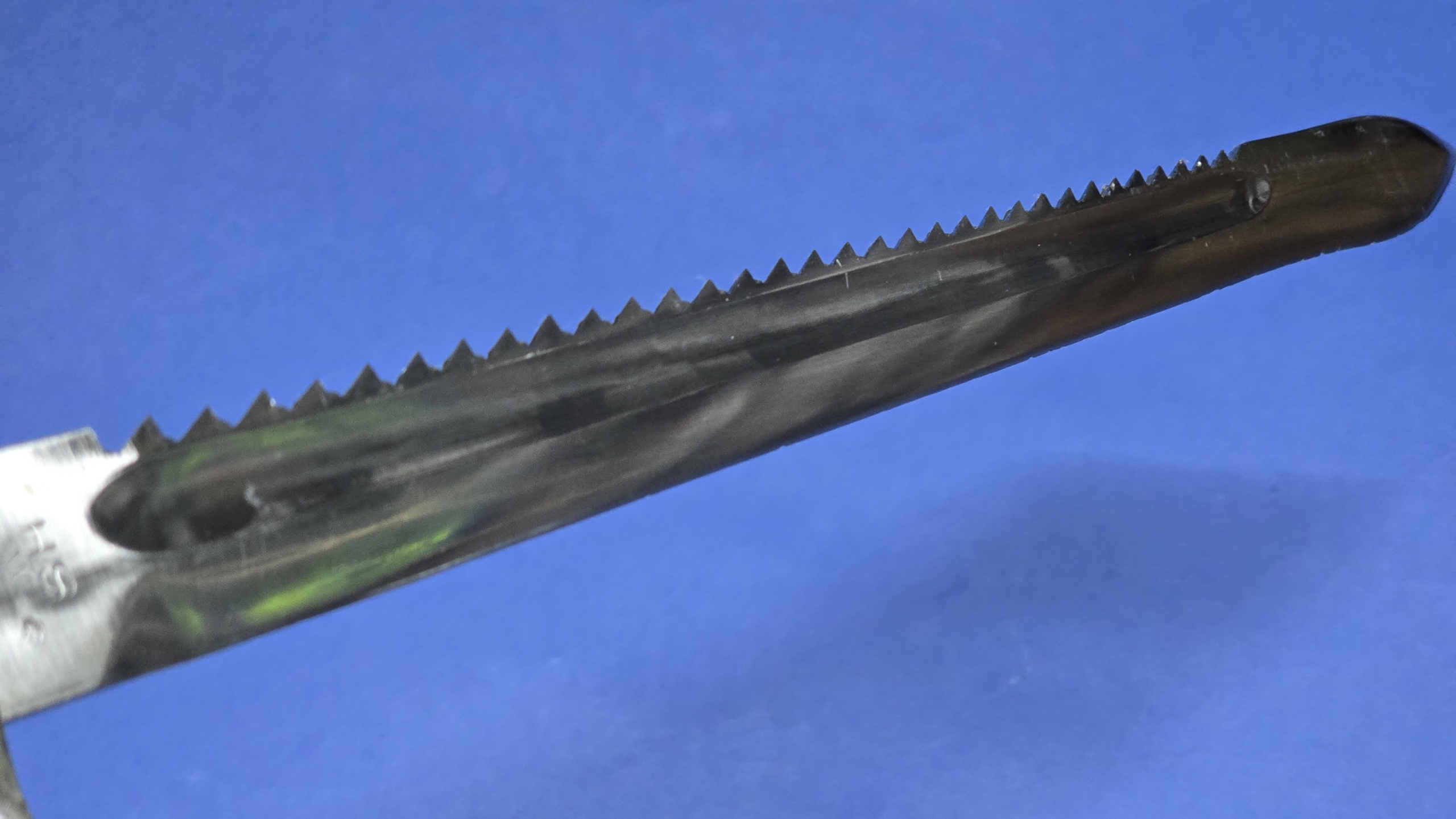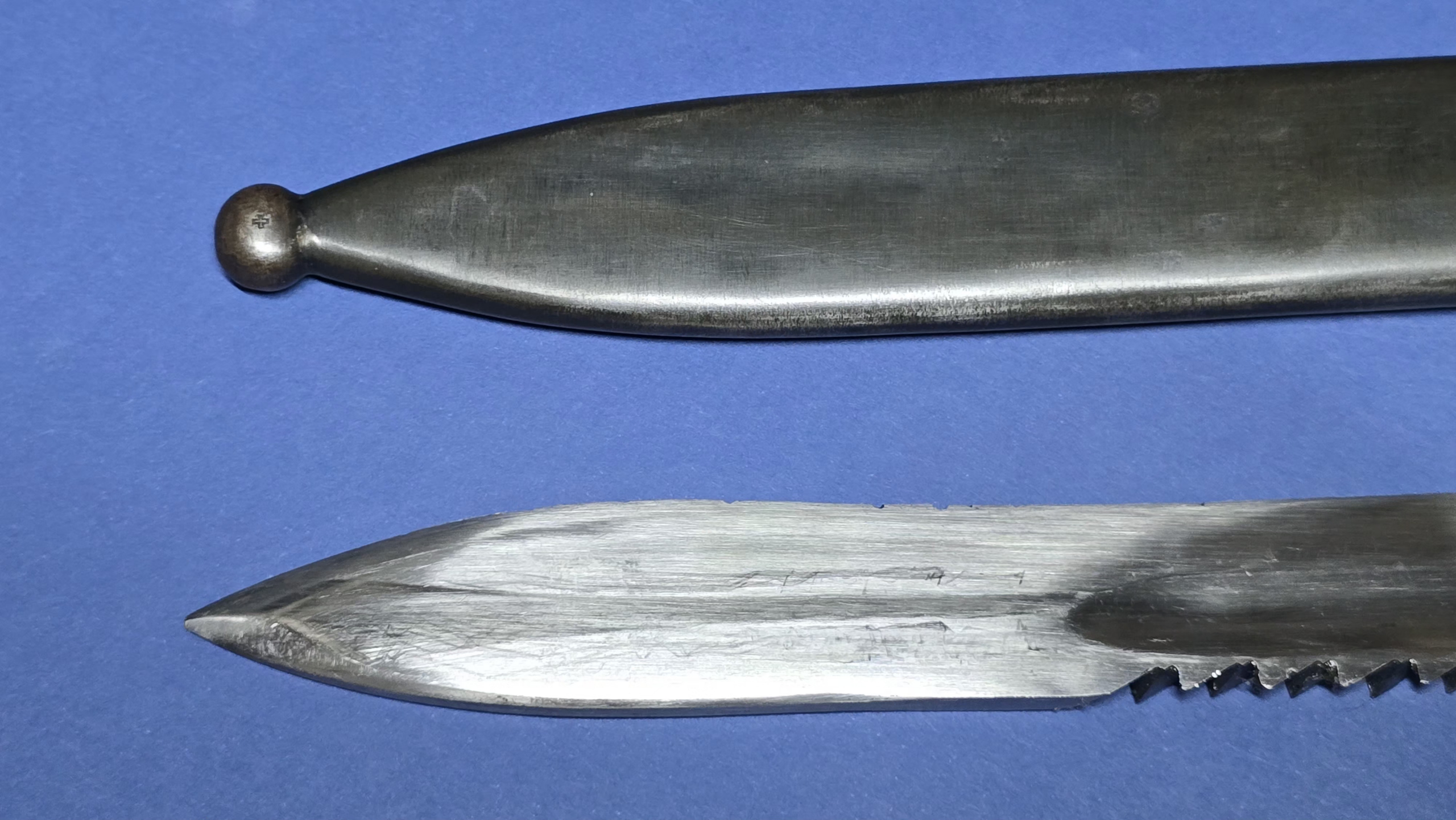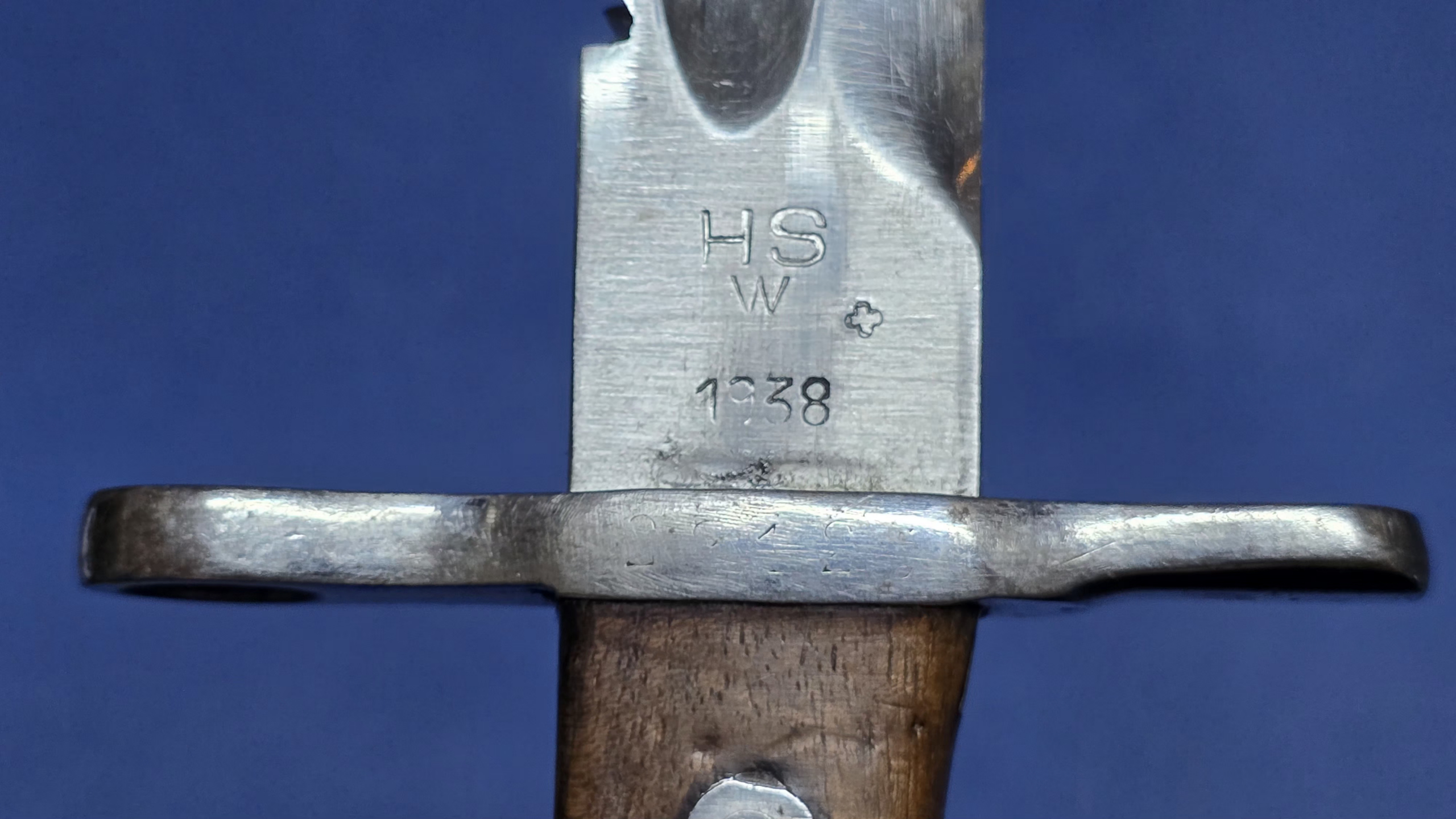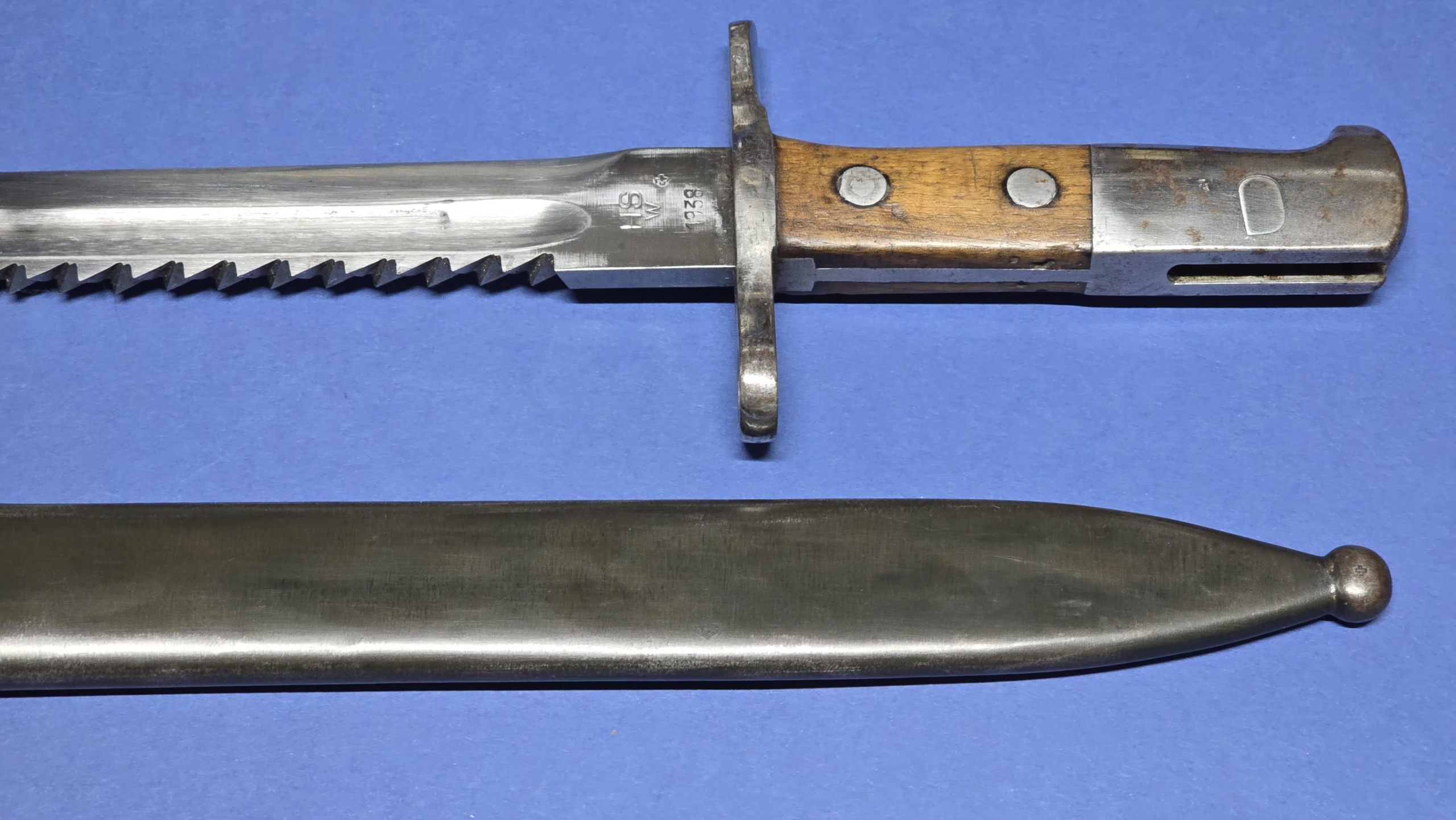 The blade measures approximately 480mm in length and features a single fuller running along the right side. The spine carries 32 pairs of short sawback teeth, giving the bayonet its distinctive pioneer appearance. The blade remains very clean and bright overall. At some stage the edge appears to have been sharpened, likely during service. Near the tip there are a few very small edge nicks which are minor and only noticeable on close inspection; these will be shown clearly in the photographs. The ricasso is marked HSW along with the Swiss cross inspection mark and the date 1938.