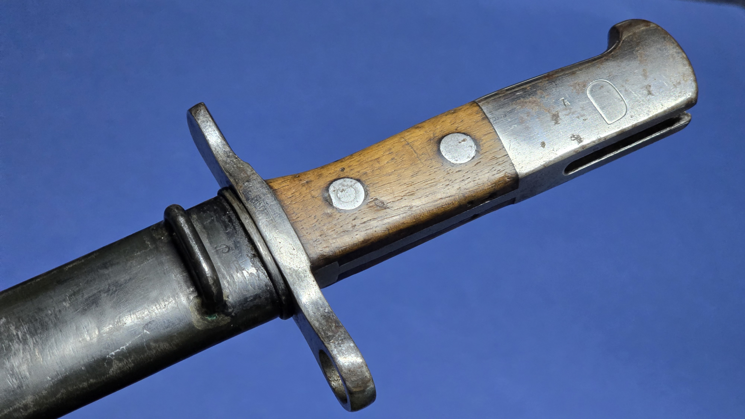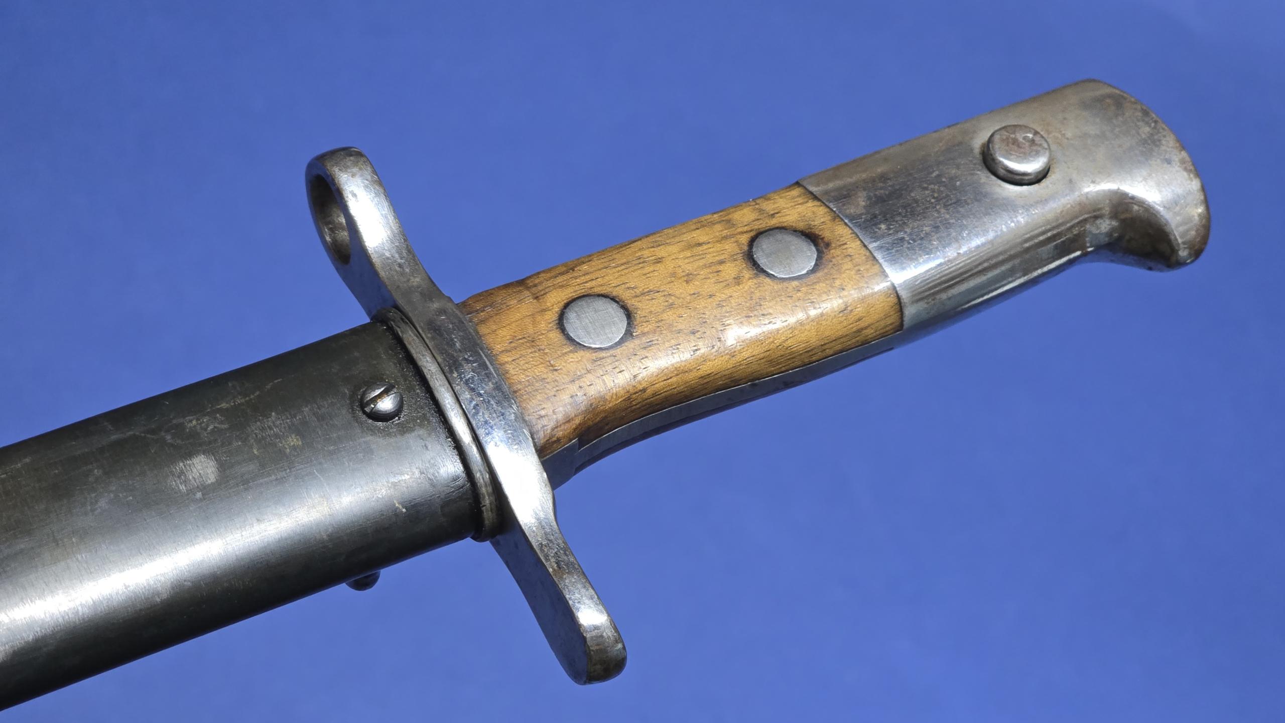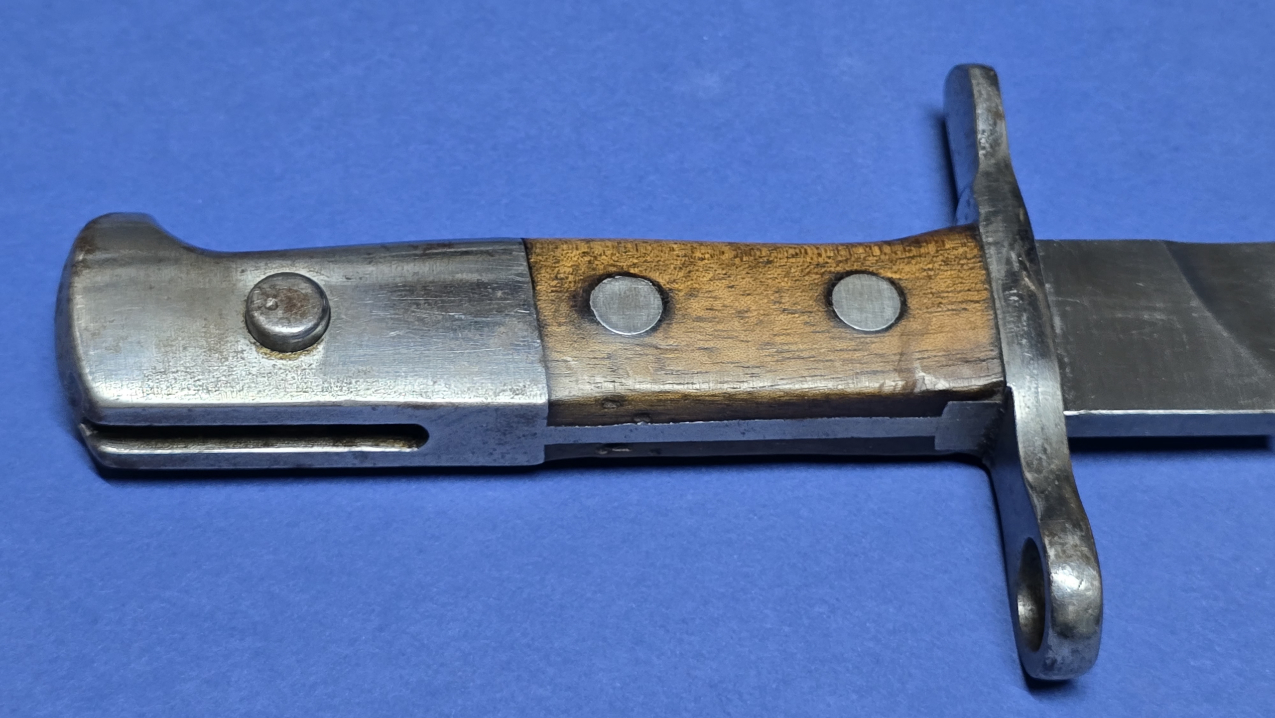 The hilt retains its light coloured wooden grips, believed to be walnut, and they remain in excellent condition. They are secured by the correct two large rivets passing through the tang. The rifle retaining button functions correctly. The bayonet is finished with the distinctive bird’s head style pommel typical of Swiss bayonets of this pattern.