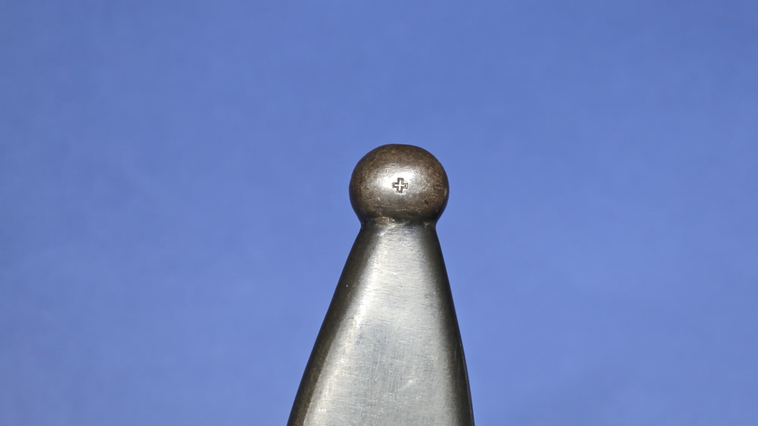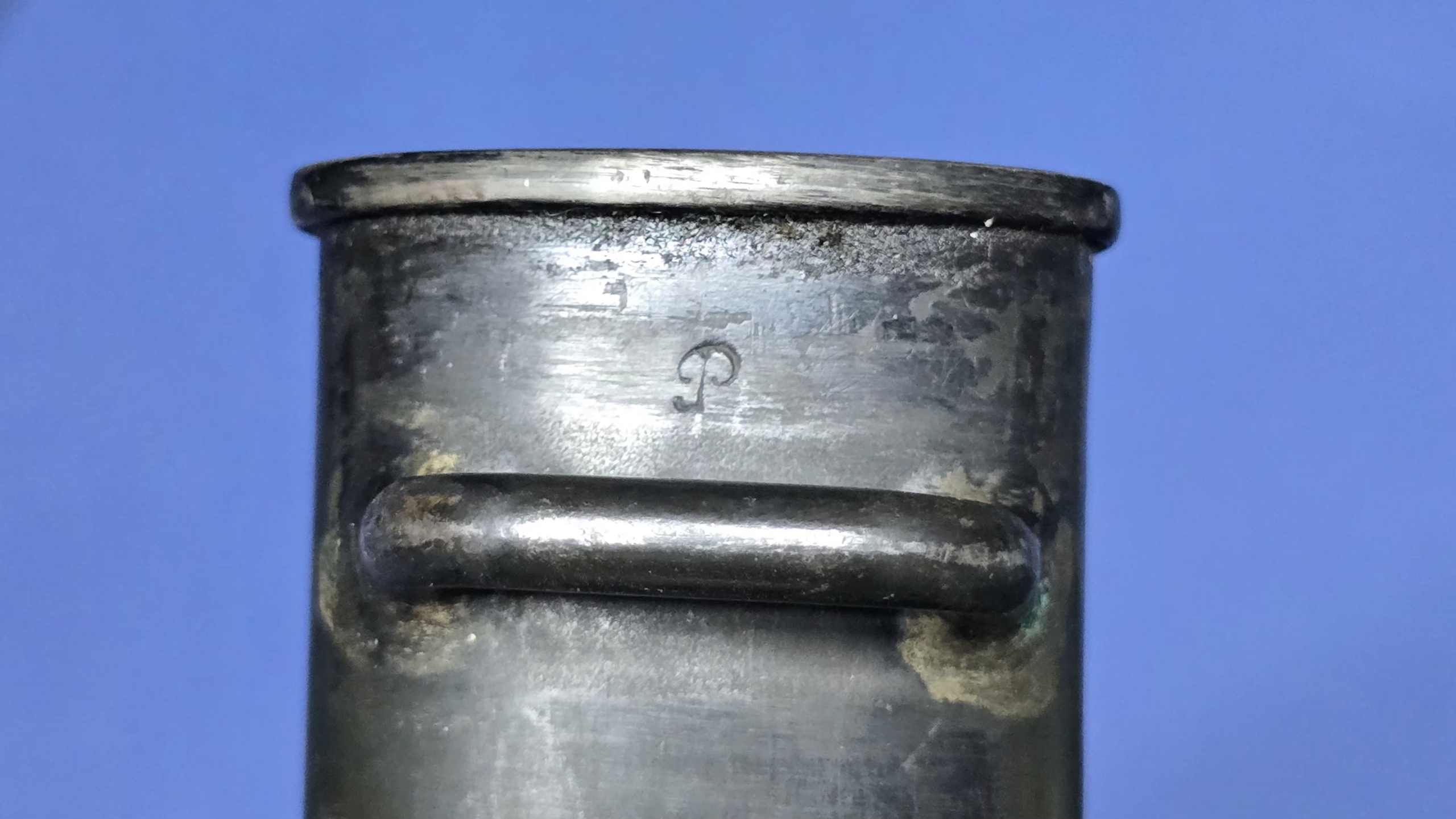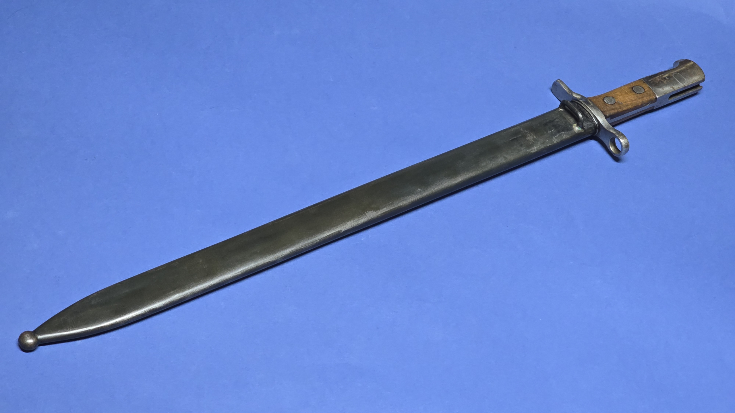 The bayonet is accompanied by its steel scabbard which remains in excellent condition overall. The ball finial carries the Swiss cross as commonly seen on Swiss scabbards. The original throat screw is present. The scabbard is stamped with the letter P near the throat and again on the throat itself. The scabbard retains a very good shape and condition. There is an extremely slight indentation to the rear which is so minor it is unlikely to show in photographs and can only really be detected when running a finger over the area. The bayonet fits the scabbard perfectly, locking in place with a satisfying snap and sitting snugly with no movement once inserted.