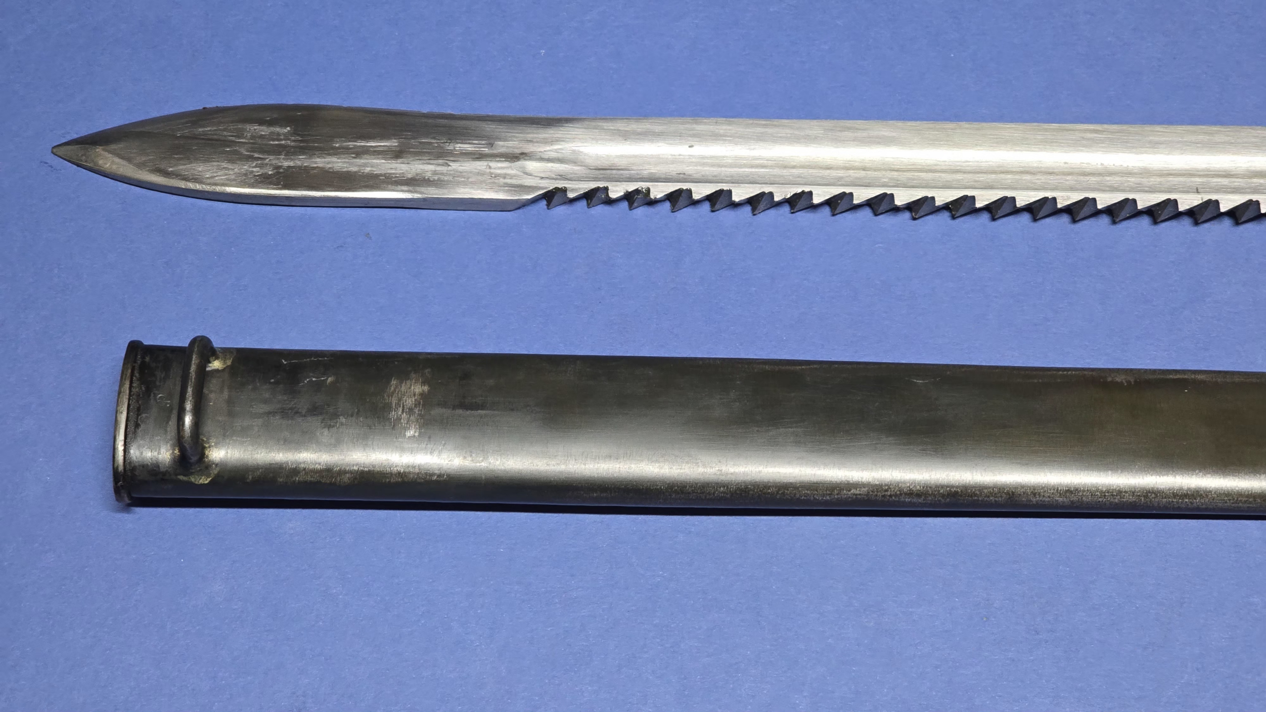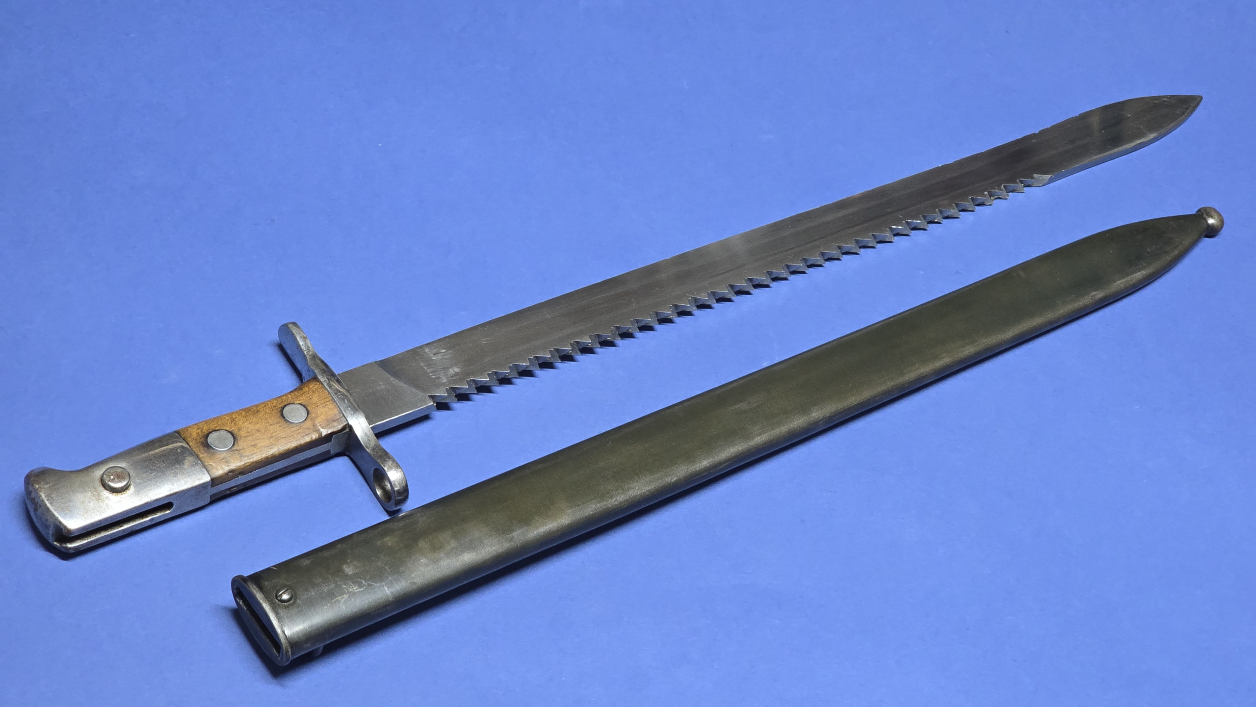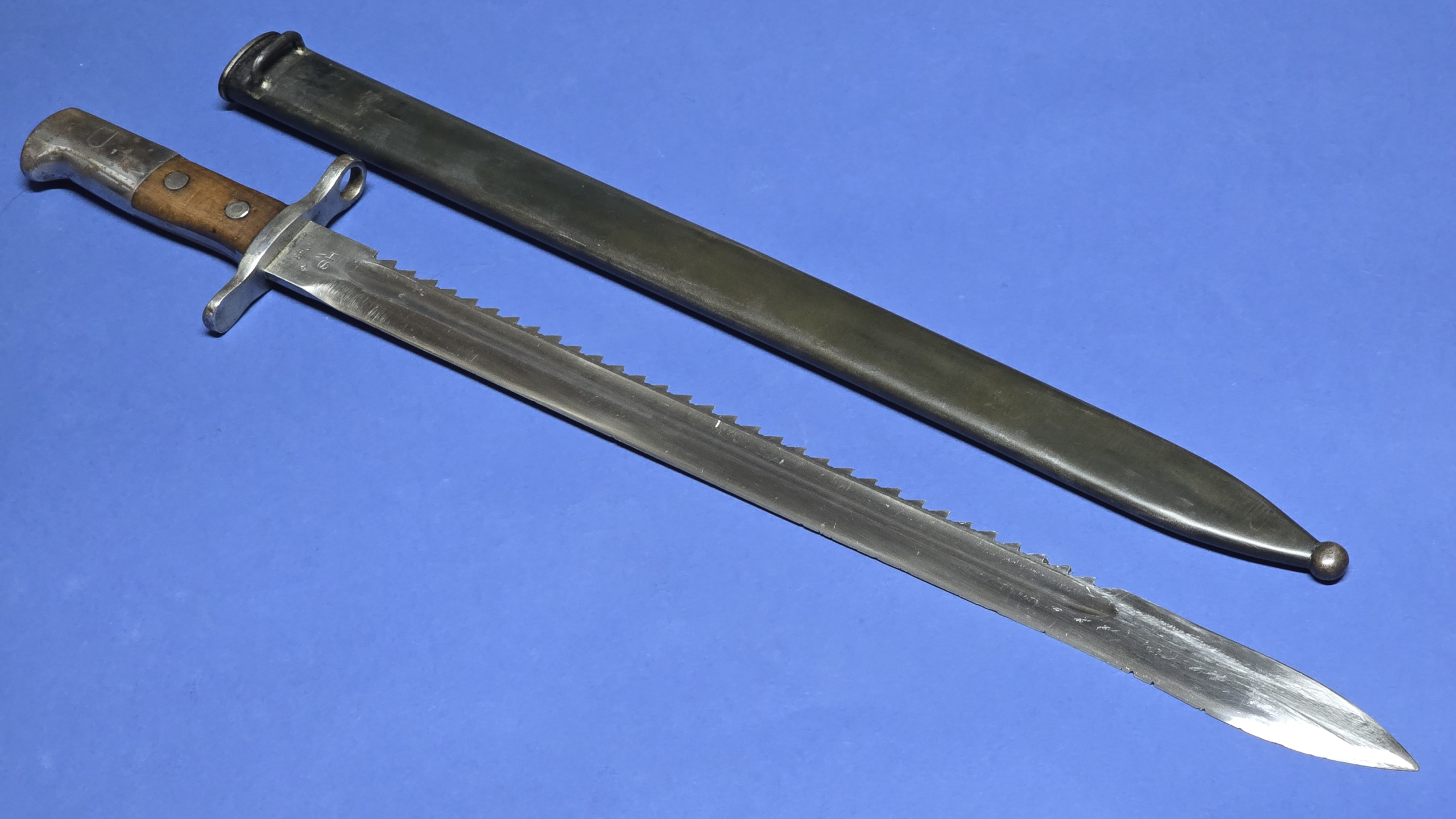 A very impressive example of the Swiss Model 1914 pioneer sawback bayonet. These are substantial, high-quality bayonets and represent excellent value for money considering the engineering and craftsmanship involved. A fine addition for collectors of Swiss militaria or military bayonets in general.