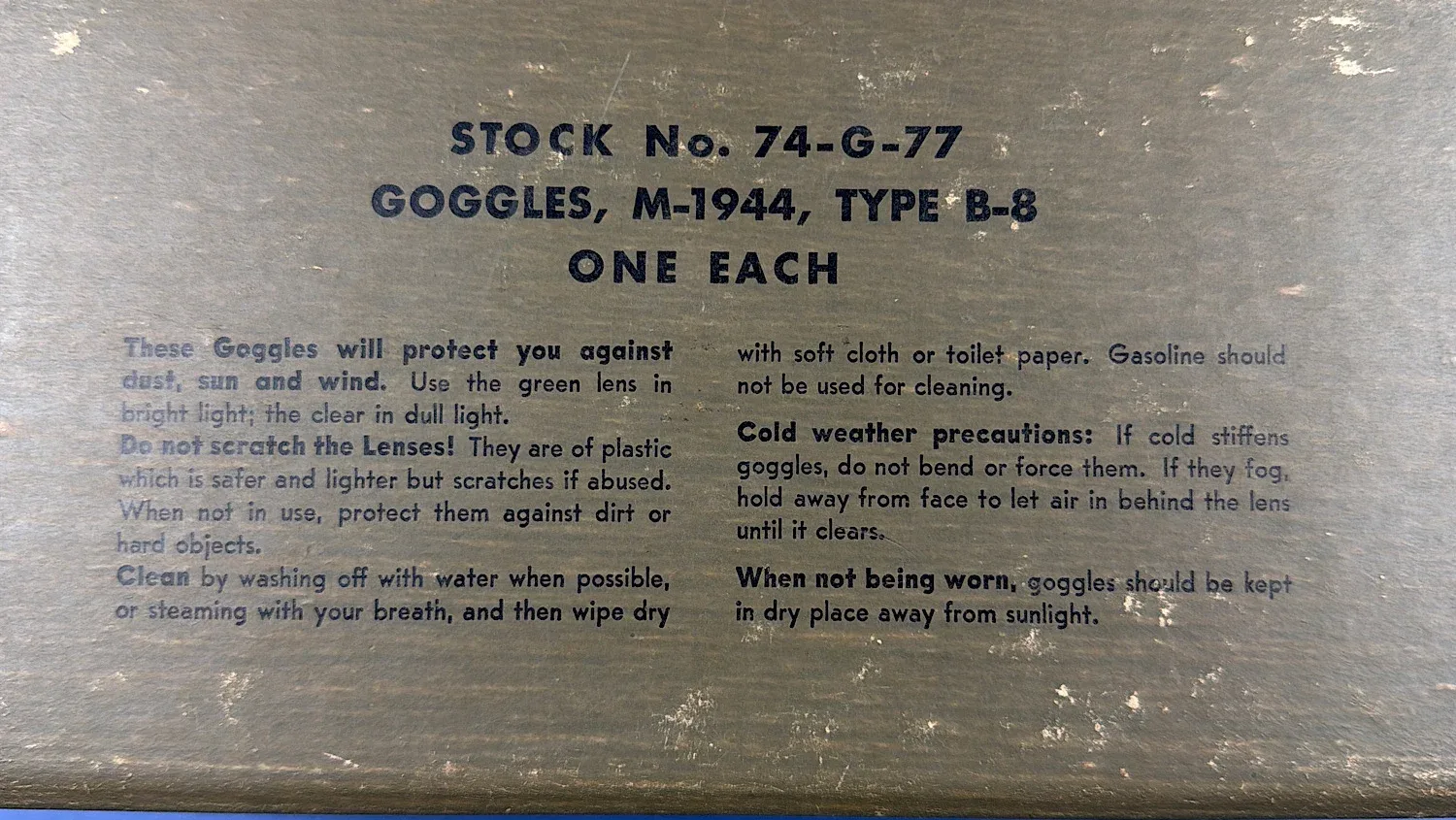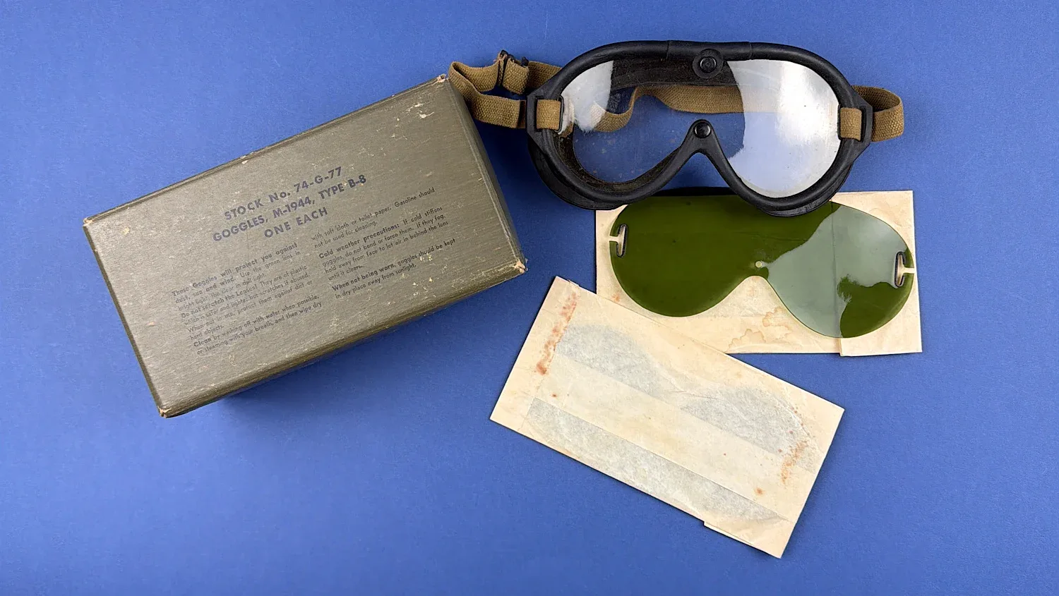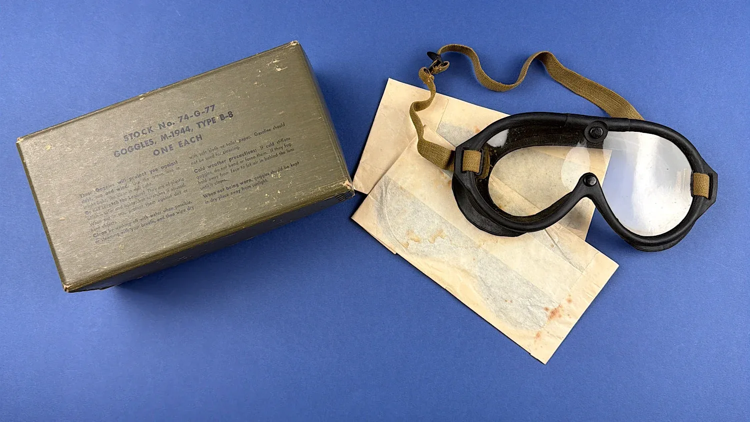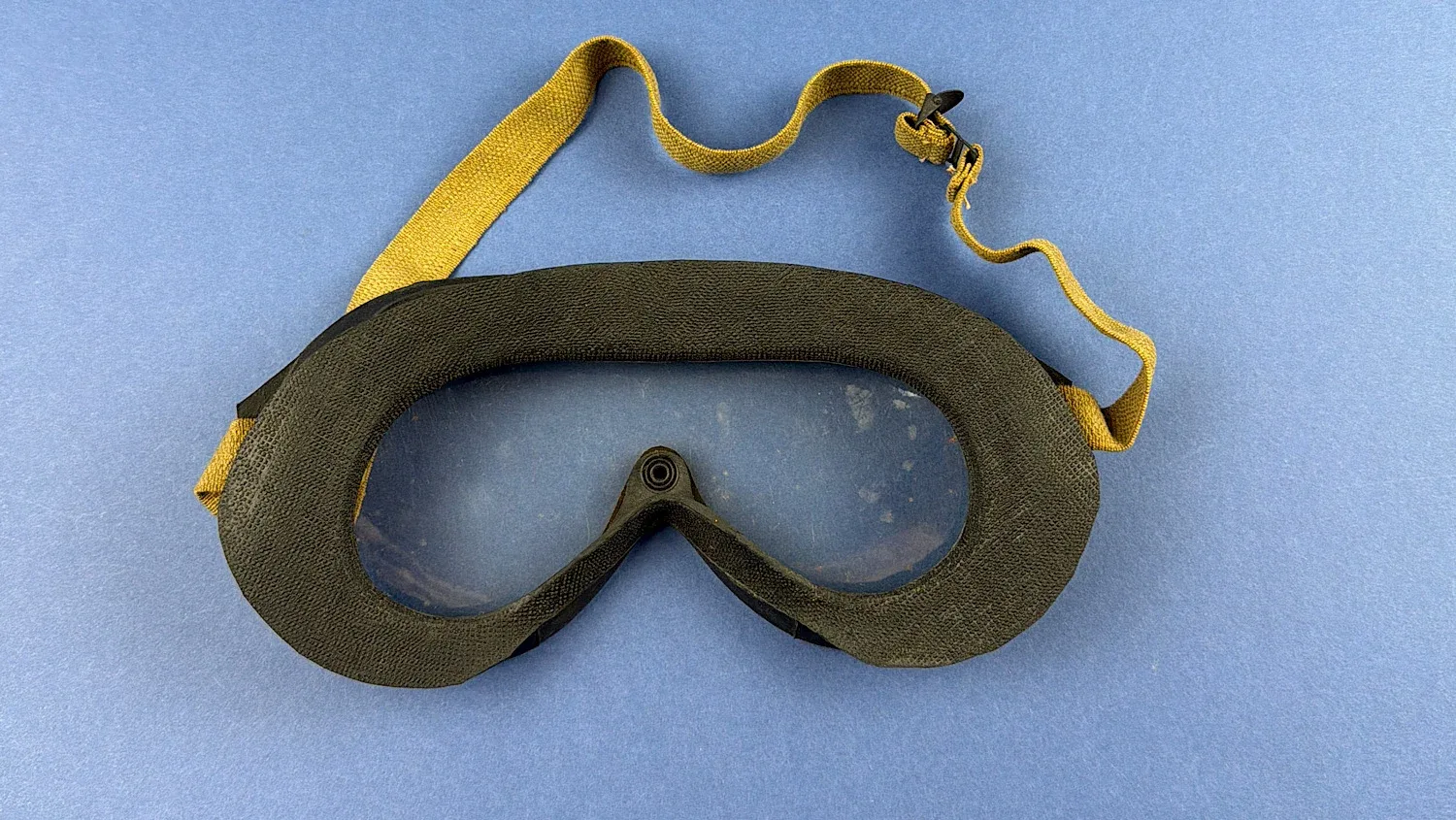 Introduced in 1944, the M-1944 pattern represented a more modern approach to protective eyewear, featuring a lightweight rubber frame and plastic lenses designed to offer improved safety and comfort over earlier glass types. These goggles were used in a variety of roles, from aircrew and ground personnel to vehicle crews, providing protection against wind, dust and glare in operational environments.