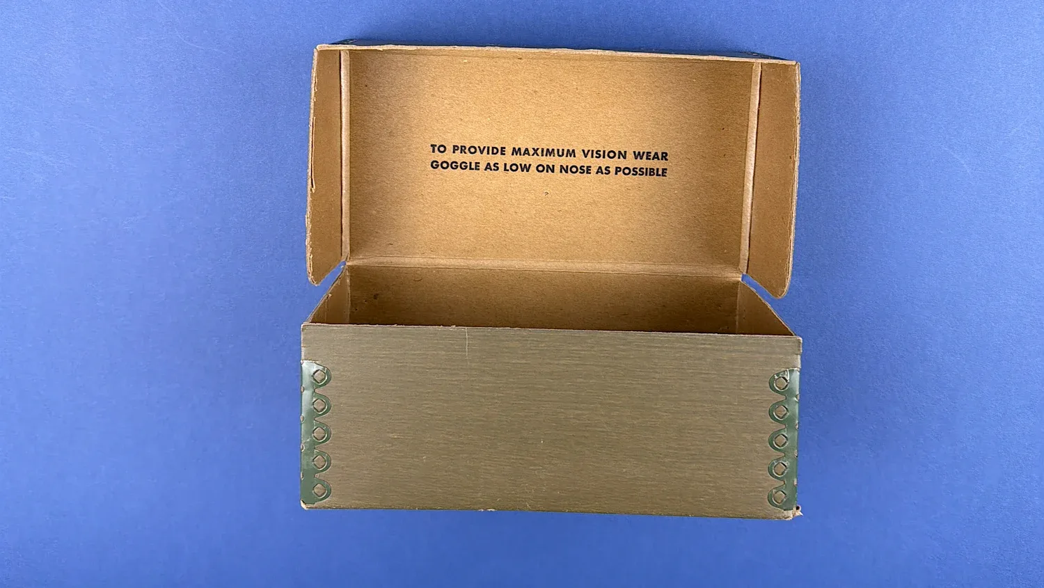 This is a complete set, comprising the original goggles, the correct issue box, and two spare green lenses, both still retained within their original paper packets. Sets like this are often found broken up or incomplete, so to have the goggles, lenses and packaging all together makes this a particularly desirable example for collectors.