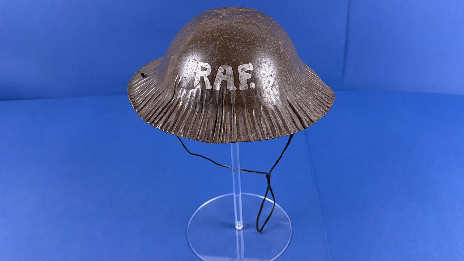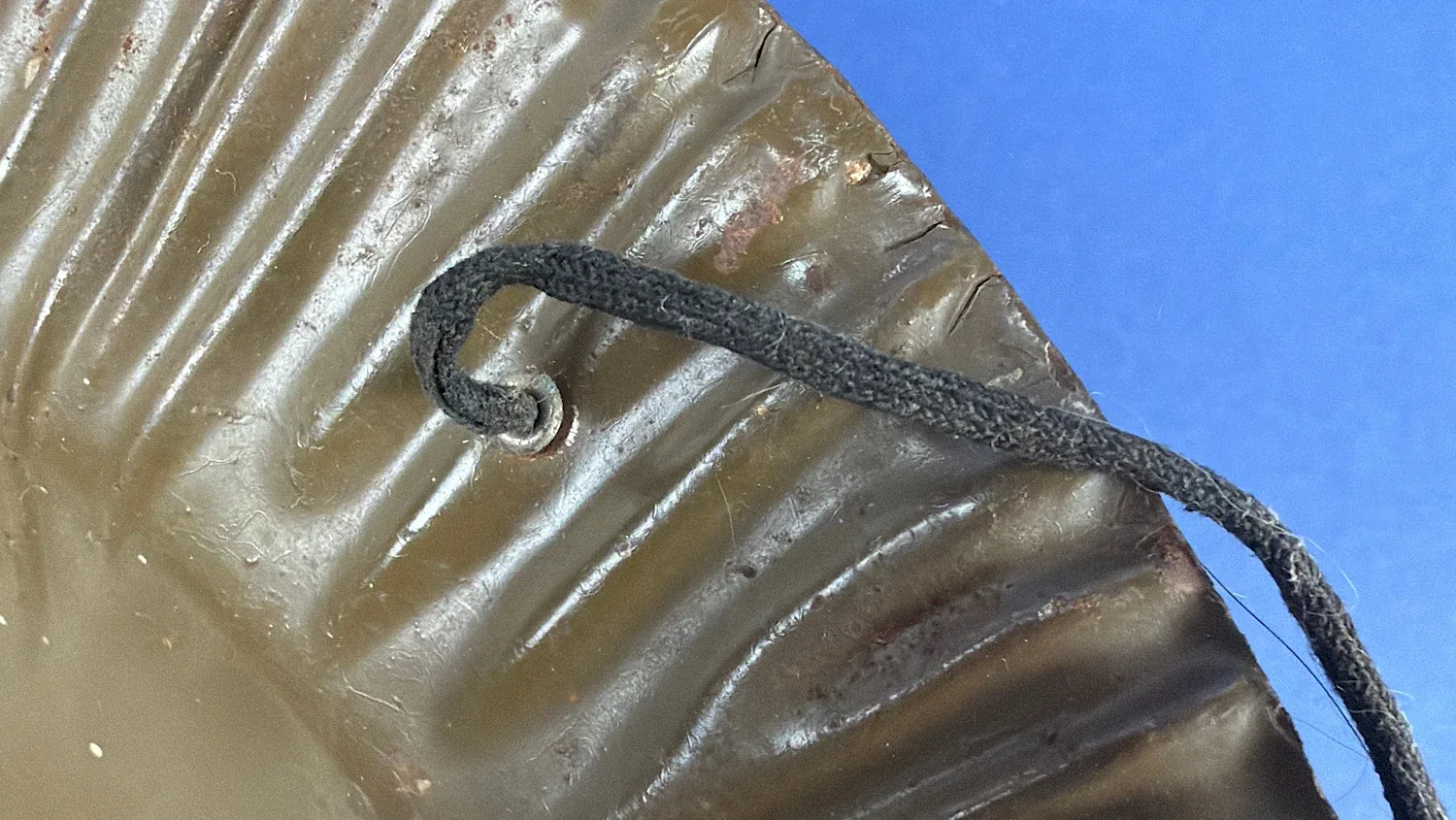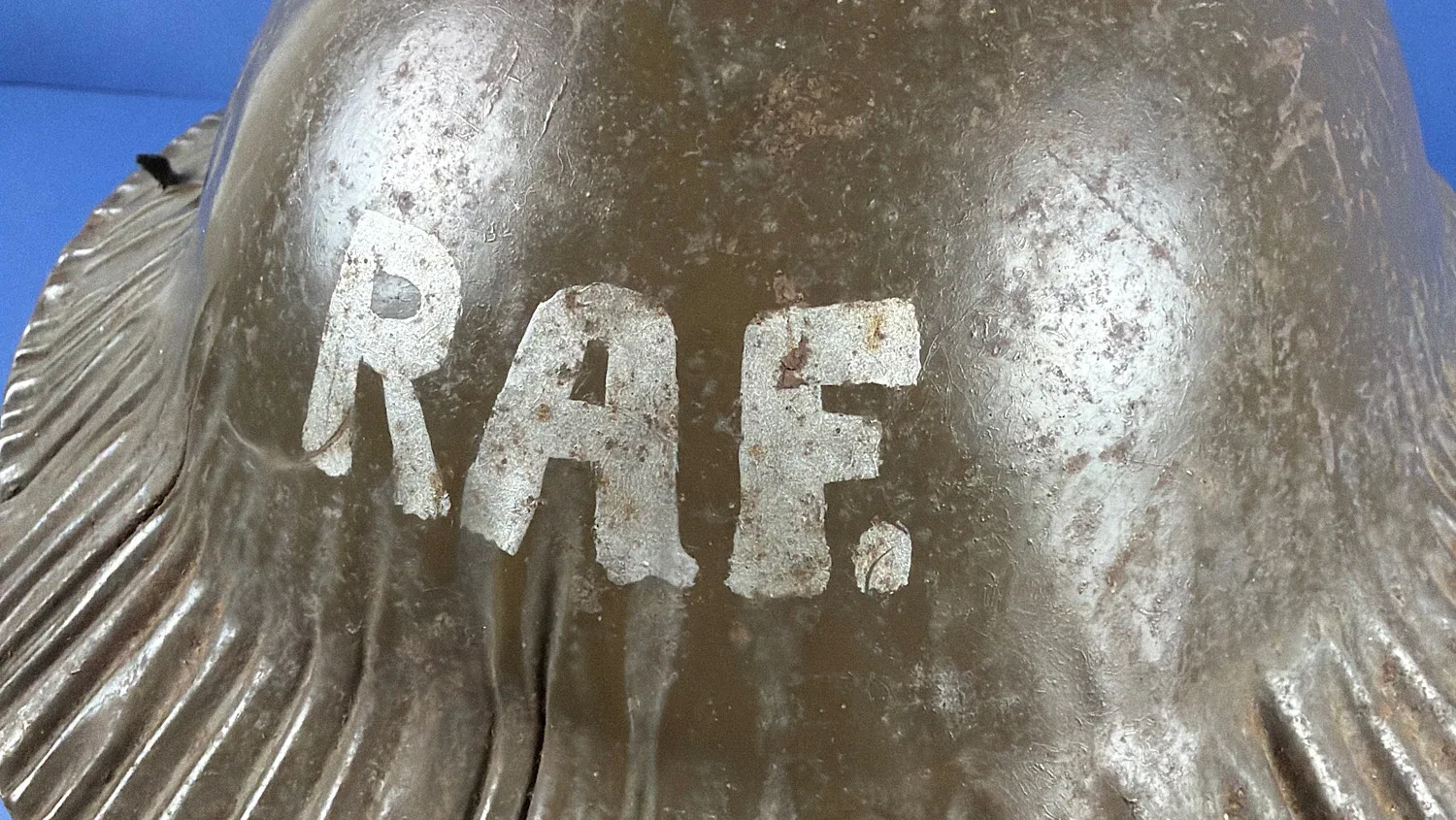 The helmet retains its period olive finish with honest age-related wear, surface rusting and patina throughout, giving it an appealing well-used look. The hand-painted “RAF.” marking appears to have been applied later and adds character, though it is not a factory or official marking. There is no internal liner present, and the chinstrap consists of a simple cord secured through punched holes in the shell.