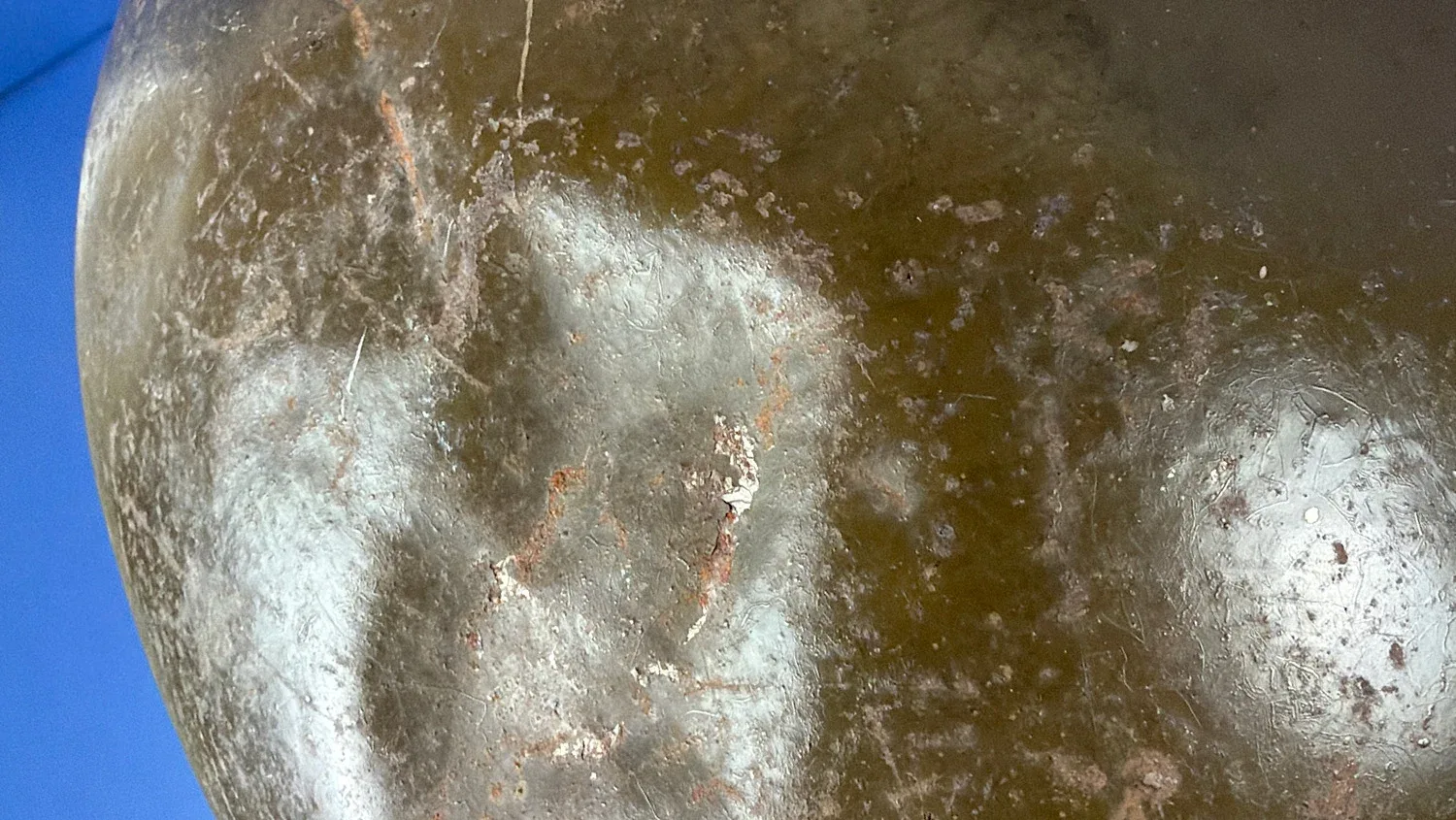 The helmet remains structurally sound and displays honest age-related wear consistent with mid-century manufacture. There are a couple of shallow dents to the crown and some minor misshaping to sections of the fluted rim, likely from storage or use. The olive drab finish shows surface wear, light rust spotting and general patina, though it is notably less corroded than many comparable examples. The chinstrap remains present and secure. Overall, it presents well with attractive character and retains a strong display presence despite the expected signs of age.
