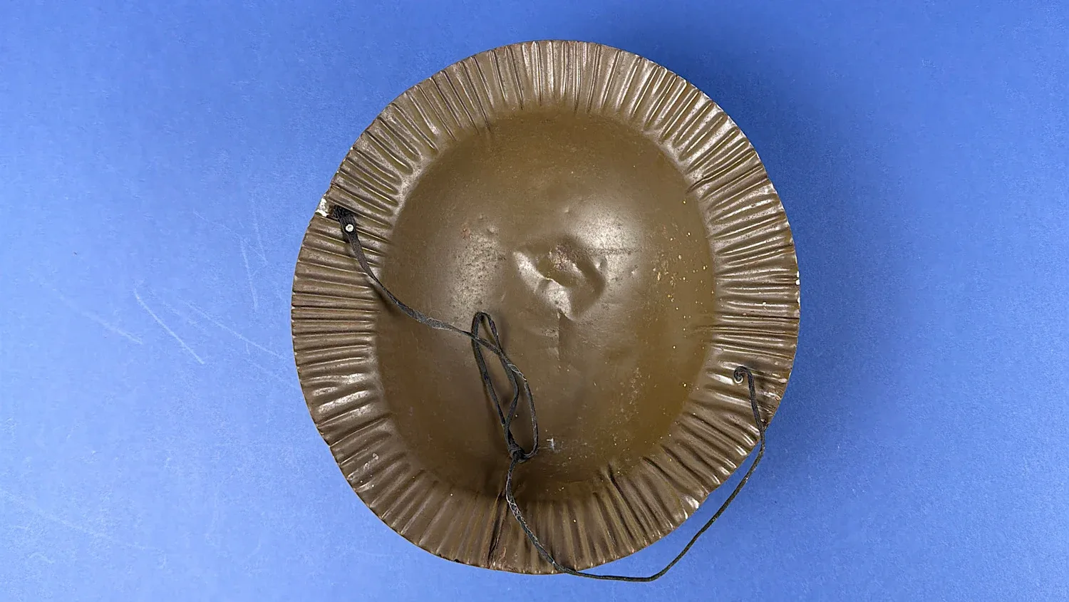 Modelled loosely on the iconic British WW2 Tommy helmet shape, this example was produced as a children’s play or fancy dress item rather than as genuine military issue. The fluted pressed rim, lightweight steel construction and simple cord chinstrap are all typical of mid-20th century toy manufacture.