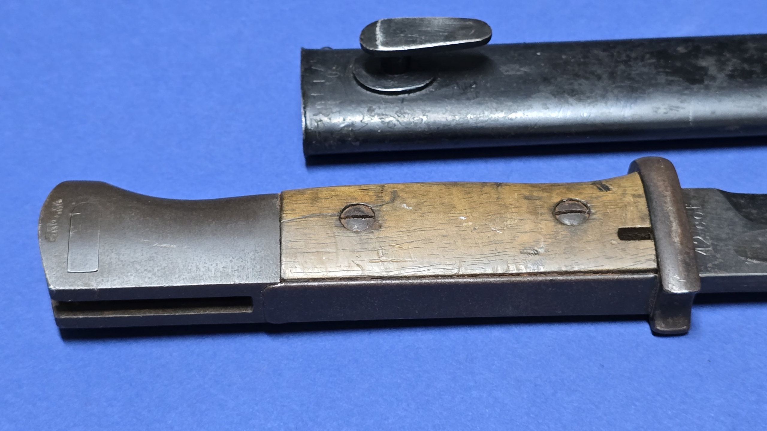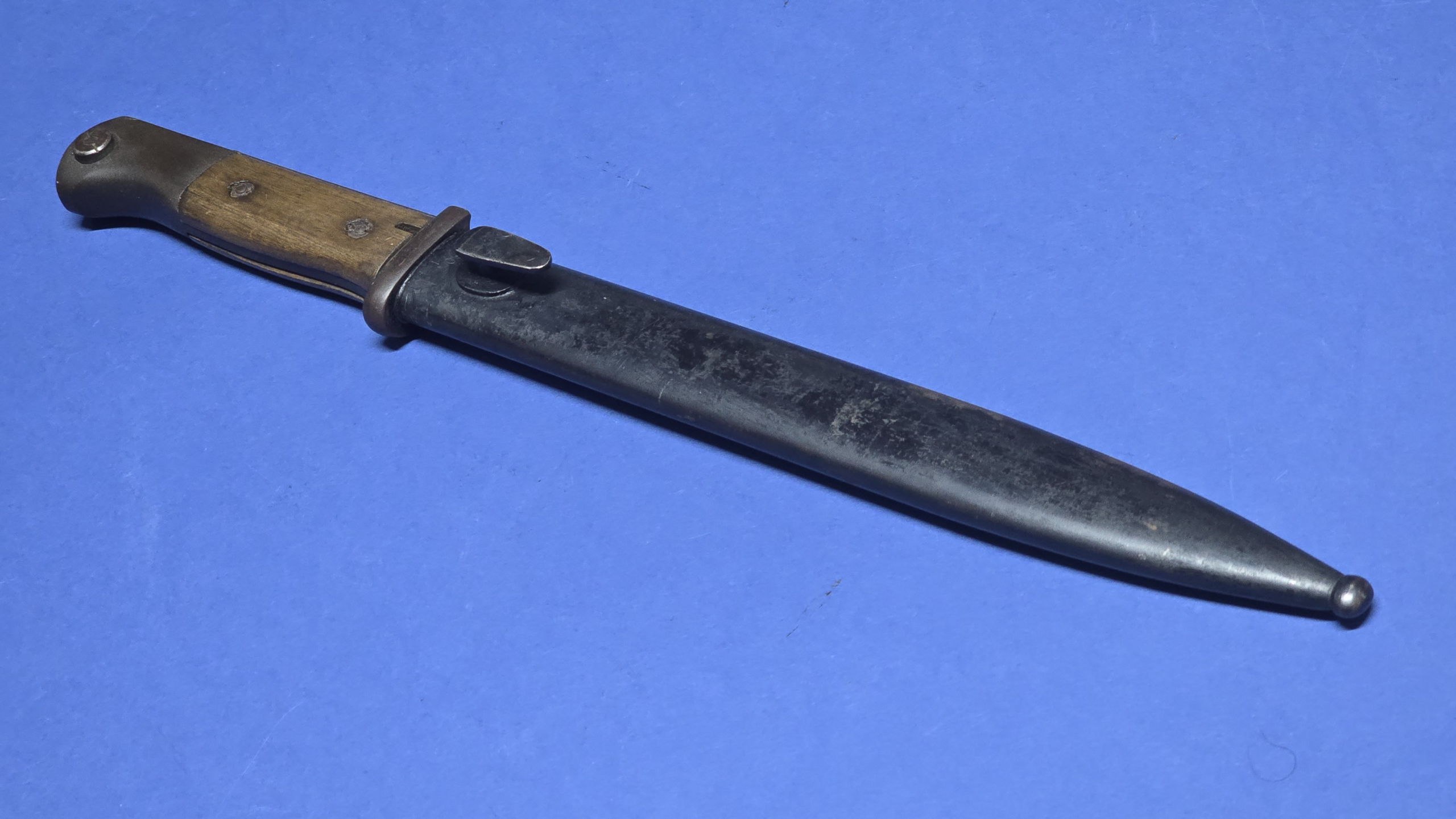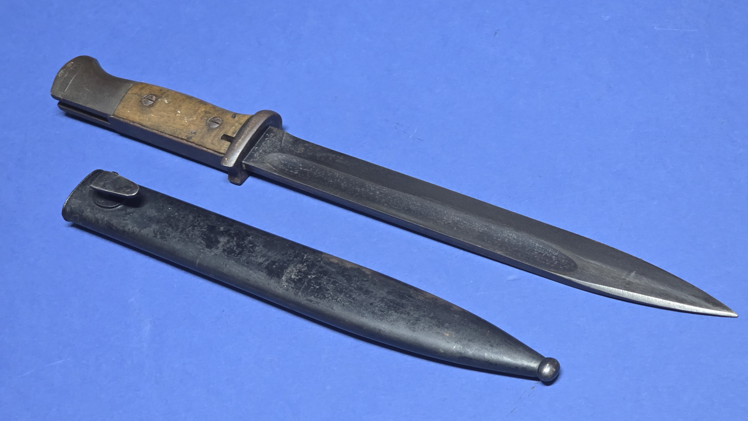 There is evidence of old black paint present on the scabbard, now largely flaked away, with full original bluing visible beneath. The bayonet fits the scabbard smoothly and correctly, seating fully with a positive snap at the throat.