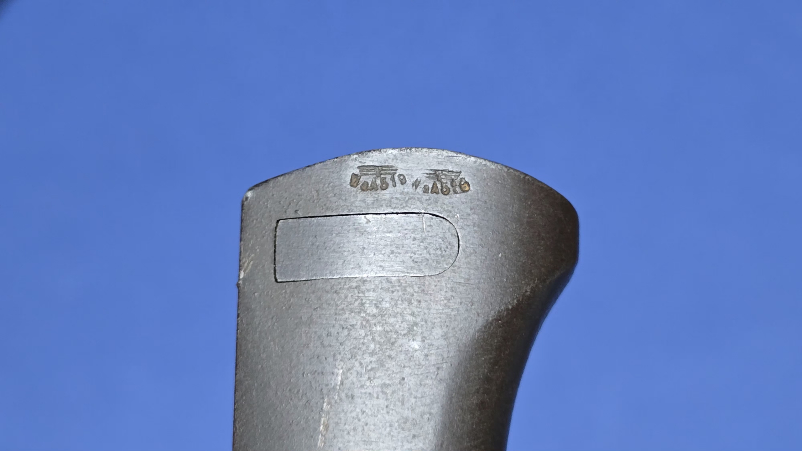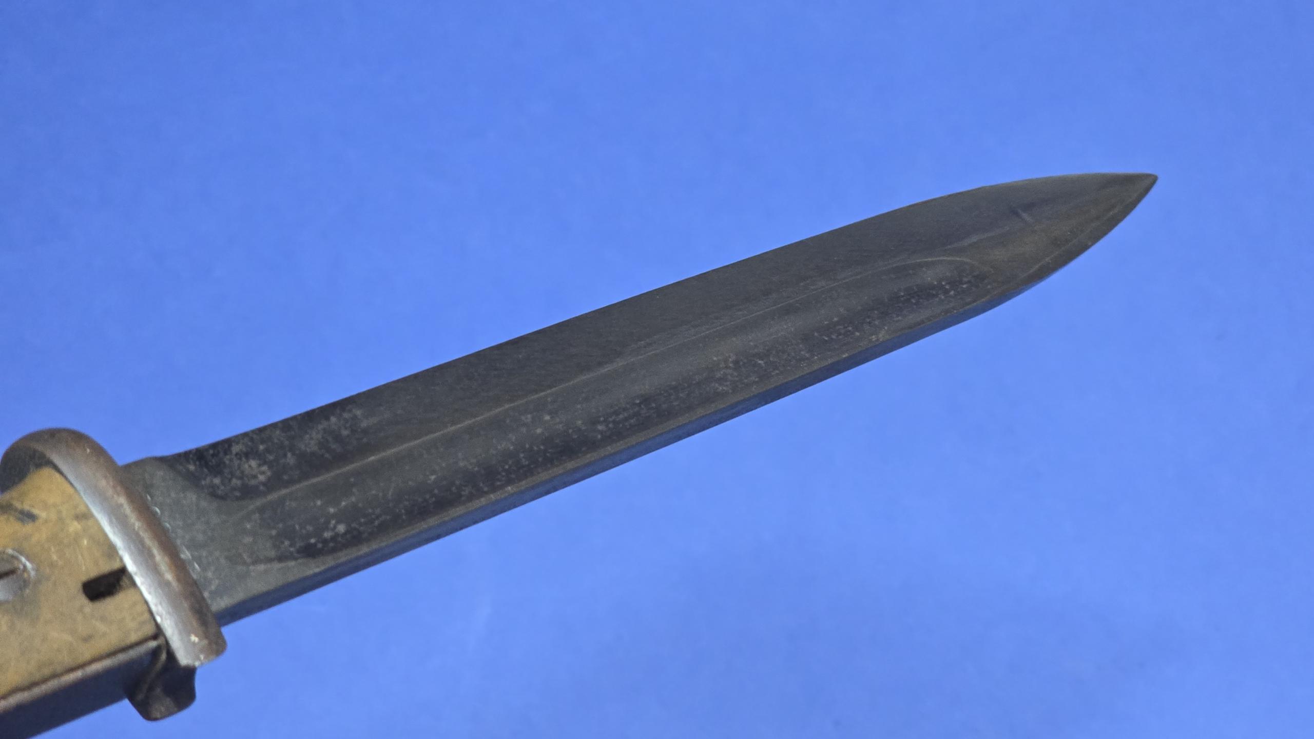 The blade is unsharpened and retains all of it’s original bluing, finishing in a well-defined pointed tip. The blade remains a very decent example, although, there is light surface spotting present to both sides, which I have shown in the photo’s. Even with the surface spotting present, the blade shows no abuse and retains a good profile.