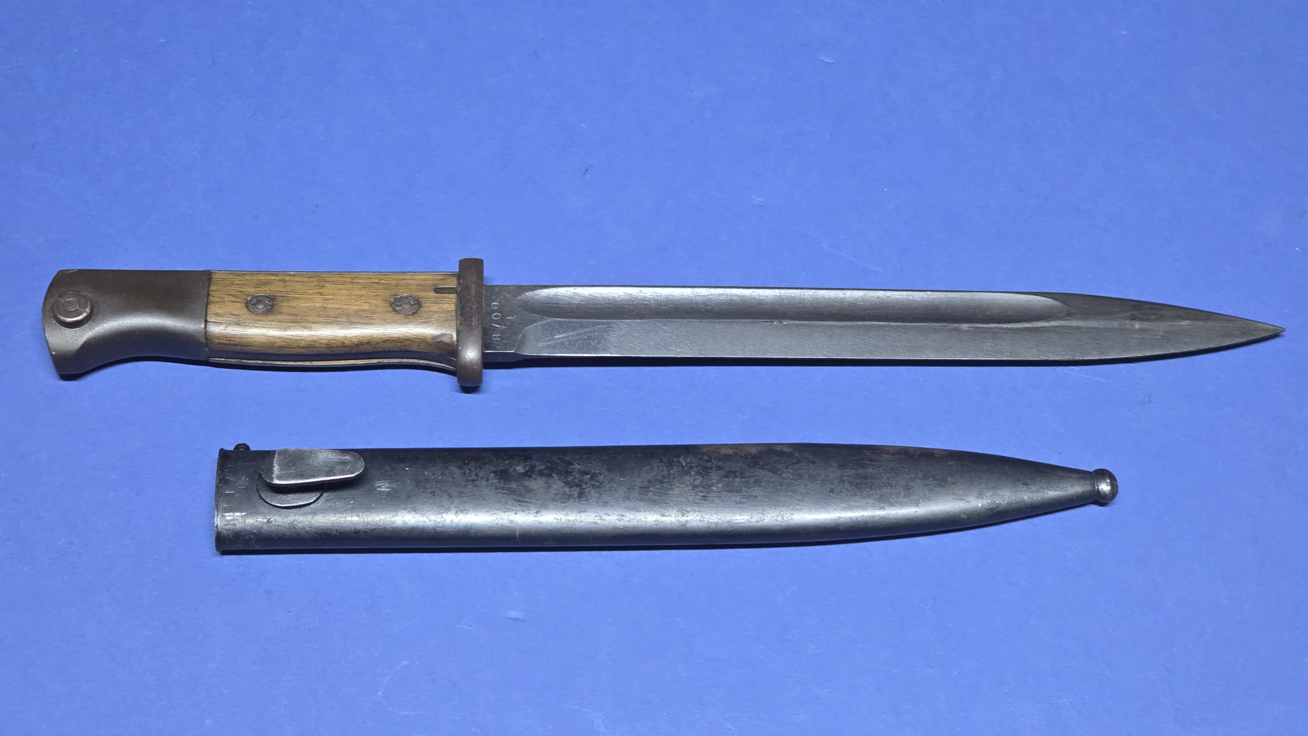 A very decent K98 bayonet with attractive wooden grips, a good blade, and an Eickhorn-made scabbard. A clean, honest wartime example that presents well.