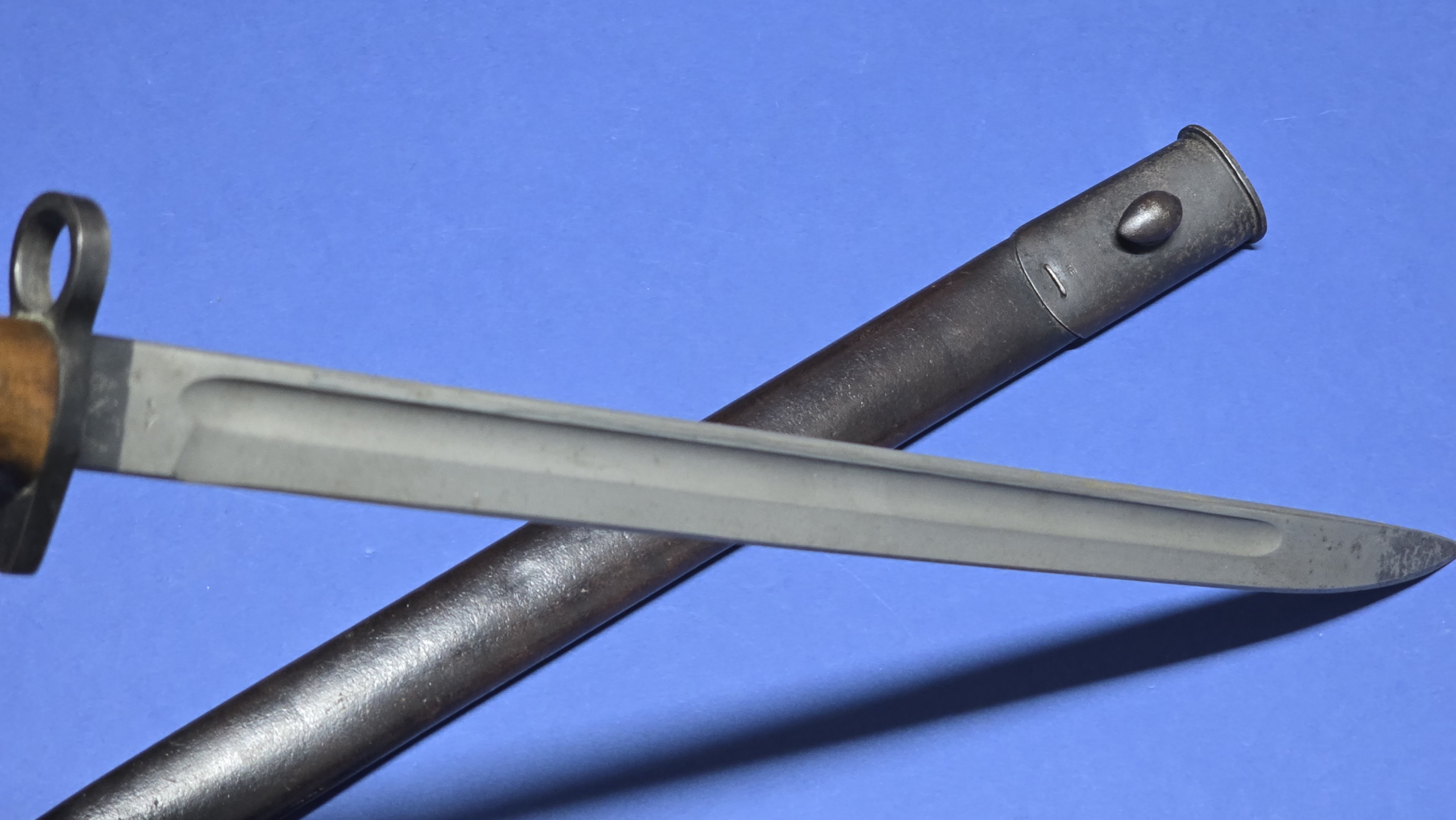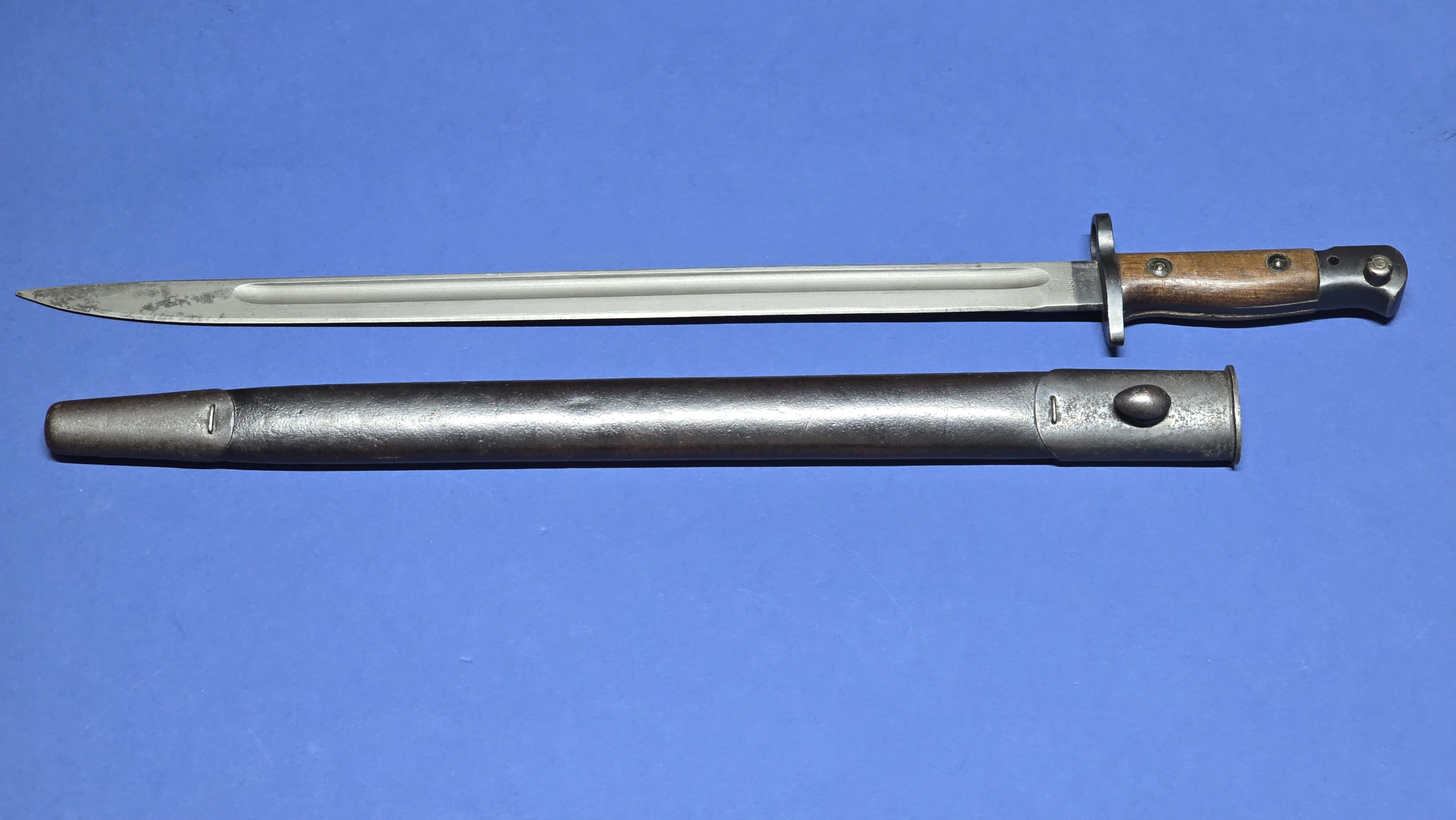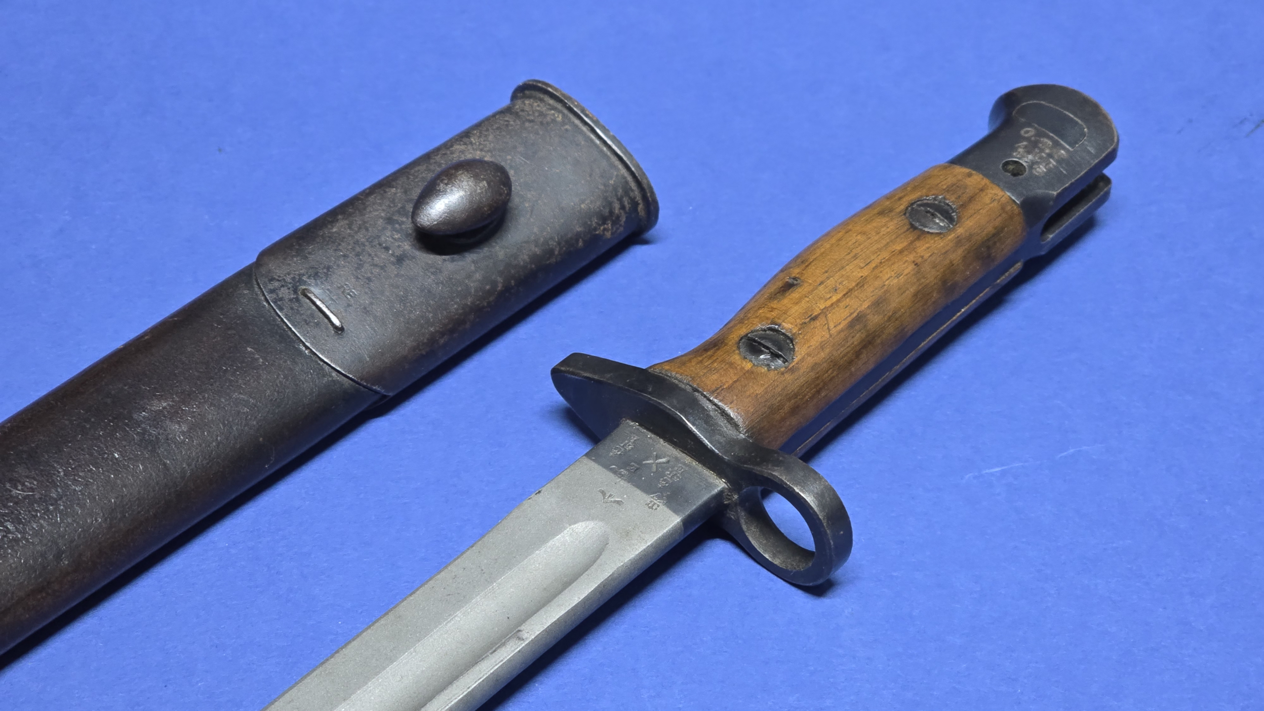 Both the upper and lower metal fittings retain their original staples, and the bayonet fits the scabbard extremely well, with a snug, secure fit.