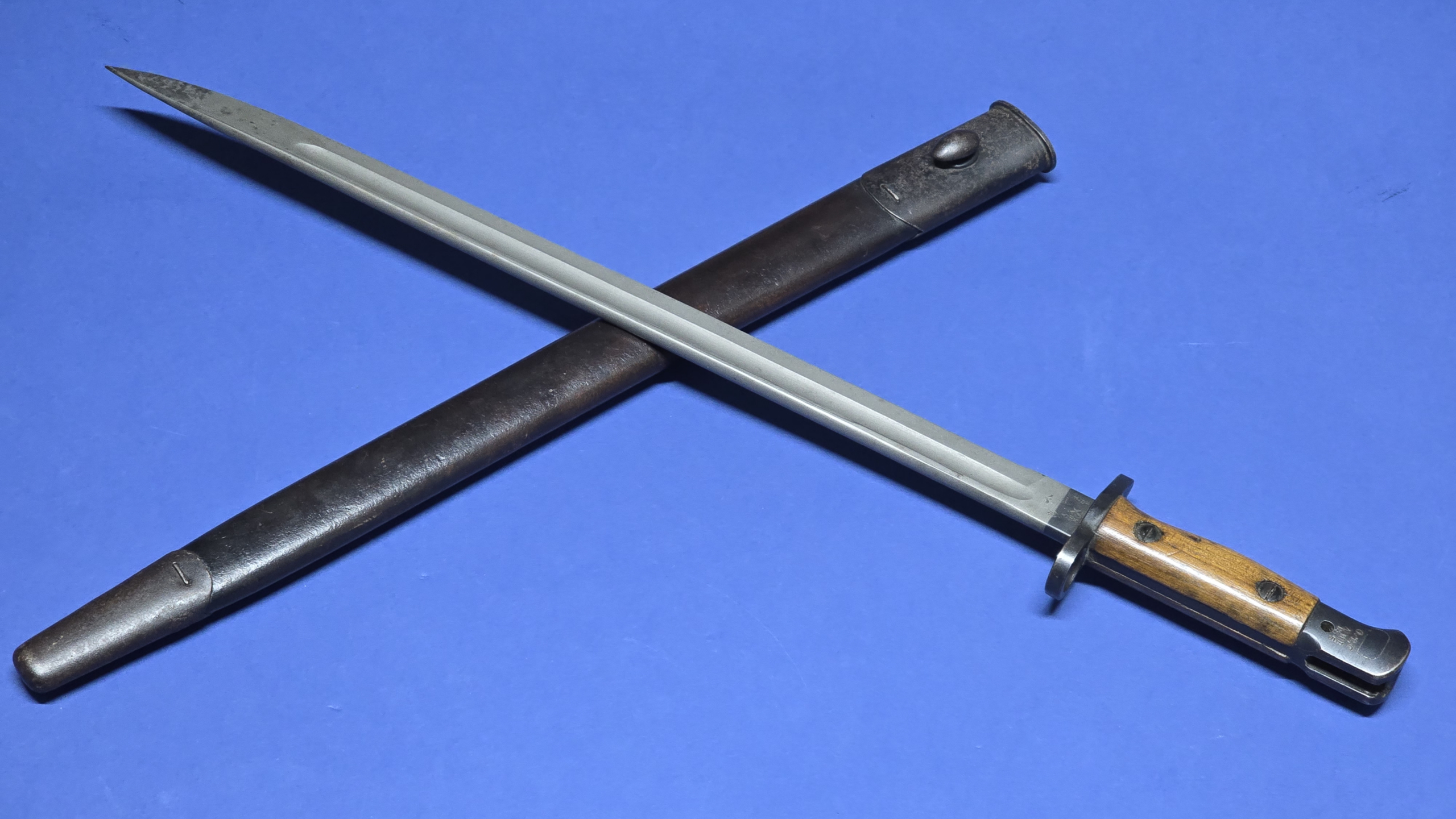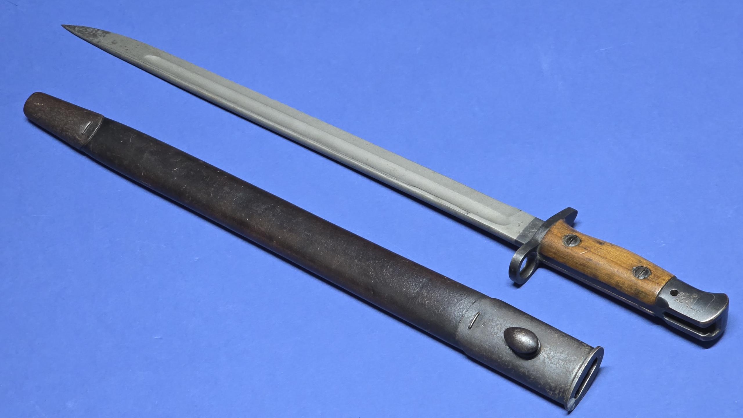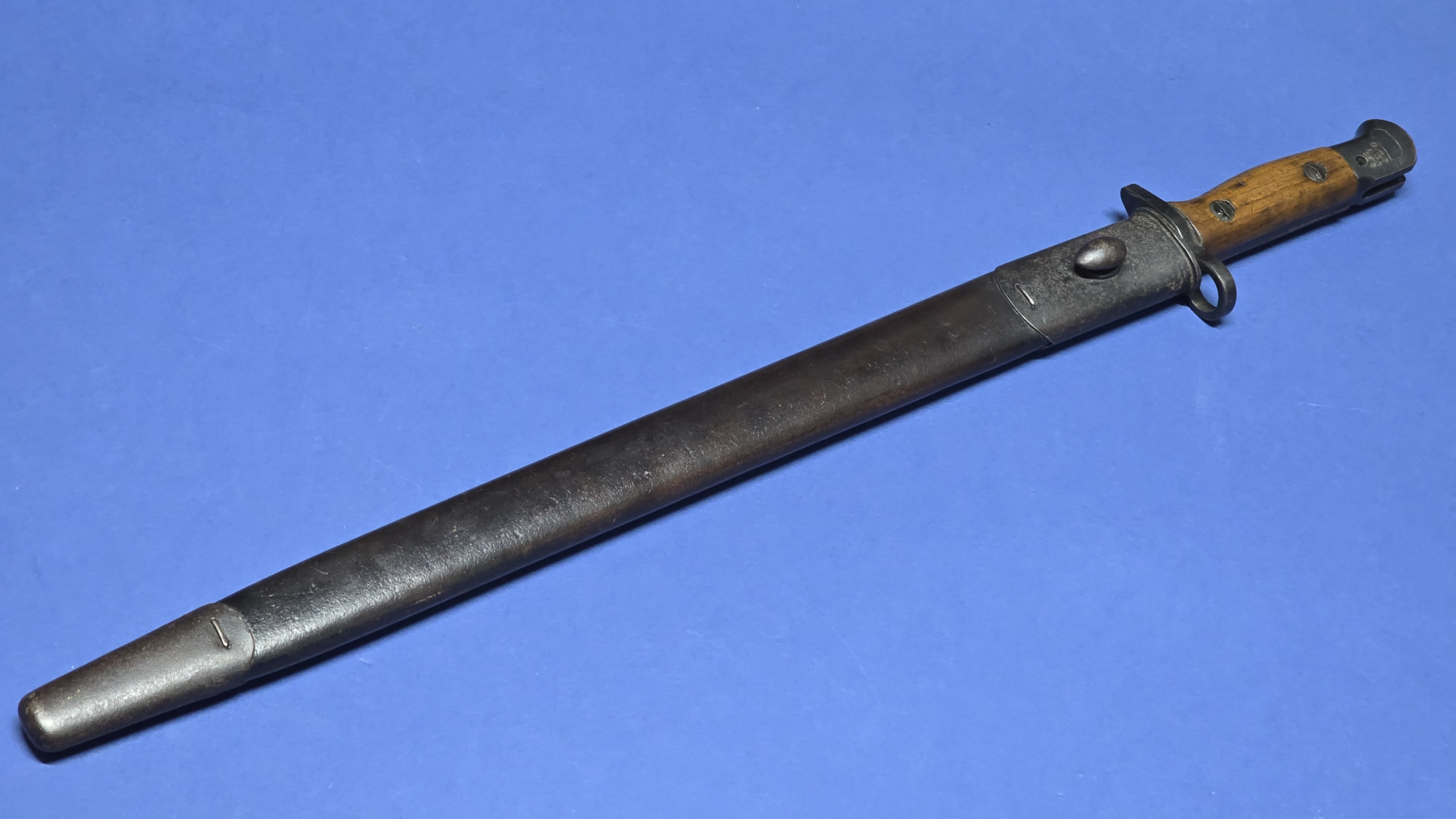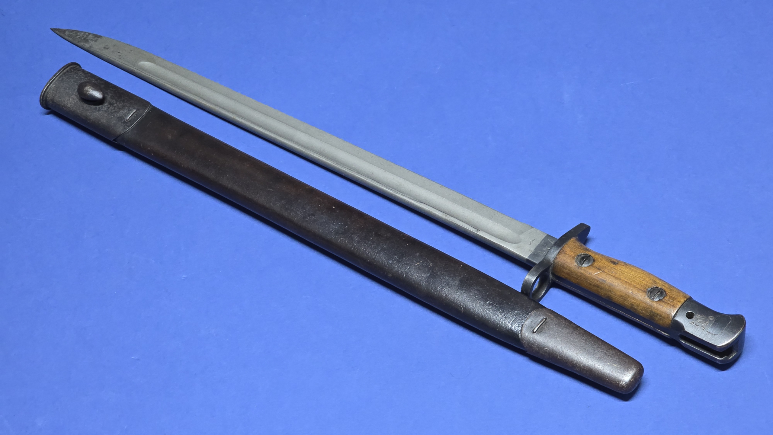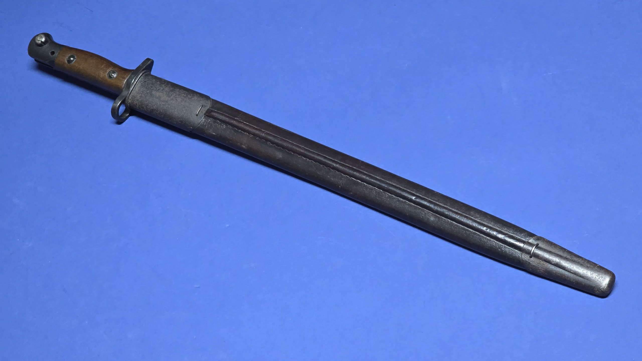 The bayonet is accompanied by its correct Pattern 1907 leather scabbard. The leather is a rich brown colour and remains supple and well preserved. Faint markings are present to the rear, including a lightly visible 17, consistent with the bayonet’s 1917 production period, though these markings are now very weak.