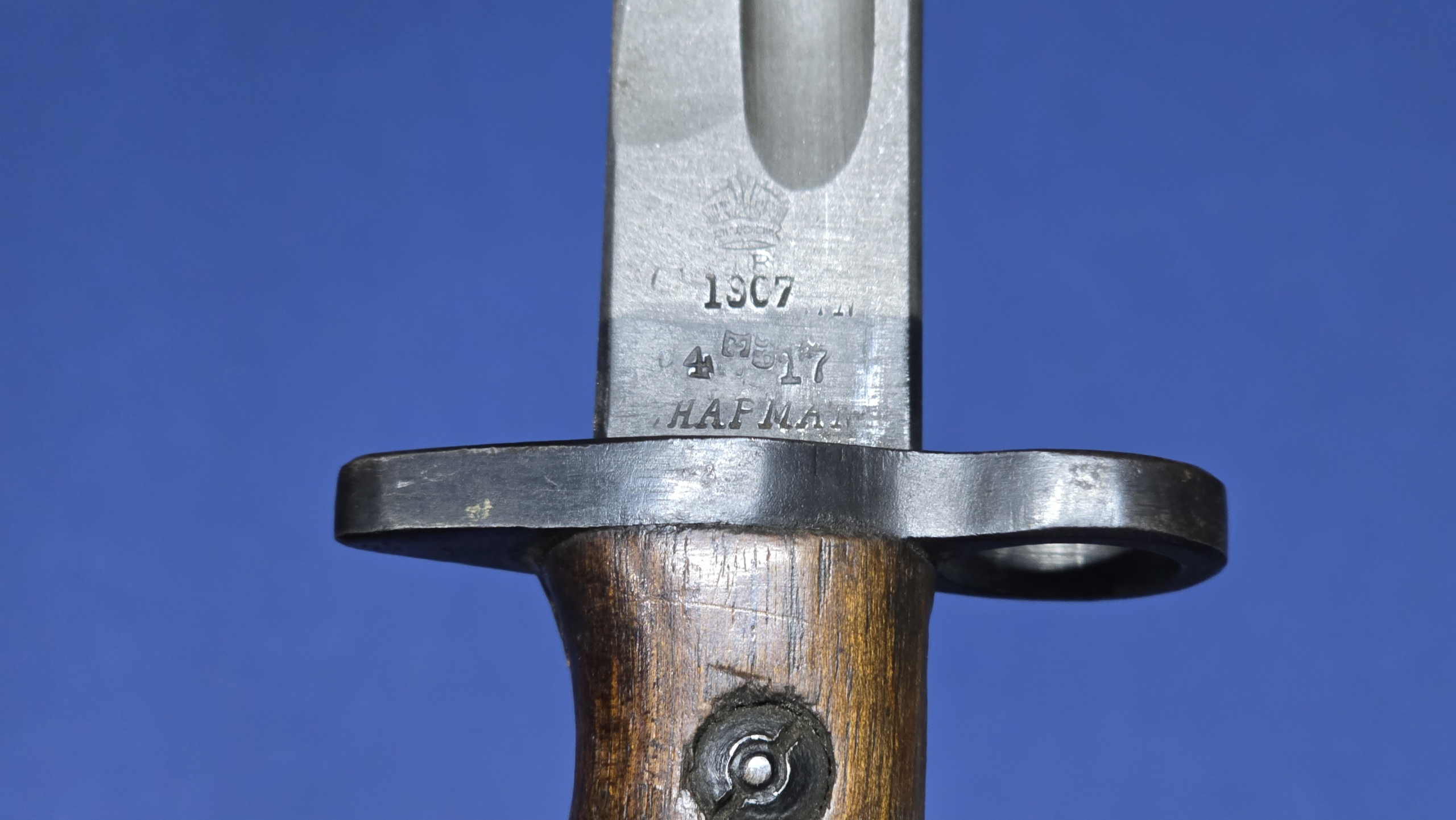 The ricasso is stamped with the crowned 1907 pattern designation, over 4 / 17, indicating manufacture in April 1917, with the scarce maker Chapman stamped beneath. The reverse ricasso displays the expected British inspection stamps, including individual inspector marks and an “X” indicating that the blade passed the bend test. These marking’s are consistent with British wartime acceptance and quality control procedures.