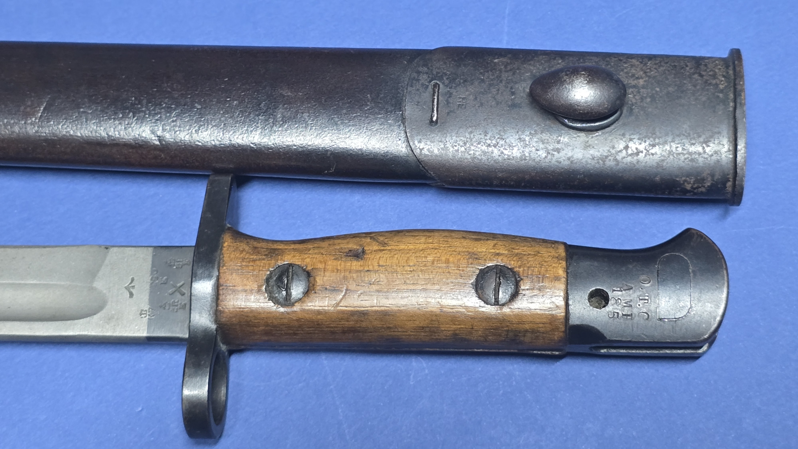 Here we have a very fine example of the British Pattern 1907 bayonet, dated 1917 and manufactured by Chapman. Chapman is a comparatively scarce maker when set against more commonly encountered producers such as Wilkinson, Sanderson, and Enfield, making this a particularly desirable example for the collector.