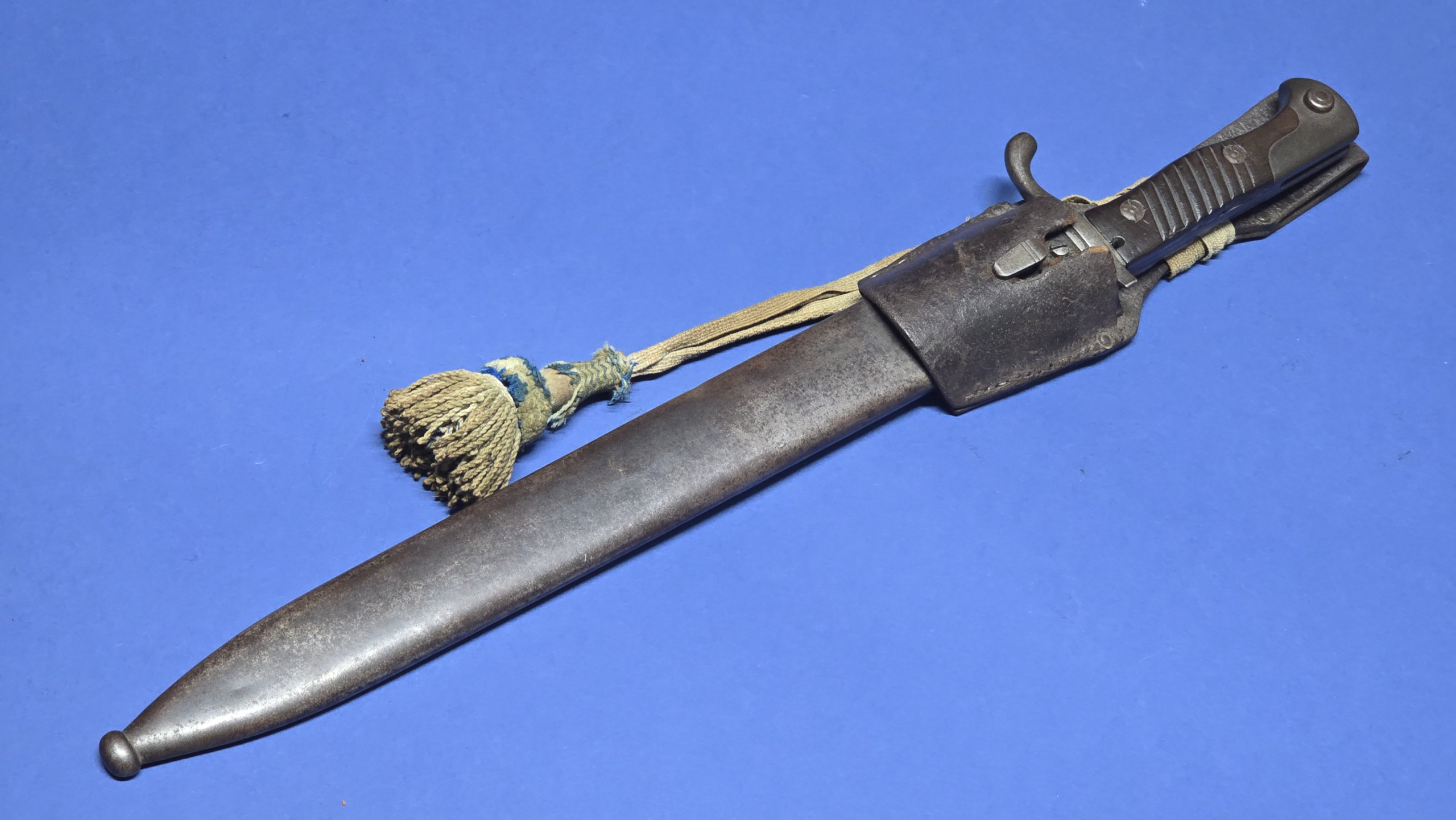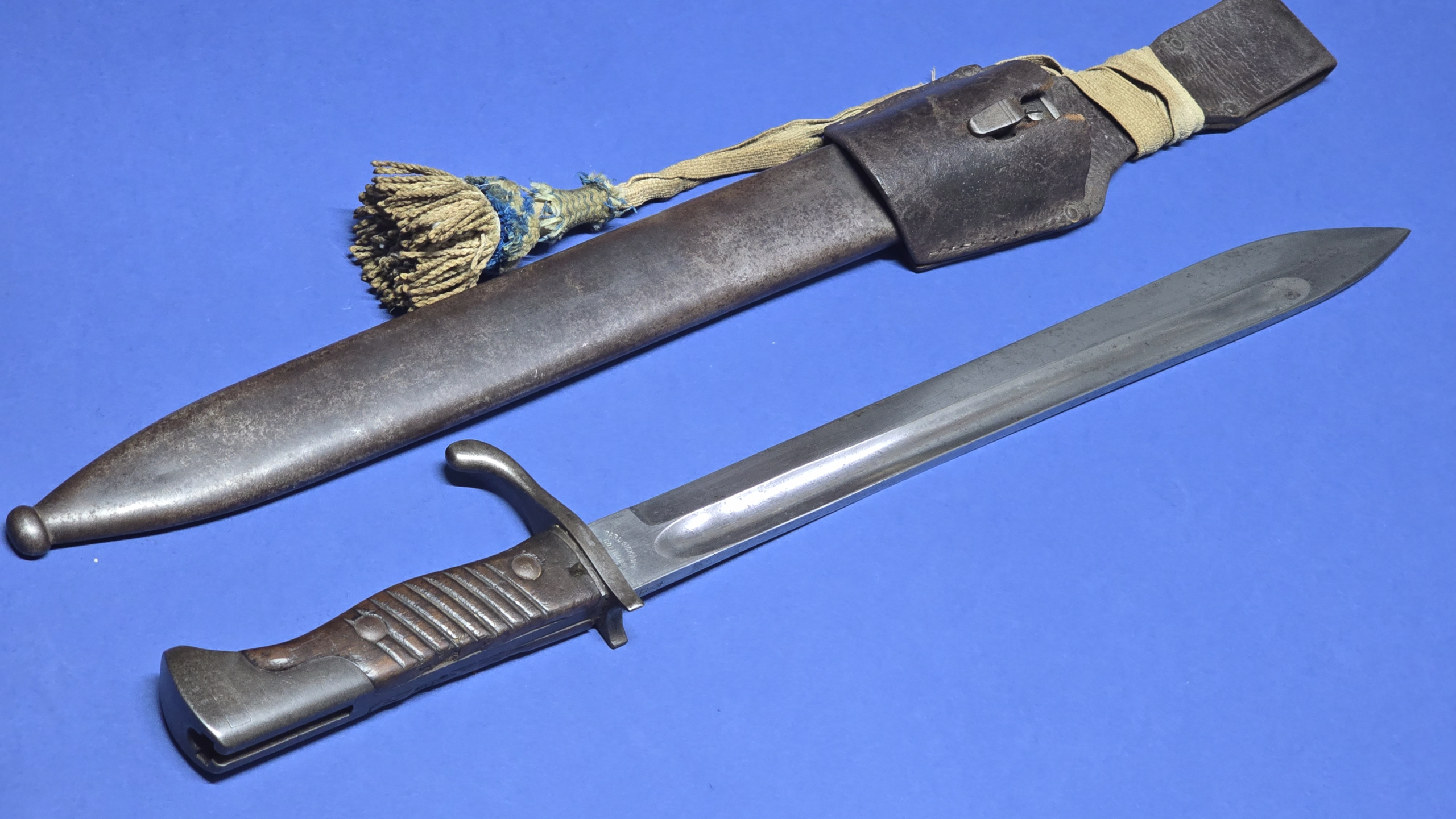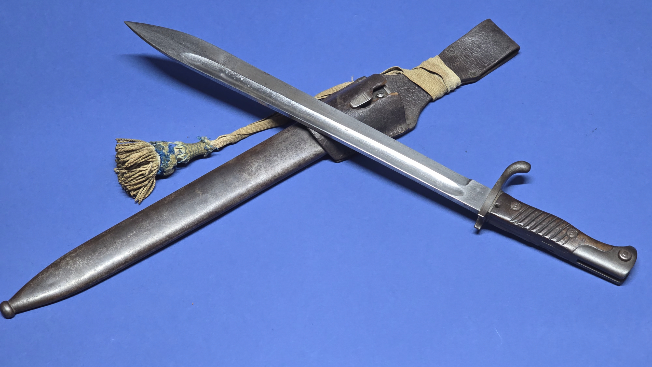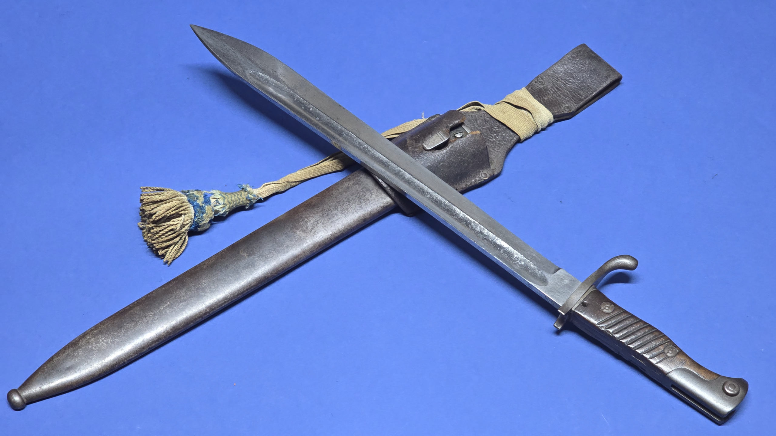 A complete and well-matched WWI German 98/05 bayonet set retaining its early high ears configuration. While showing honest service wear throughout, this example presents very well and benefits from being accompanied by a dated frog and troddel, making it an appealing and complete package.