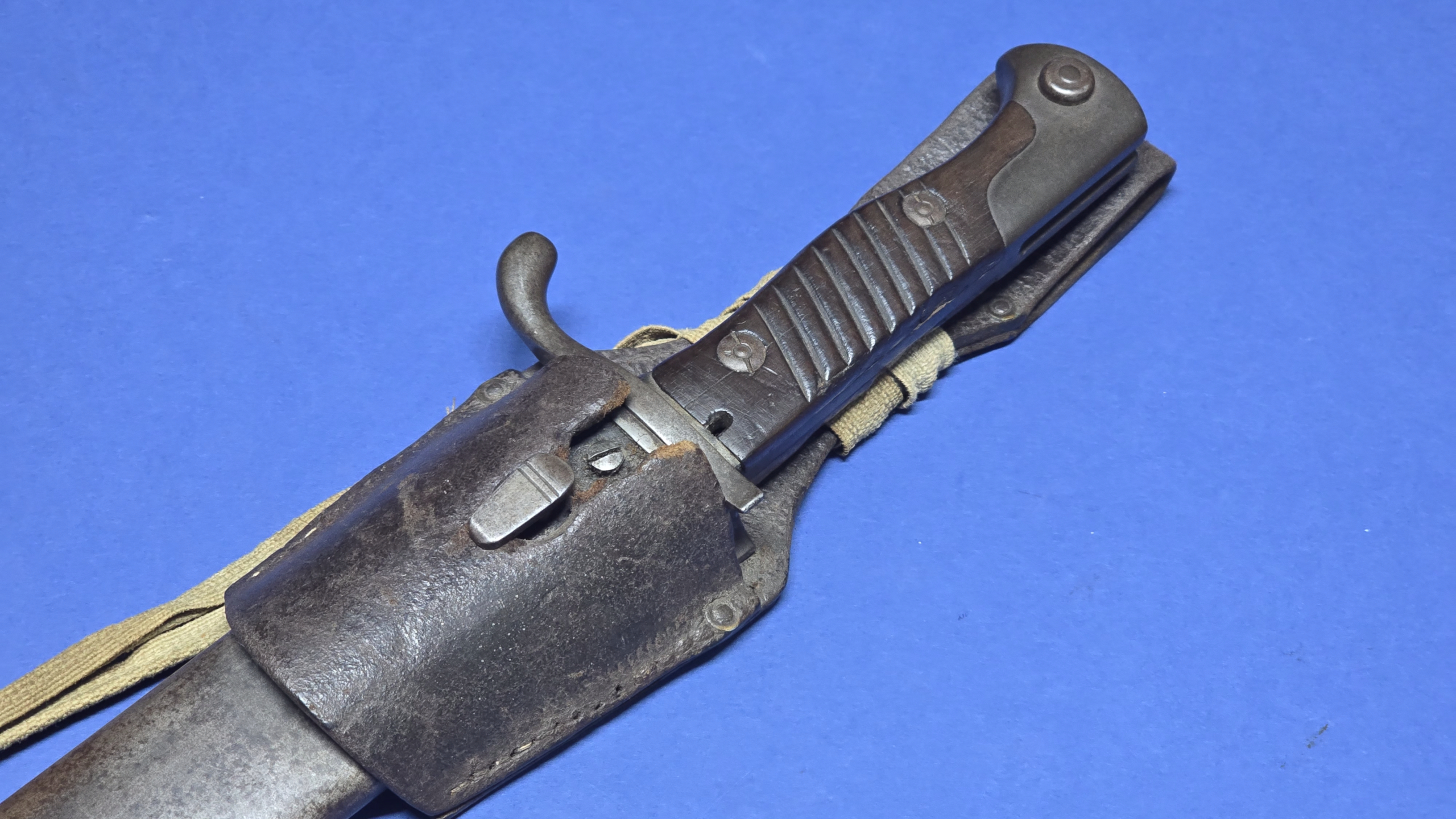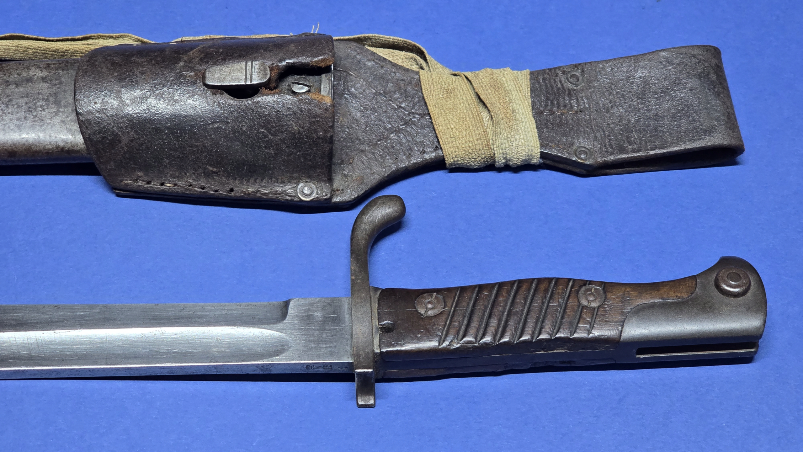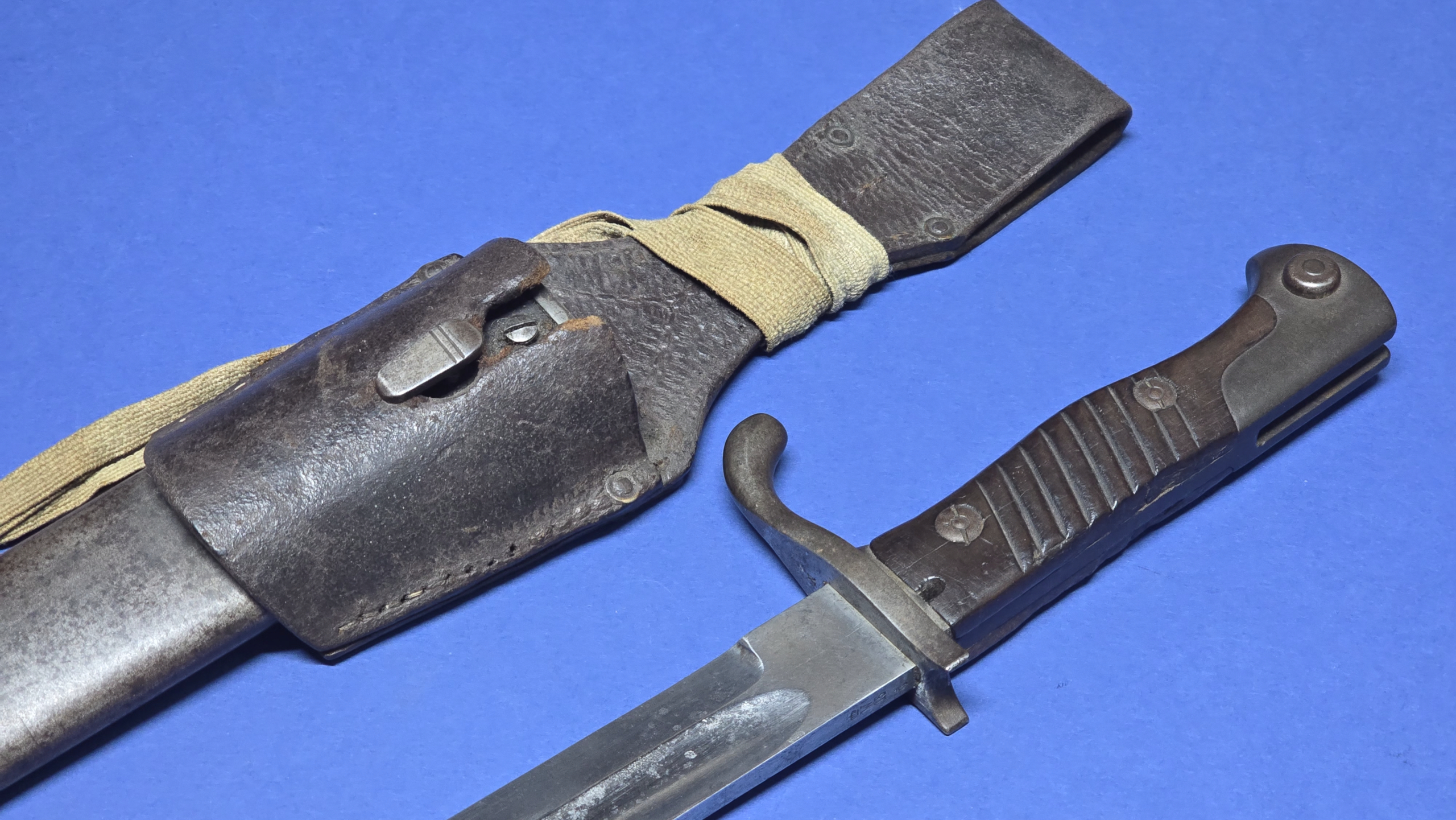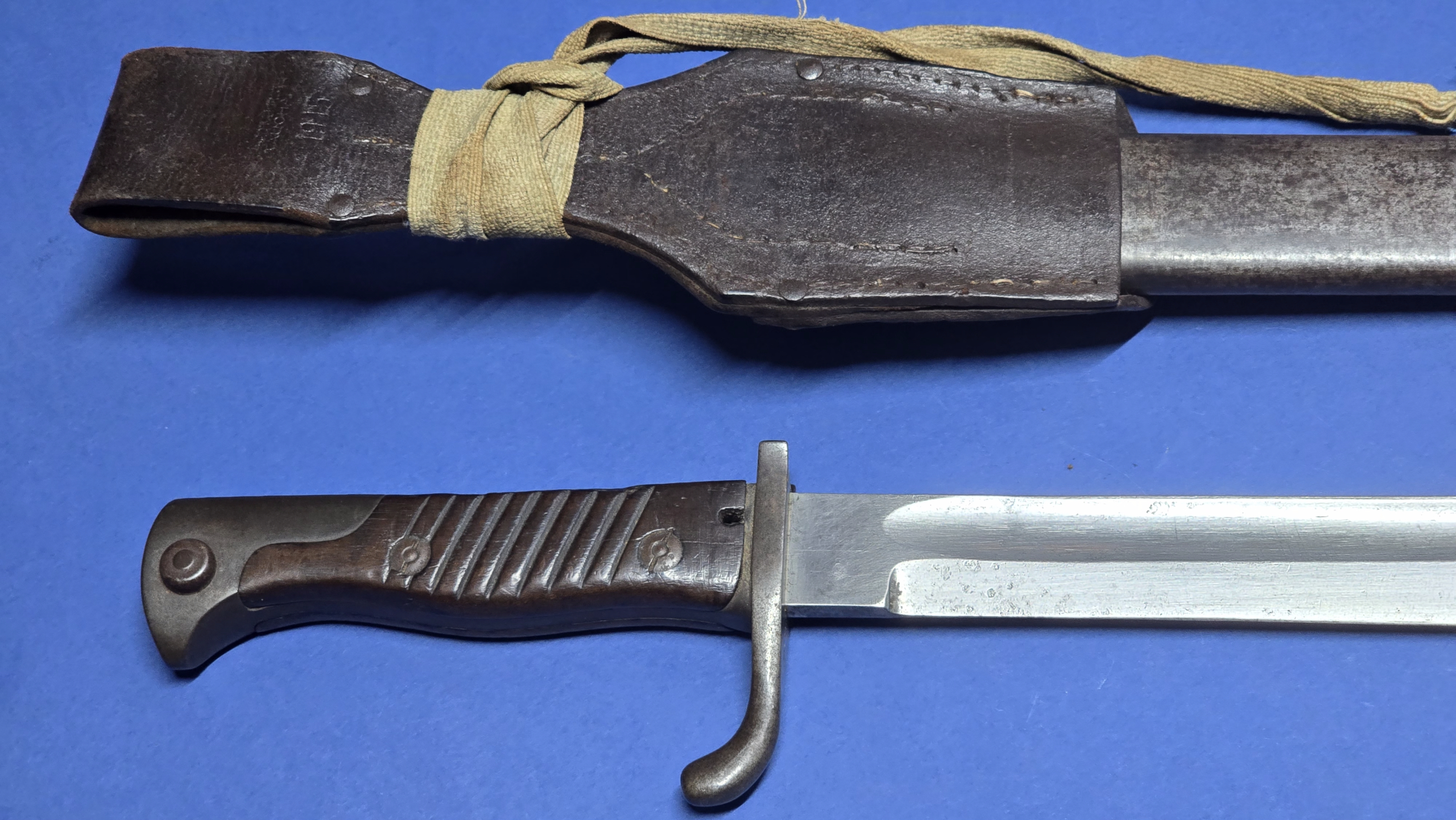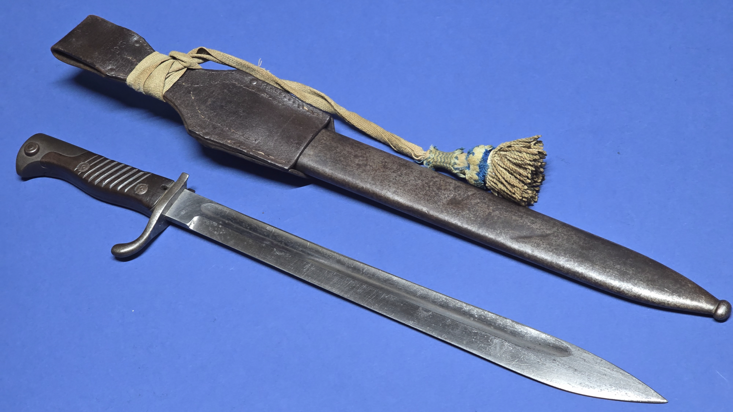 A complete and well-matched WWI German 98/05 bayonet set retaining its early high ears configuration. While showing honest service wear throughout, this example presents very well and benefits from being accompanied by a dated frog and troddel, making it an appealing and complete package.