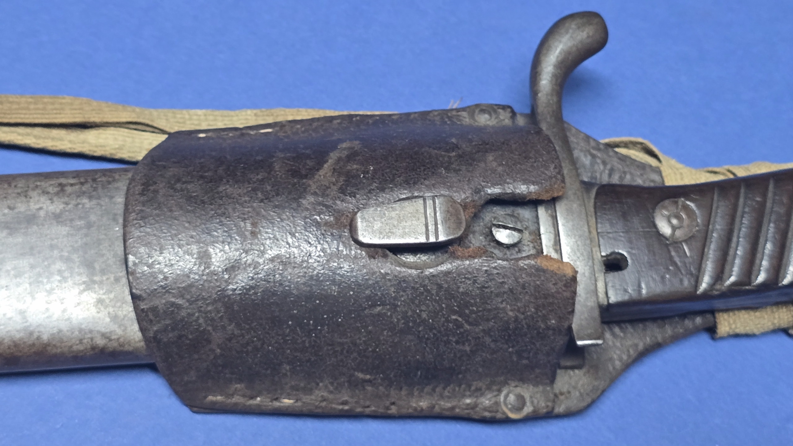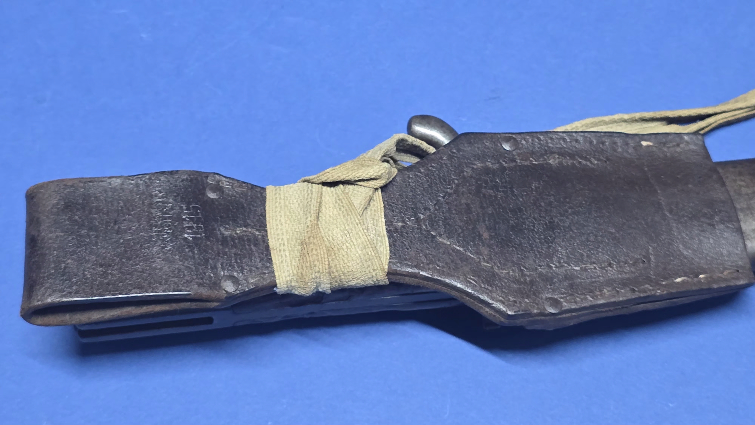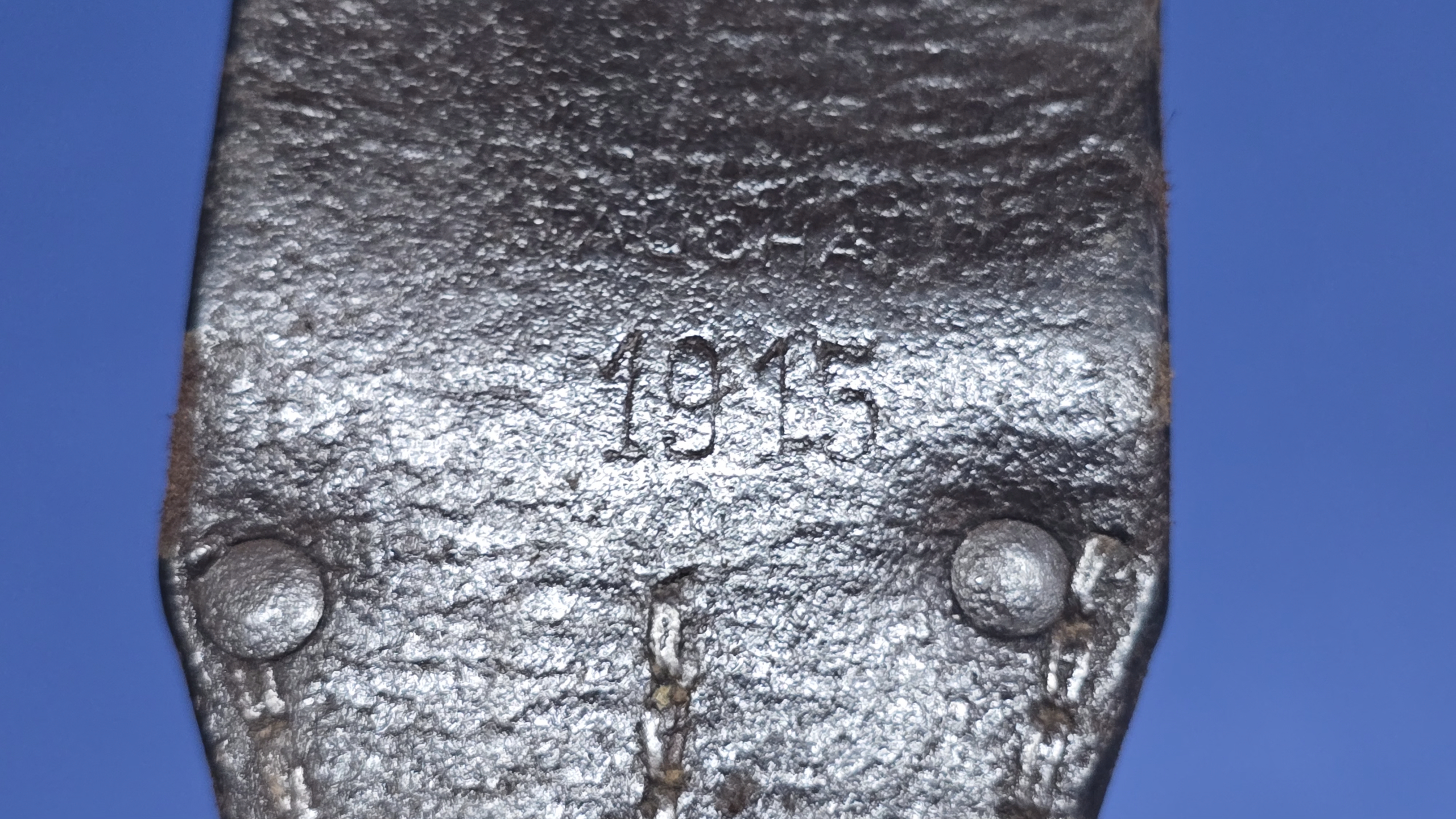 Wartime leather frog dated 1915, correctly matching the bayonet. The small leather tab above the frog stud is missing, a common occurrence on WWI frogs. Some stitching is missing on either side; however, the frog remains firmly held together by its rivets, all four of which are present and secure. The leather body remains structurally sound.